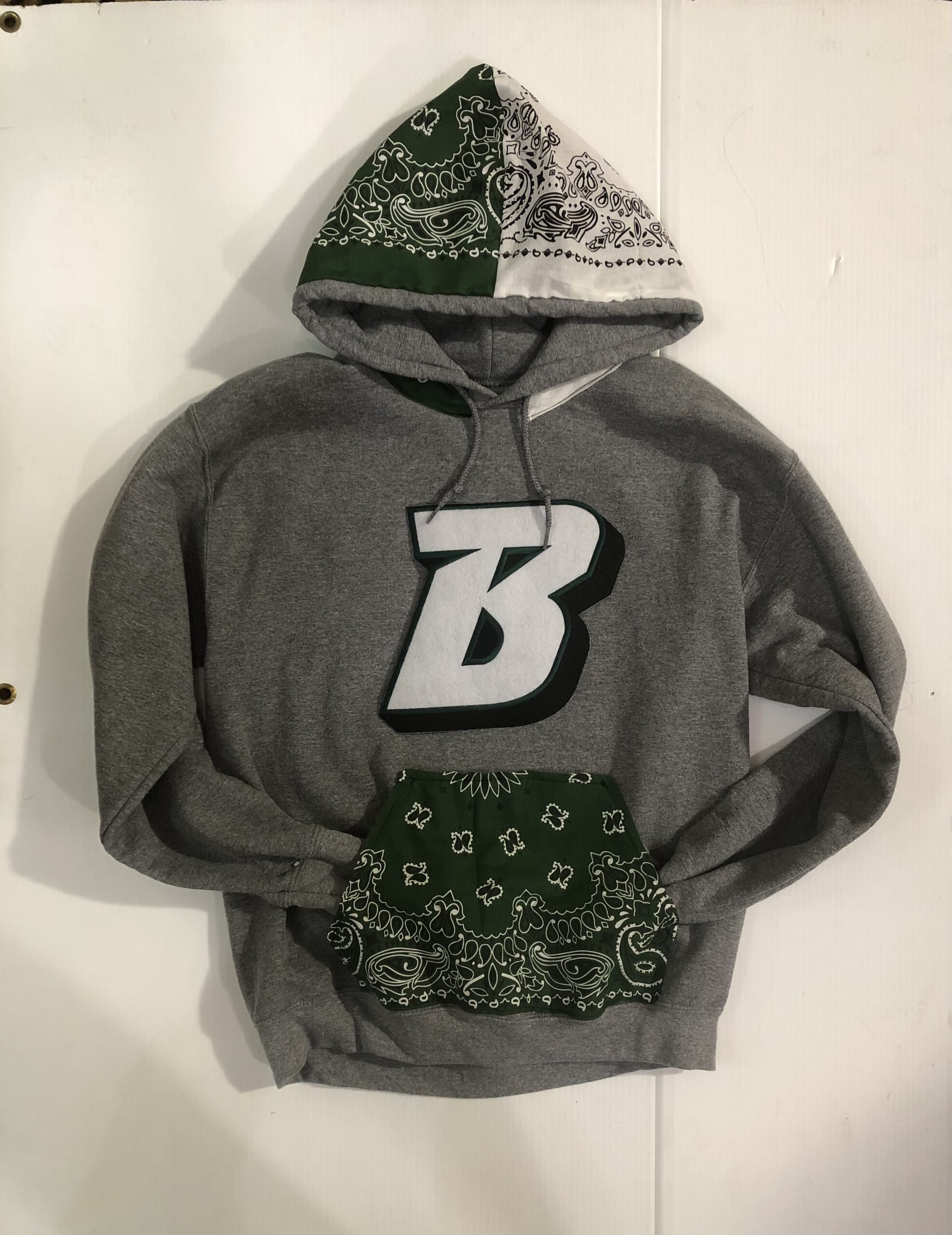 Super Soft graphite gray Hoodie with bandana pocket, split color bandana hood, banded bottom, and college logo. 50%cotton/ 50% polyester. (For other color options, call 516-364-1700!!)