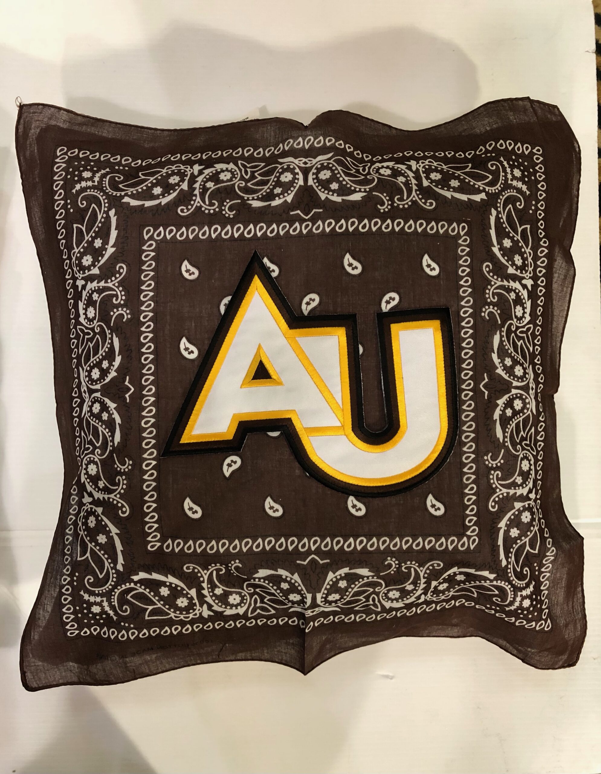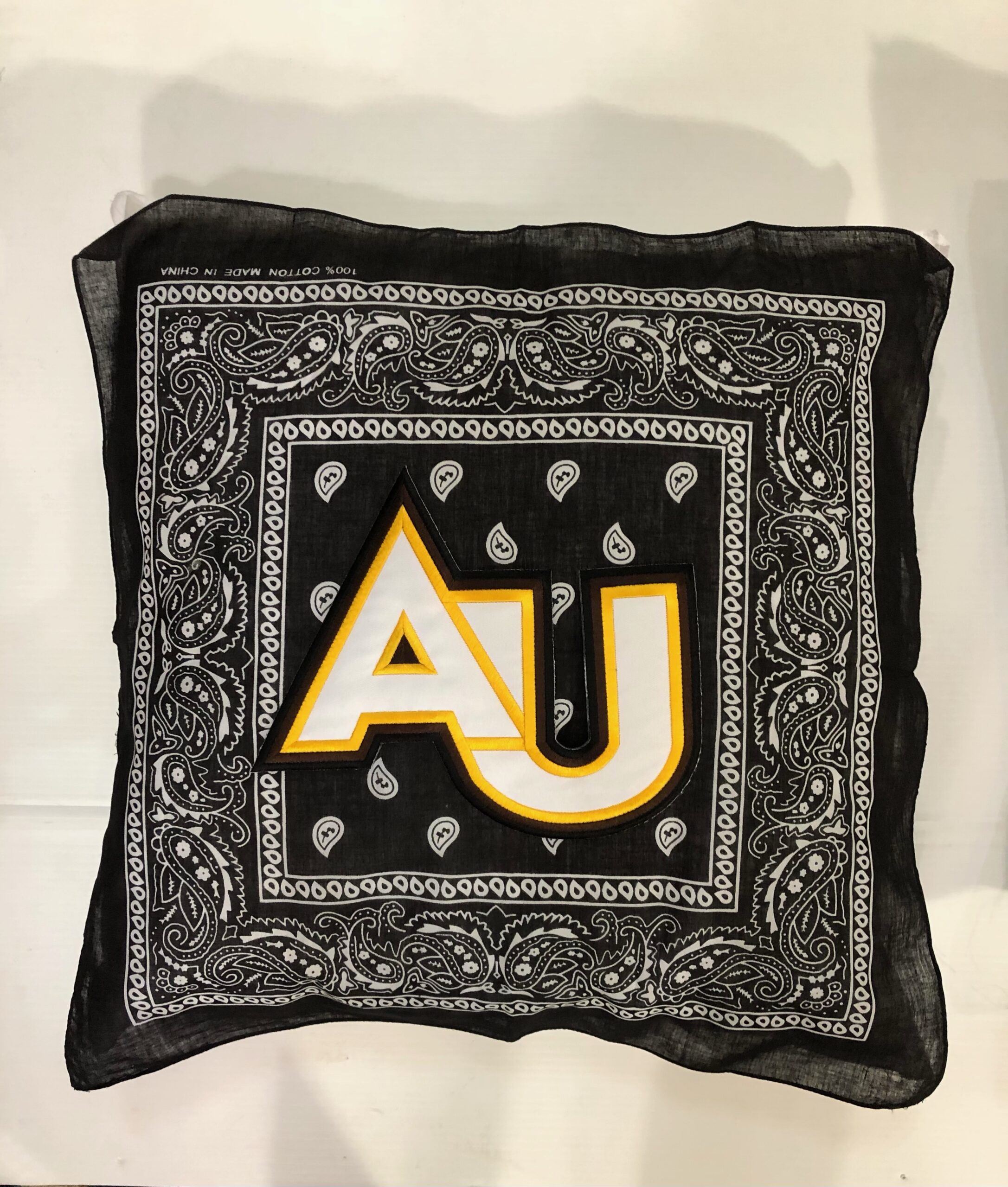 Soft 20X20 inch bandana pillow boasting your school logo or mascot, 100% polyester fiber fill, and 65% polyester/35%cotton covering.