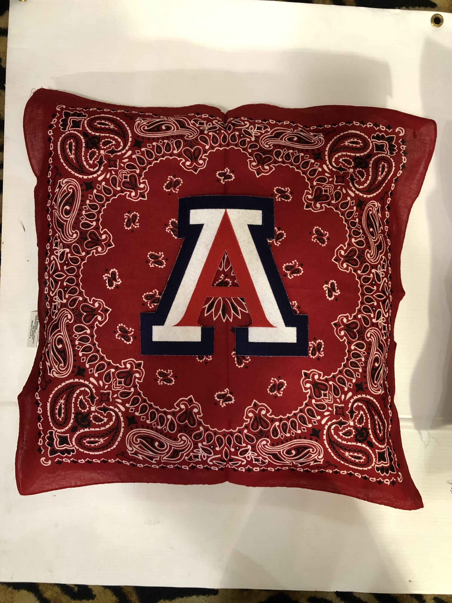 Soft 20X20 inch bandana pillow boasting your school logo or mascot, 100% polyester fiber fill, and 65% polyester/35%cotton covering.