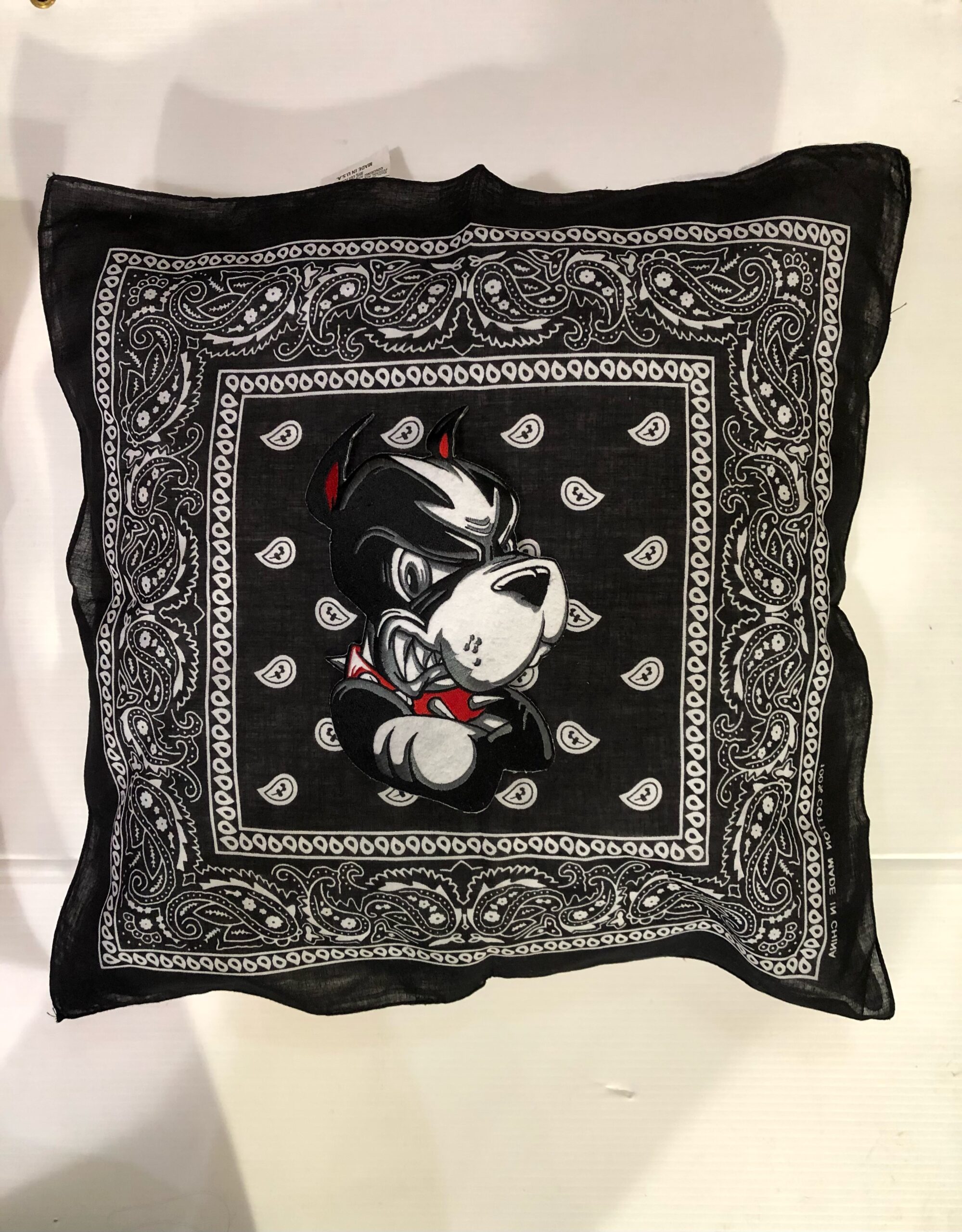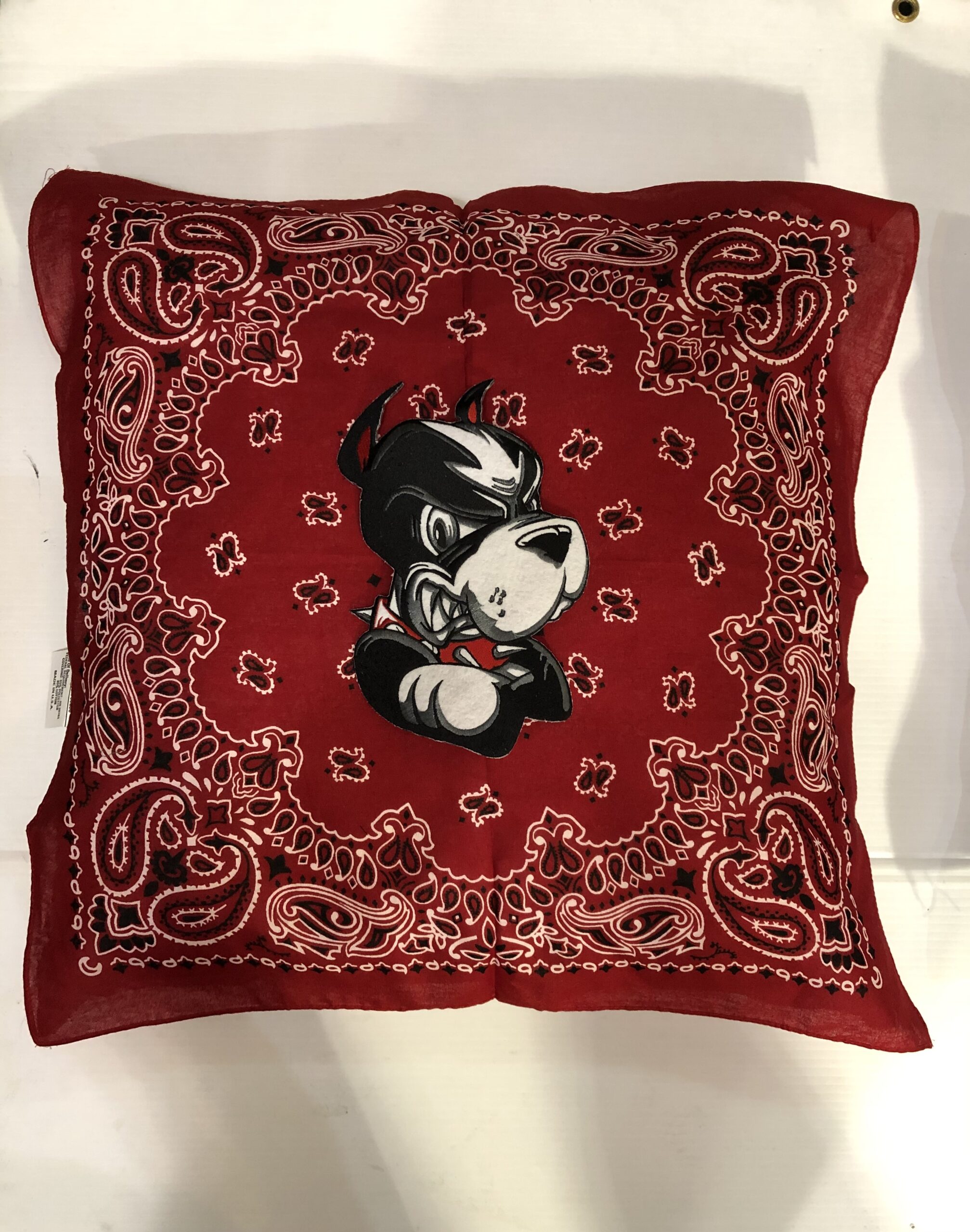 Soft 20X20 inch bandana pillow boasting your school logo or mascot, 100% polyester fiber fill, and 65% polyester/35%cotton covering.