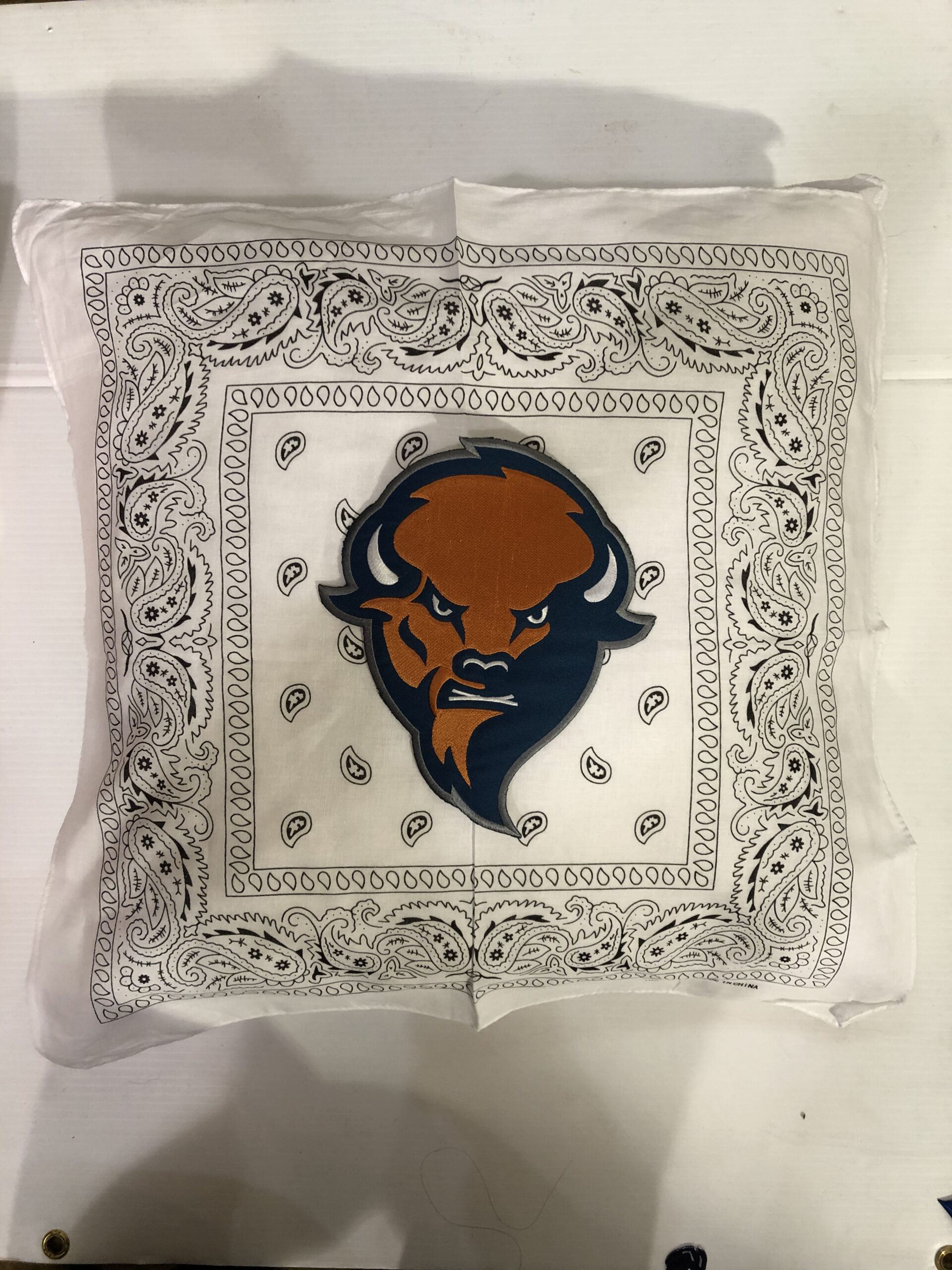 Soft 20X20 inch bandana pillow boasting your school logo or mascot, 100% polyester fiber fill, and 65% polyester/35%cotton covering.