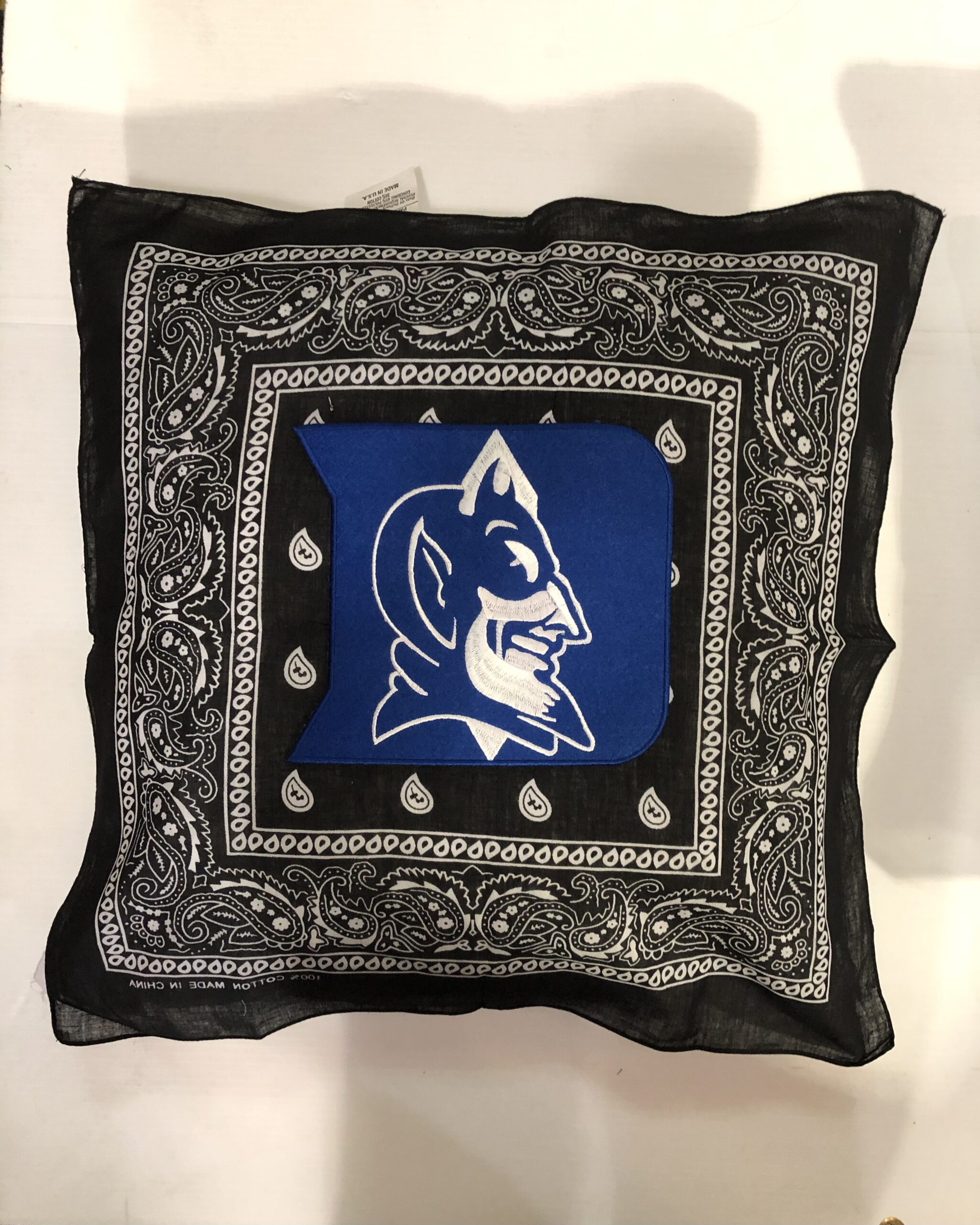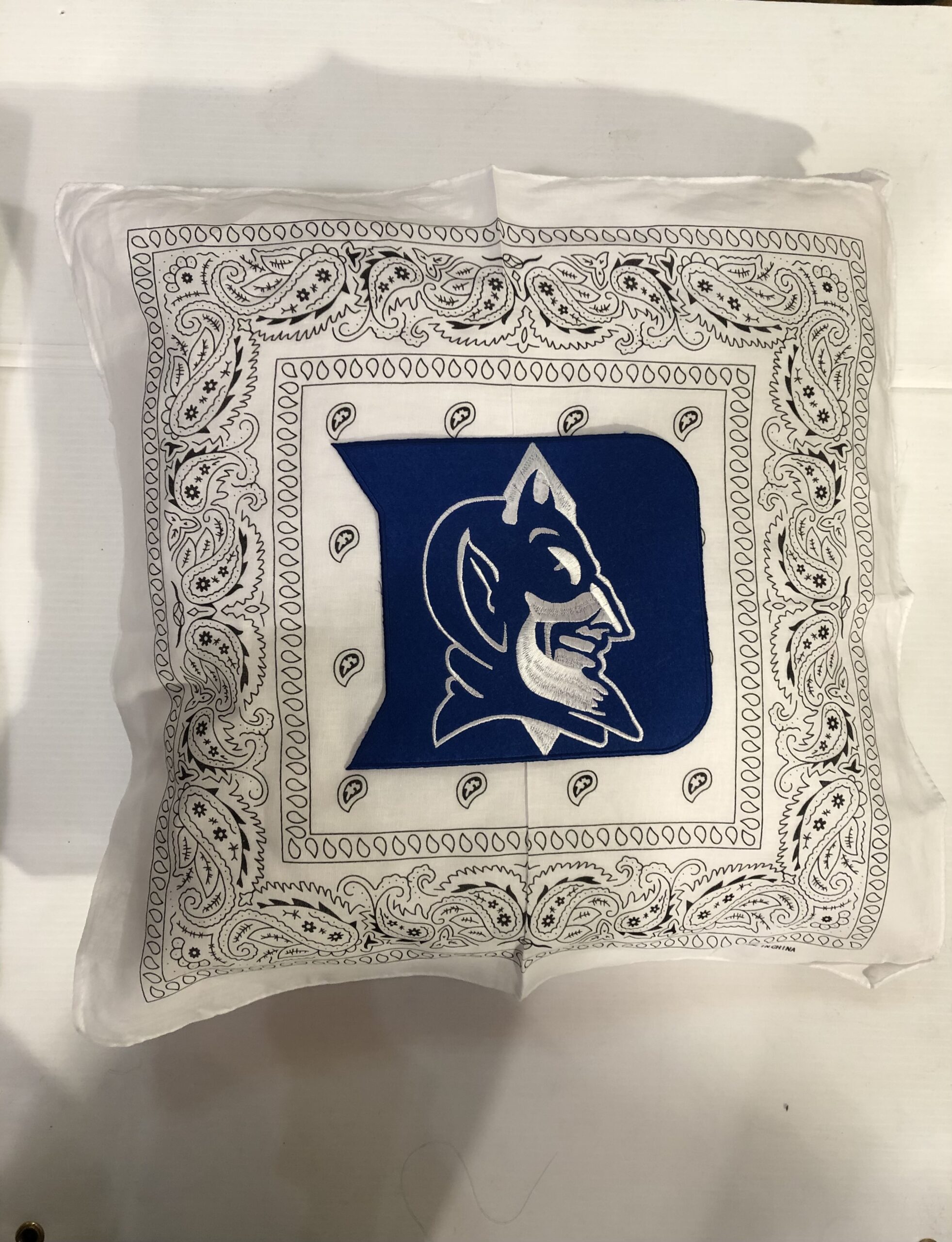 Soft 20X20 inch bandana pillow boasting your school logo or mascot, 100% polyester fiber fill, and 65% polyester/35%cotton covering.