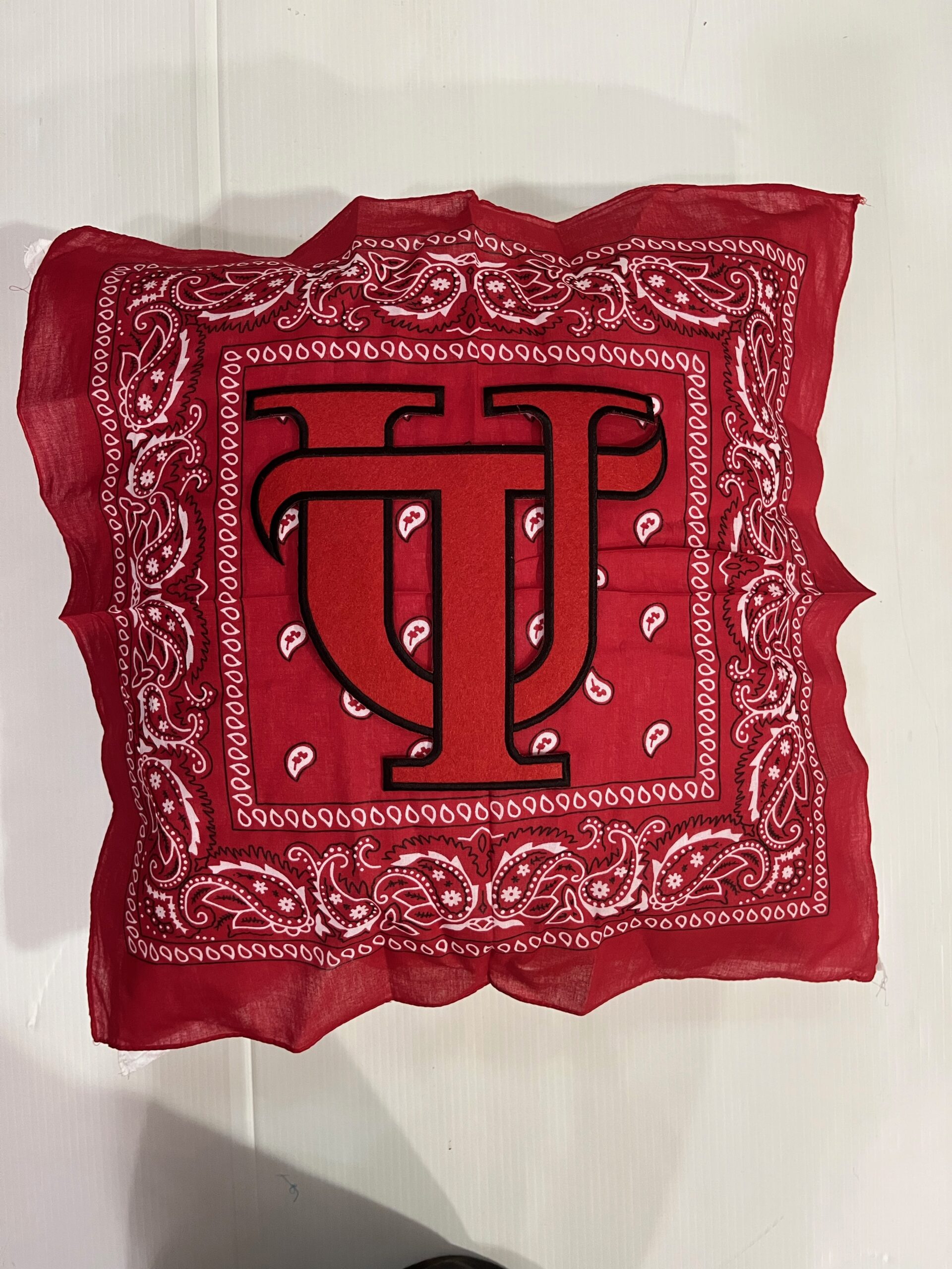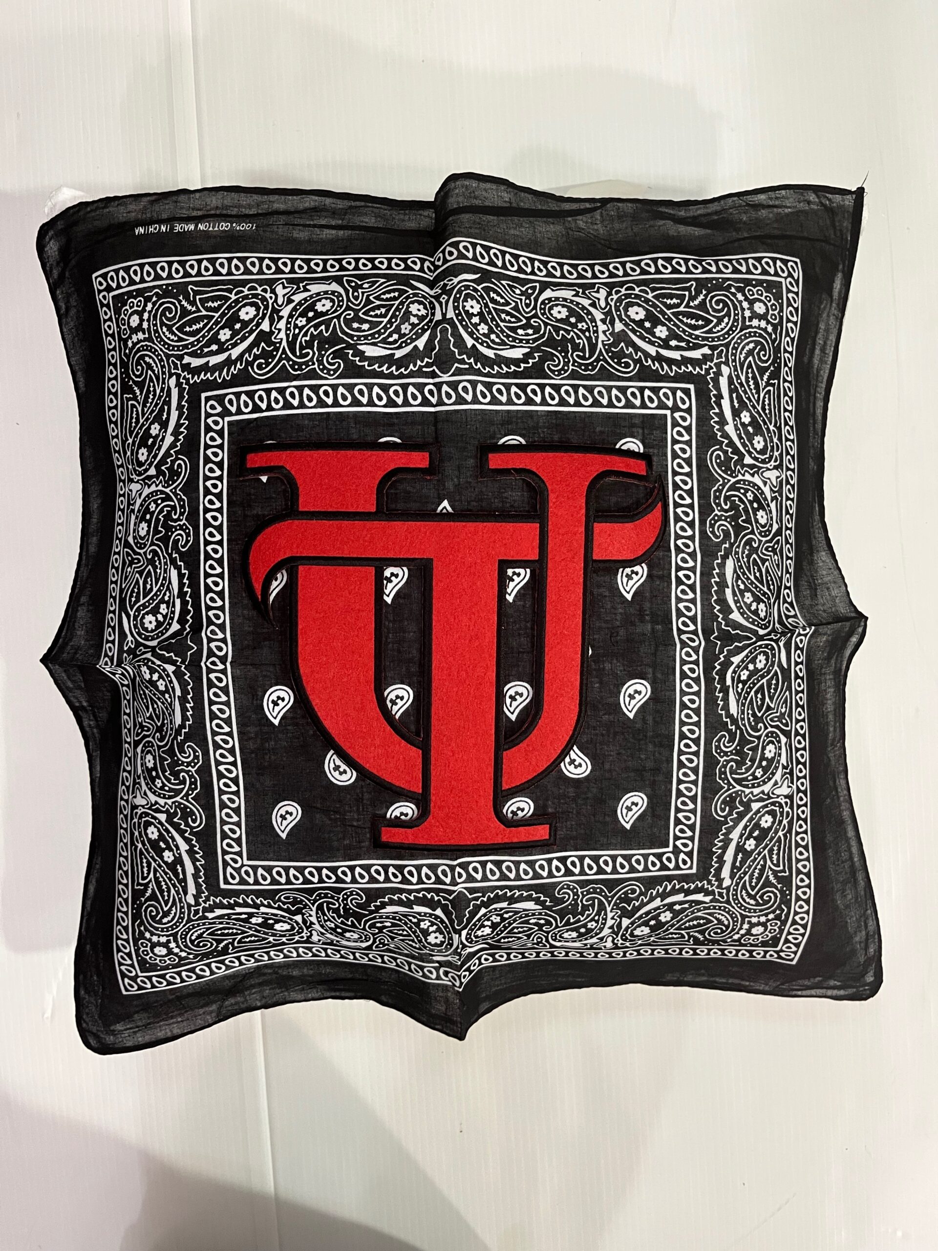 Soft 20X20 inch bandana pillow boasting your school logo or mascot, 100% polyester fiber fill, and 65% polyester/35%cotton covering.