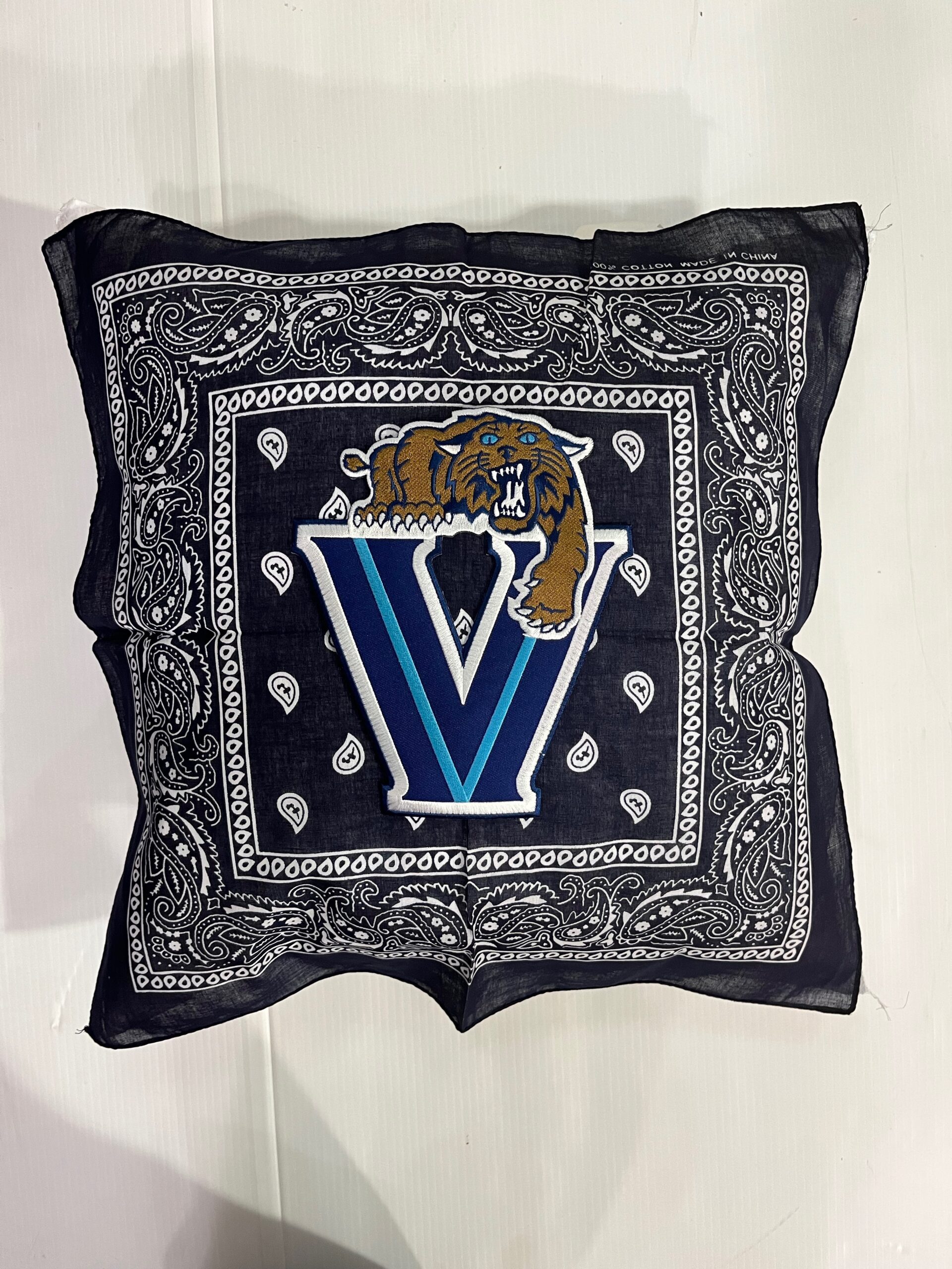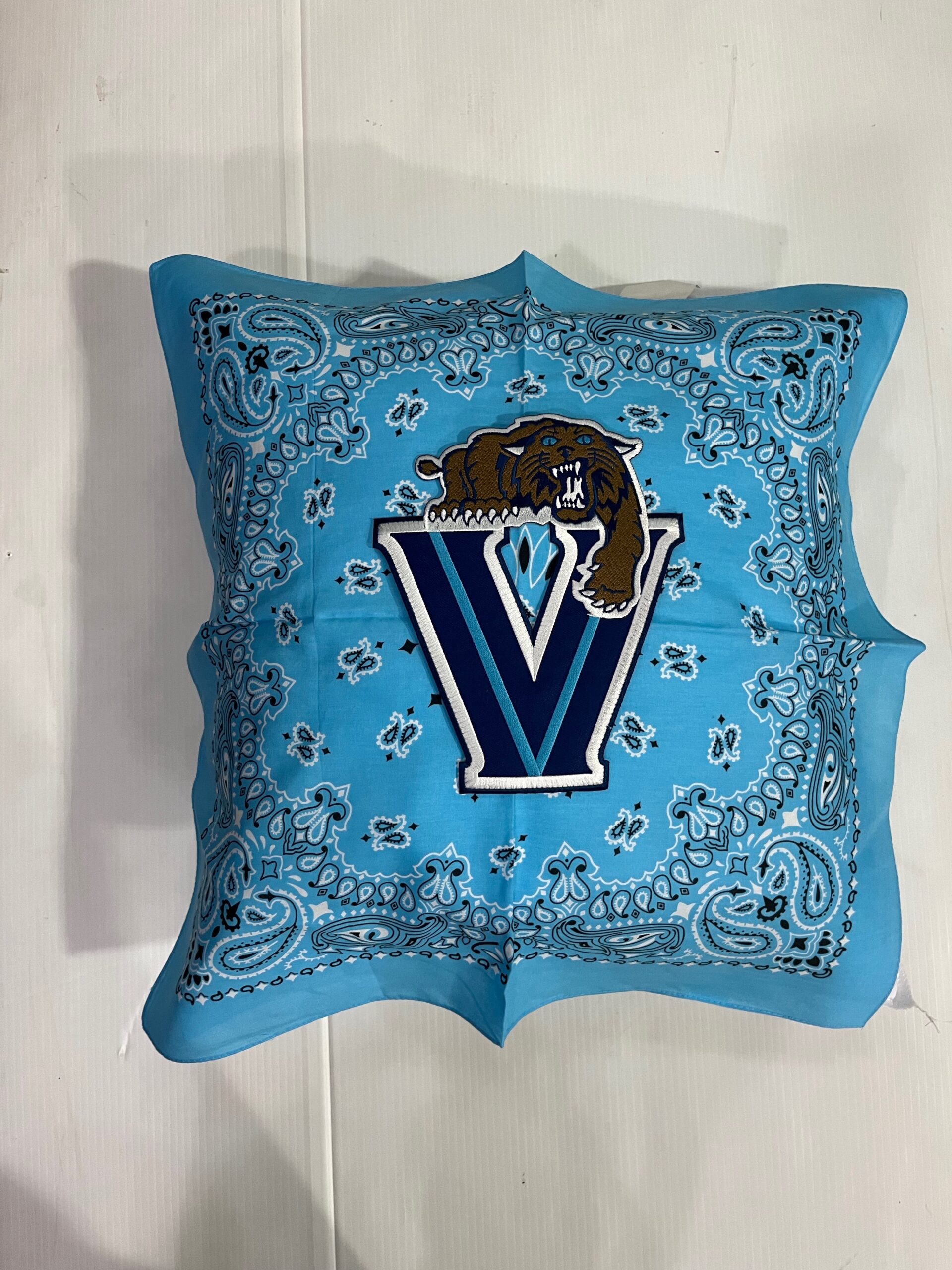 Soft 20X20 inch bandana pillow boasting your school logo or mascot, 100% polyester fiber fill, and 65% polyester/35%cotton covering.
