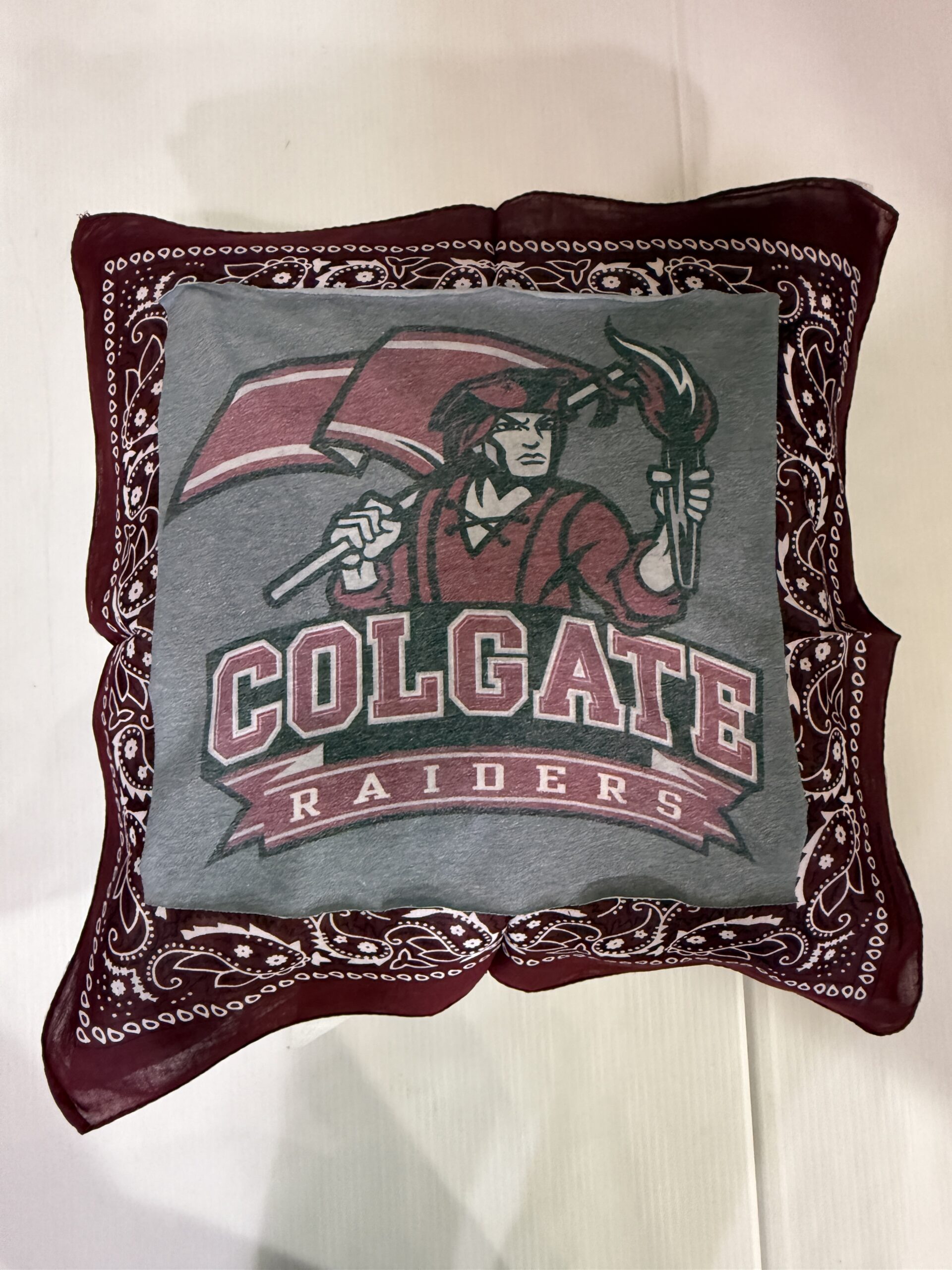Soft 20X20 inch bandana pillow with vintage tee square, 100% polyester fiber fill, and 65% polyester/35%cotton covering.