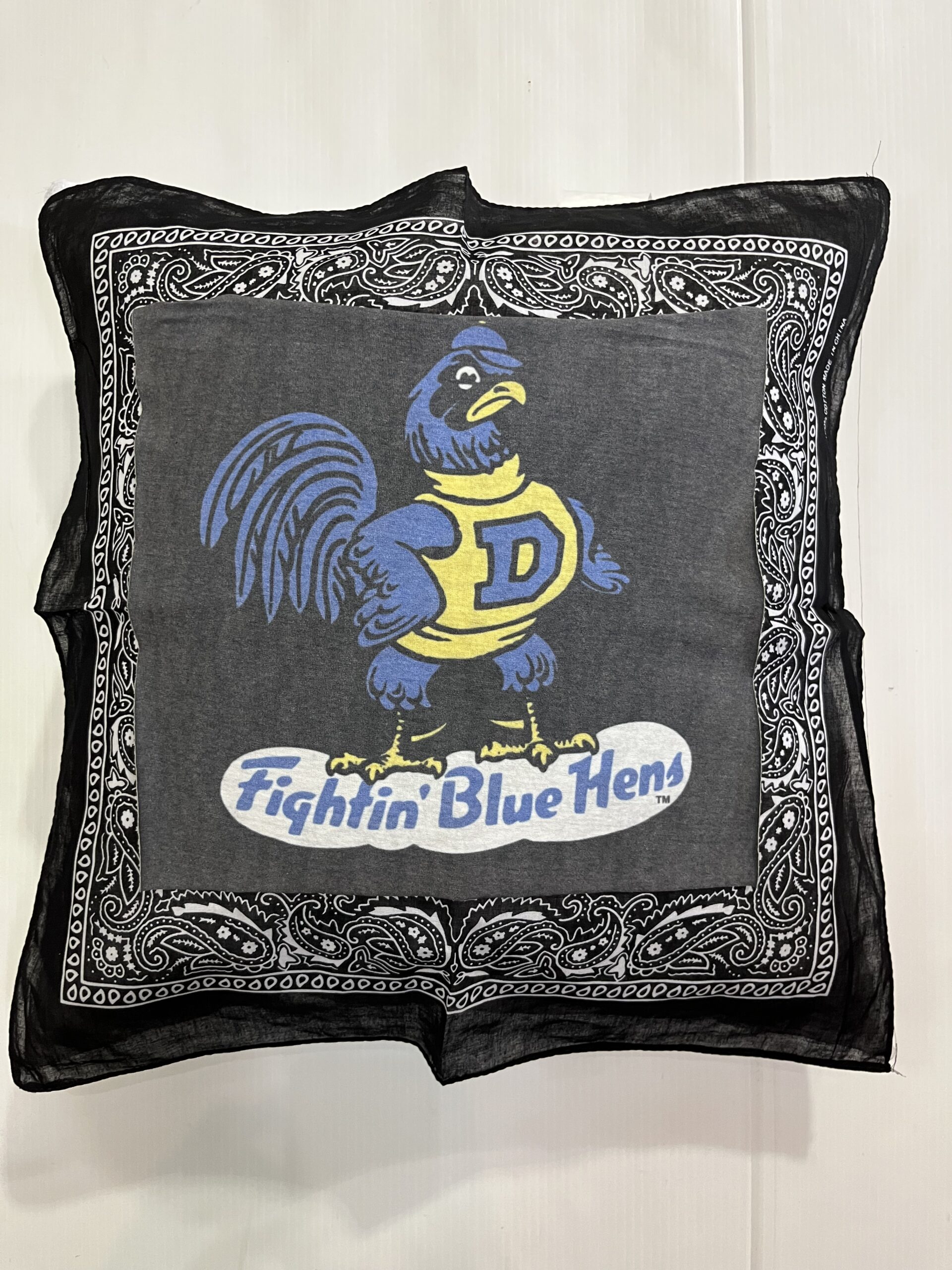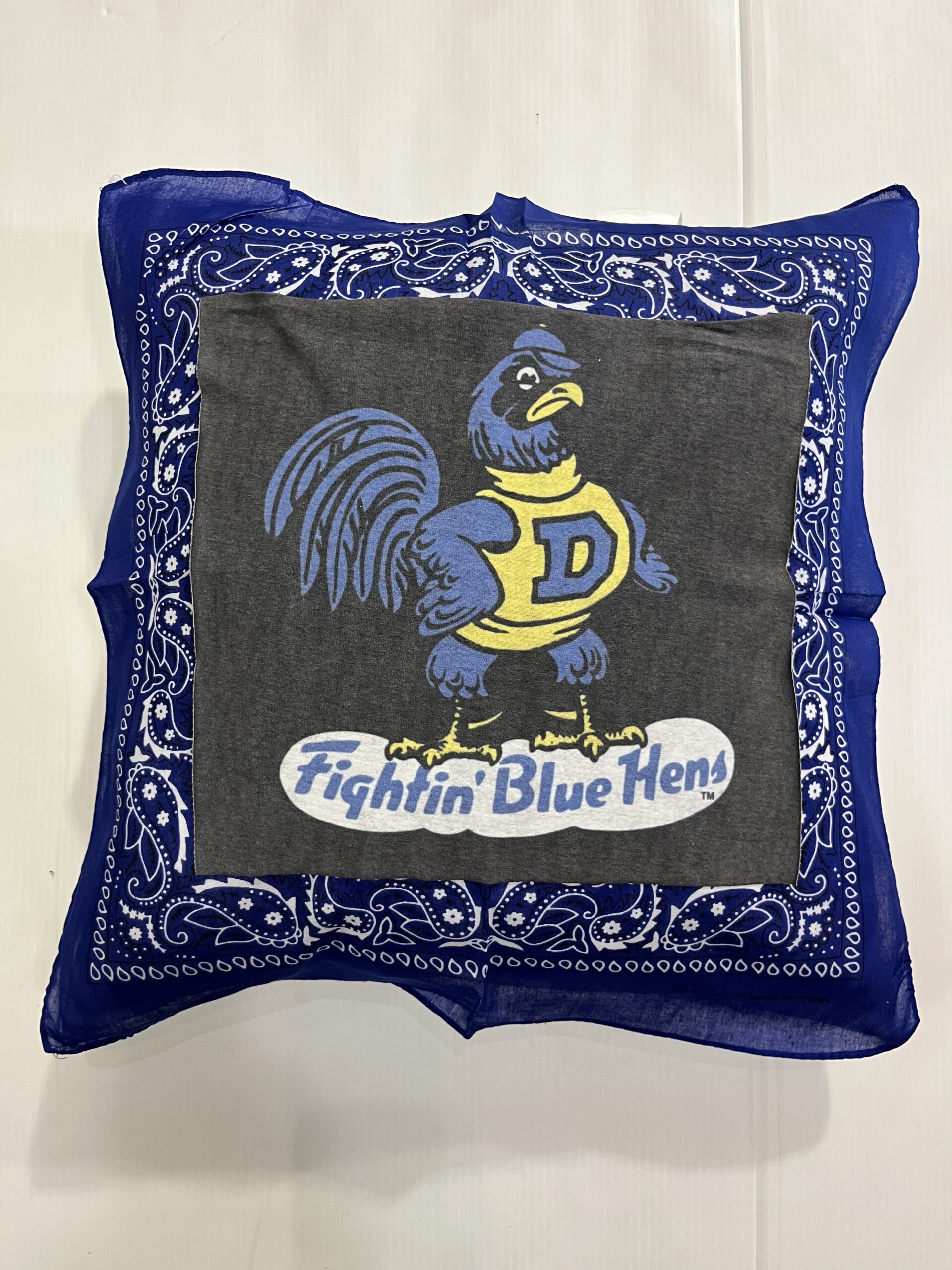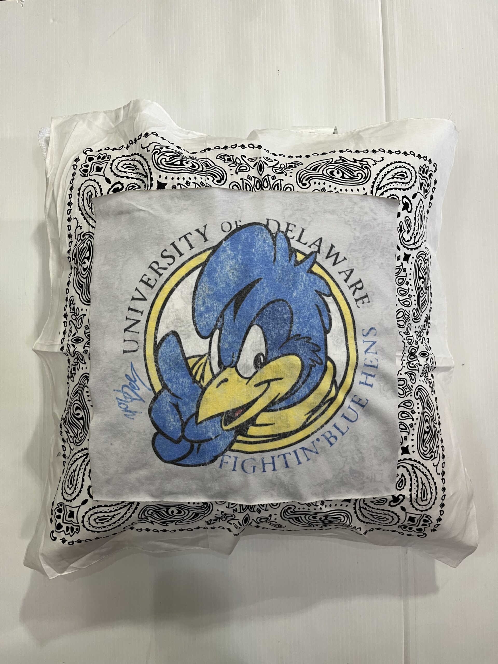 Soft 20X20 inch bandana pillow with vintage tee square, 100% polyester fiber fill, and 65% polyester/35%cotton covering.