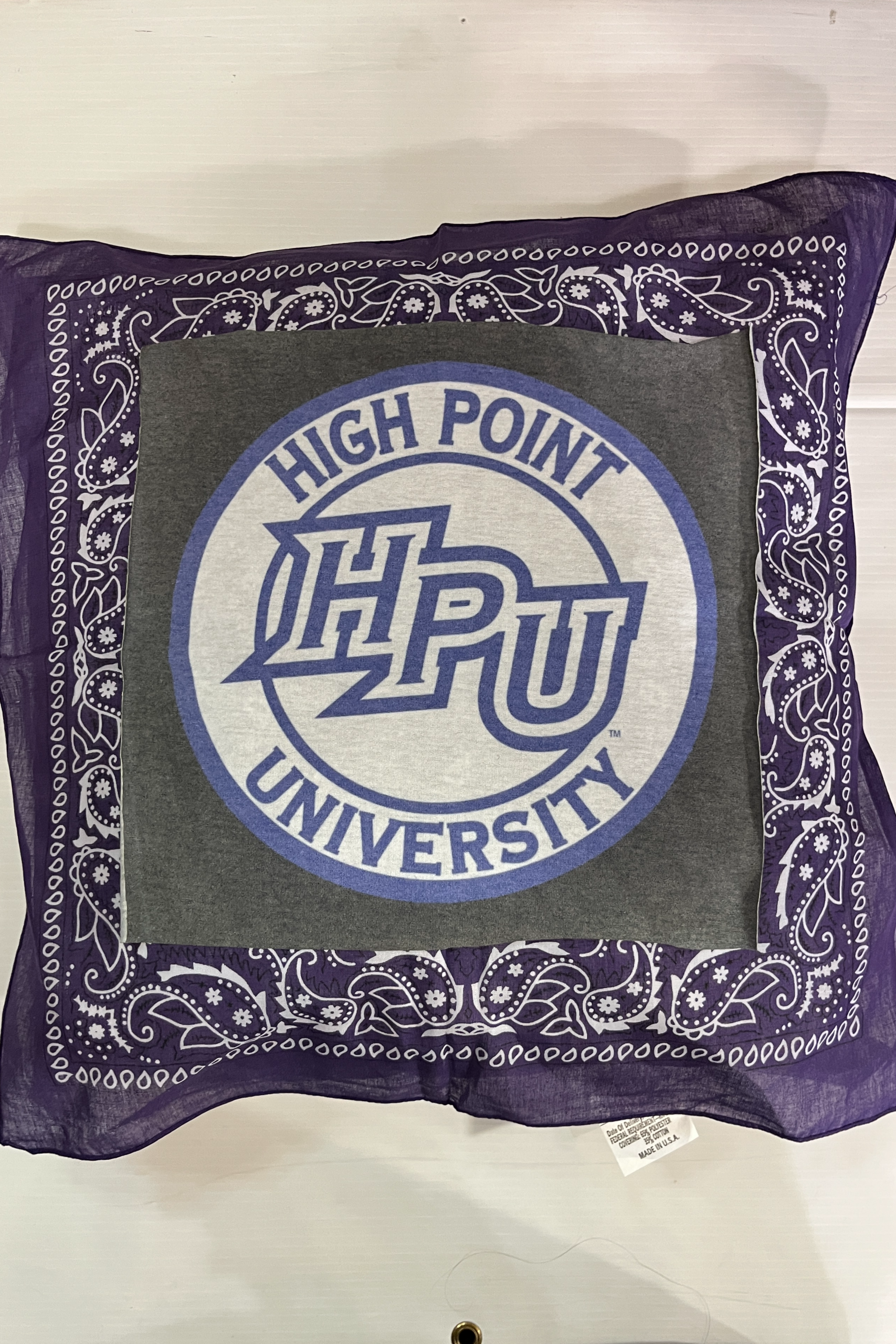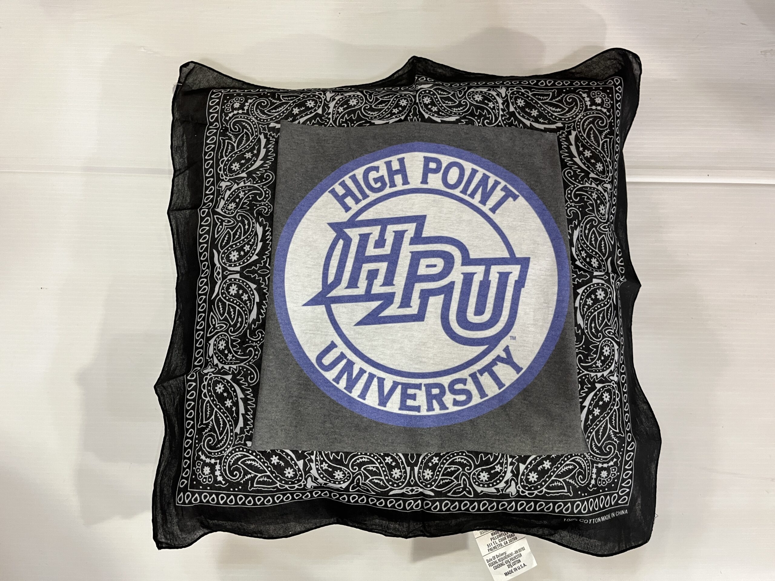 Soft 20X20 inch bandana pillow with vintage tee square, 100% polyester fiber fill, and 65% polyester/35%cotton covering.