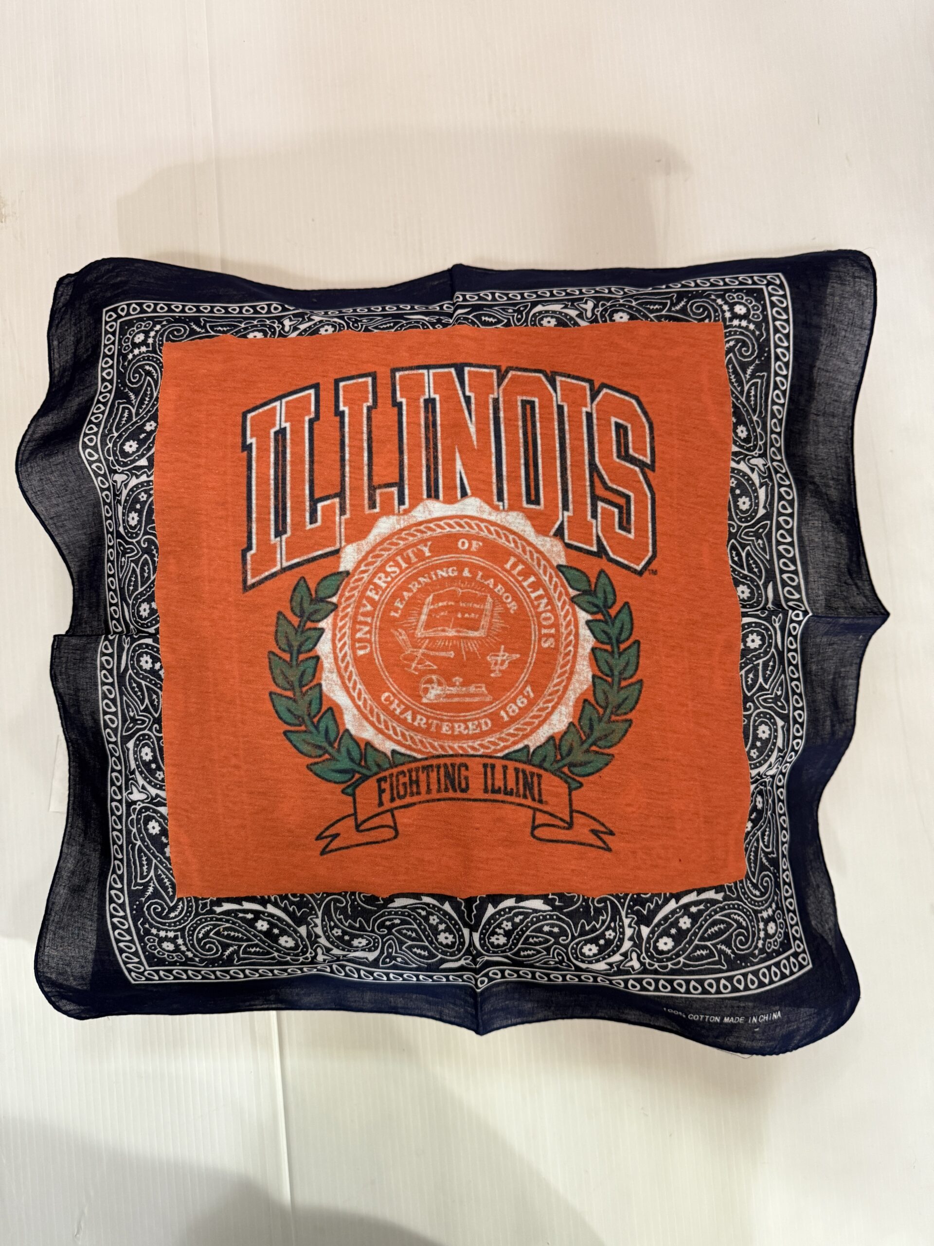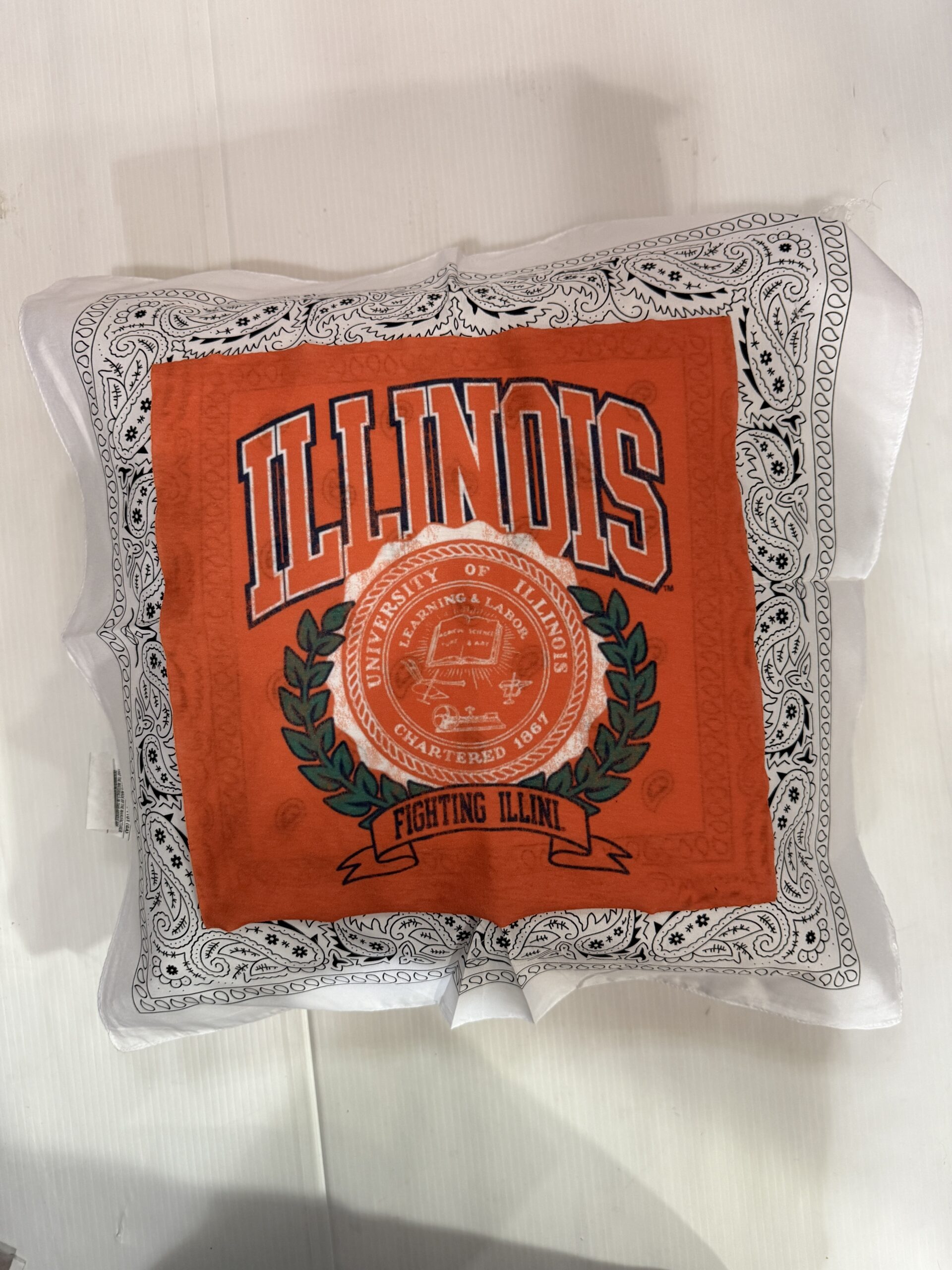 Soft 20X20 inch bandana pillow with vintage tee square, 100% polyester fiber fill, and 65% polyester/35%cotton covering.