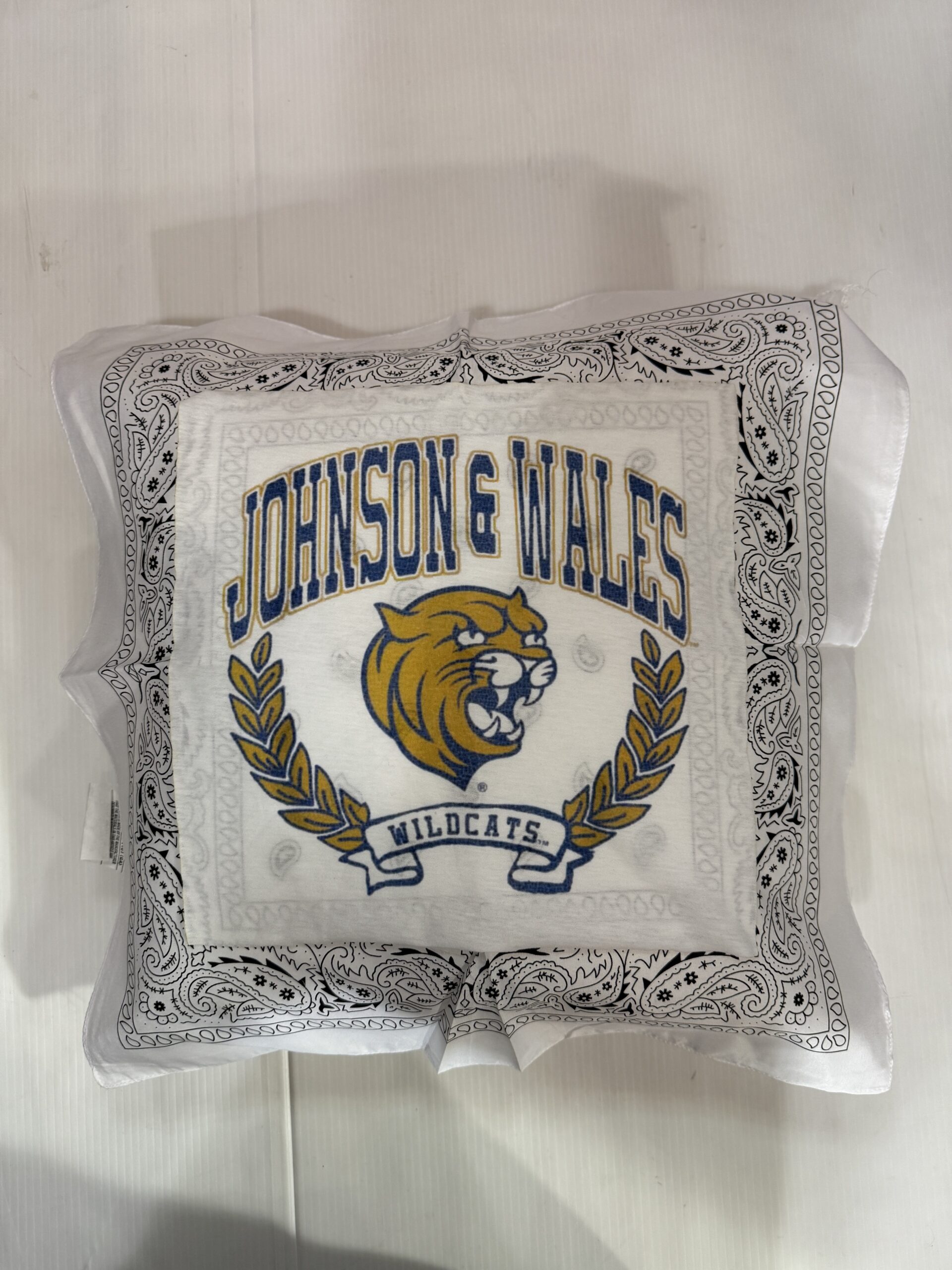 Soft 20X20 inch bandana pillow with vintage tee square, 100% polyester fiber fill, and 65% polyester/35%cotton covering.