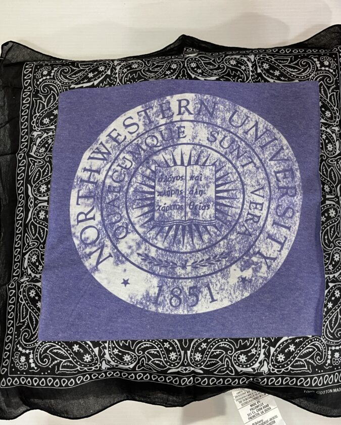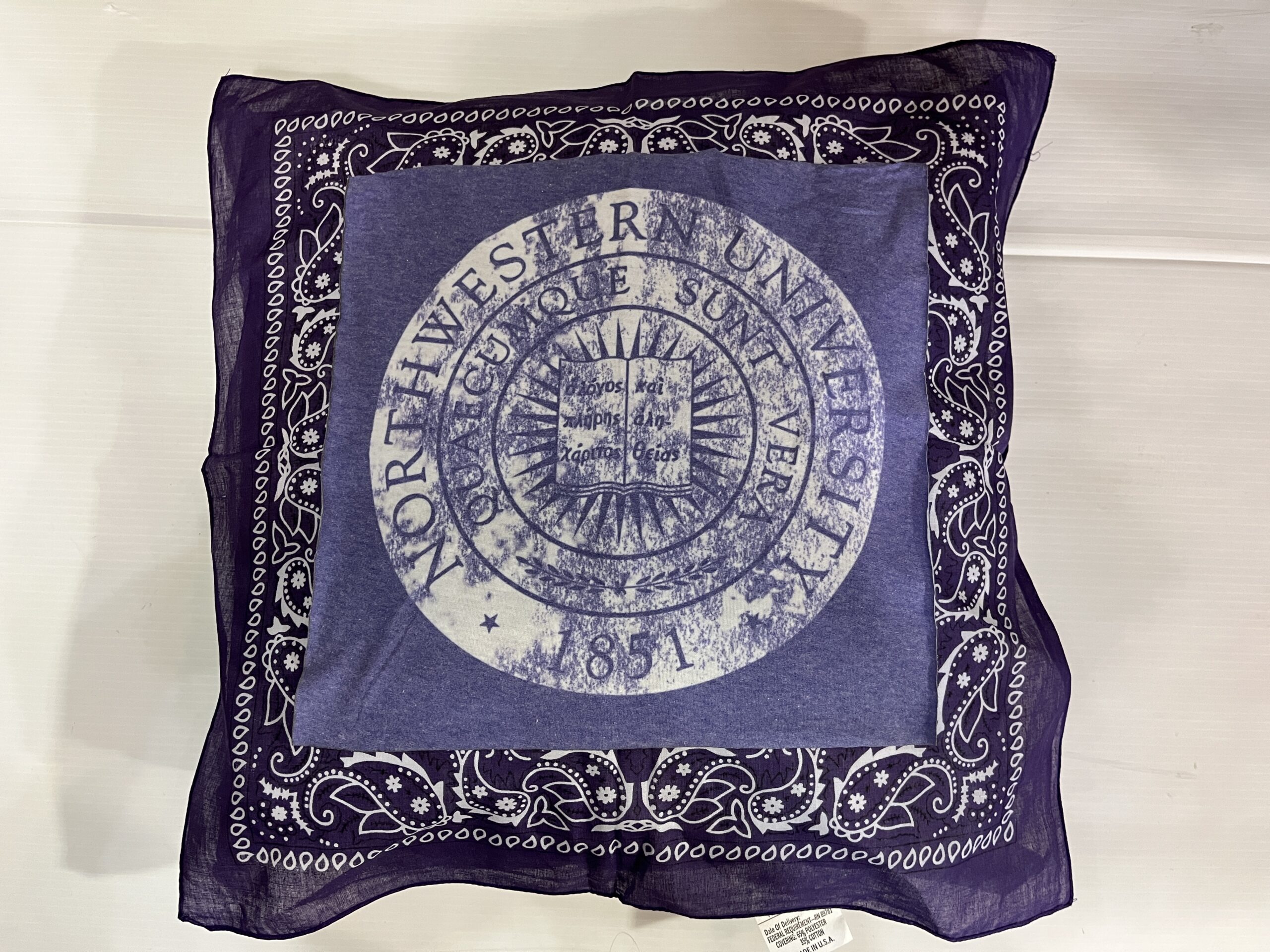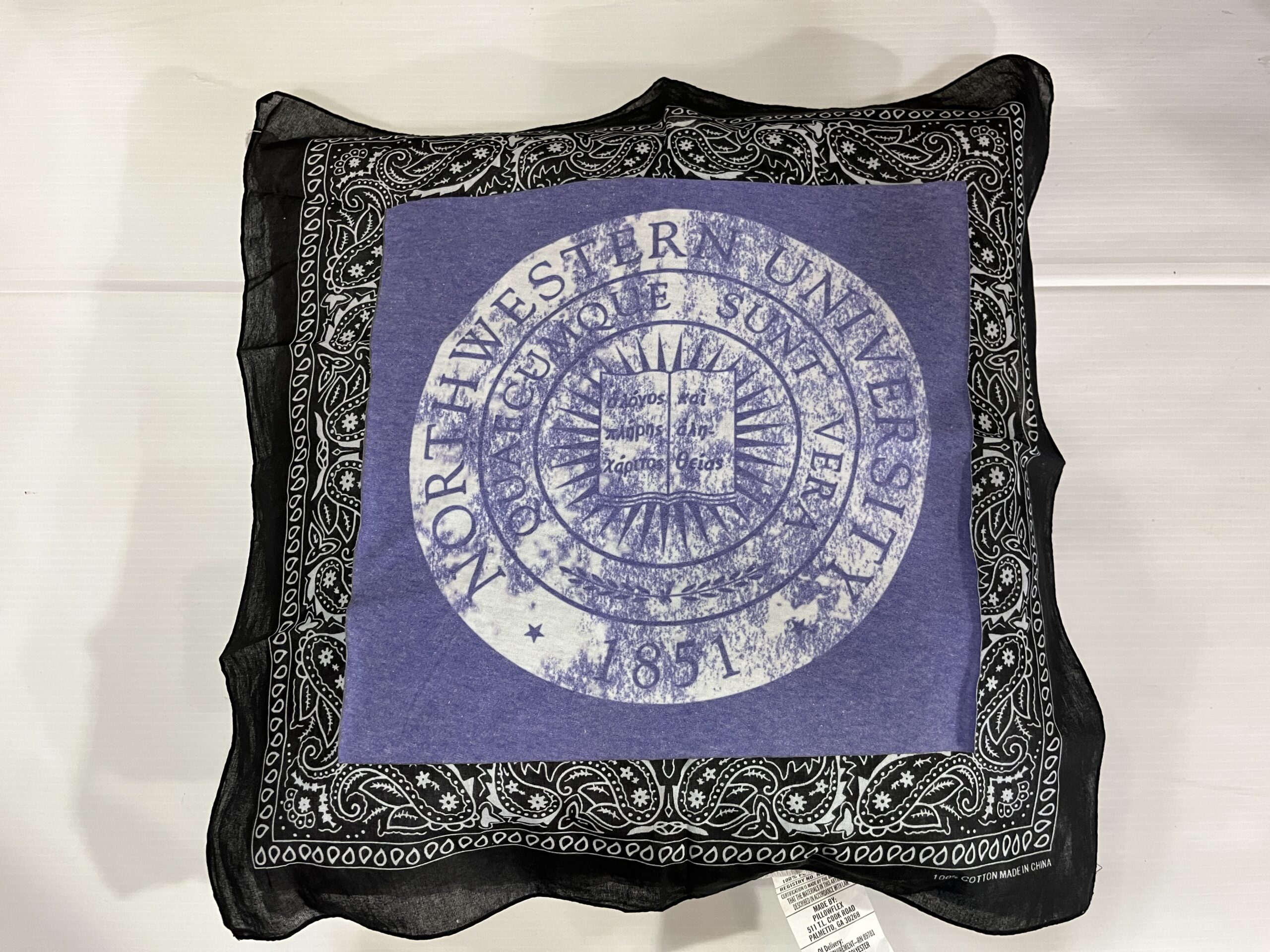Soft 20X20 inch bandana pillow with vintage tee square, 100% polyester fiber fill, and 65% polyester/35%cotton covering.