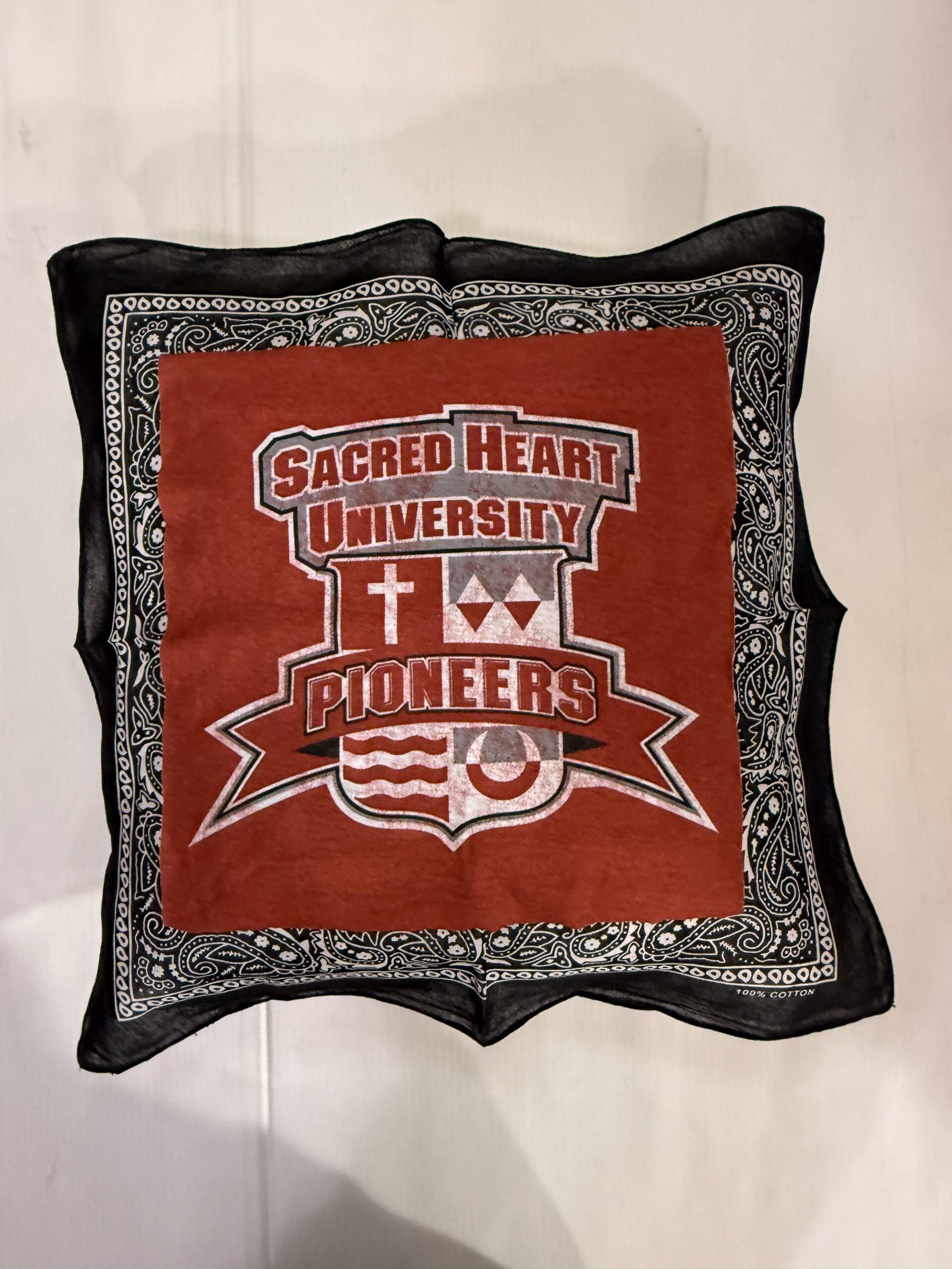 Be the first to review “Bandana Pillow With Vintage Tee Square – Sacred Heart SHU shield”