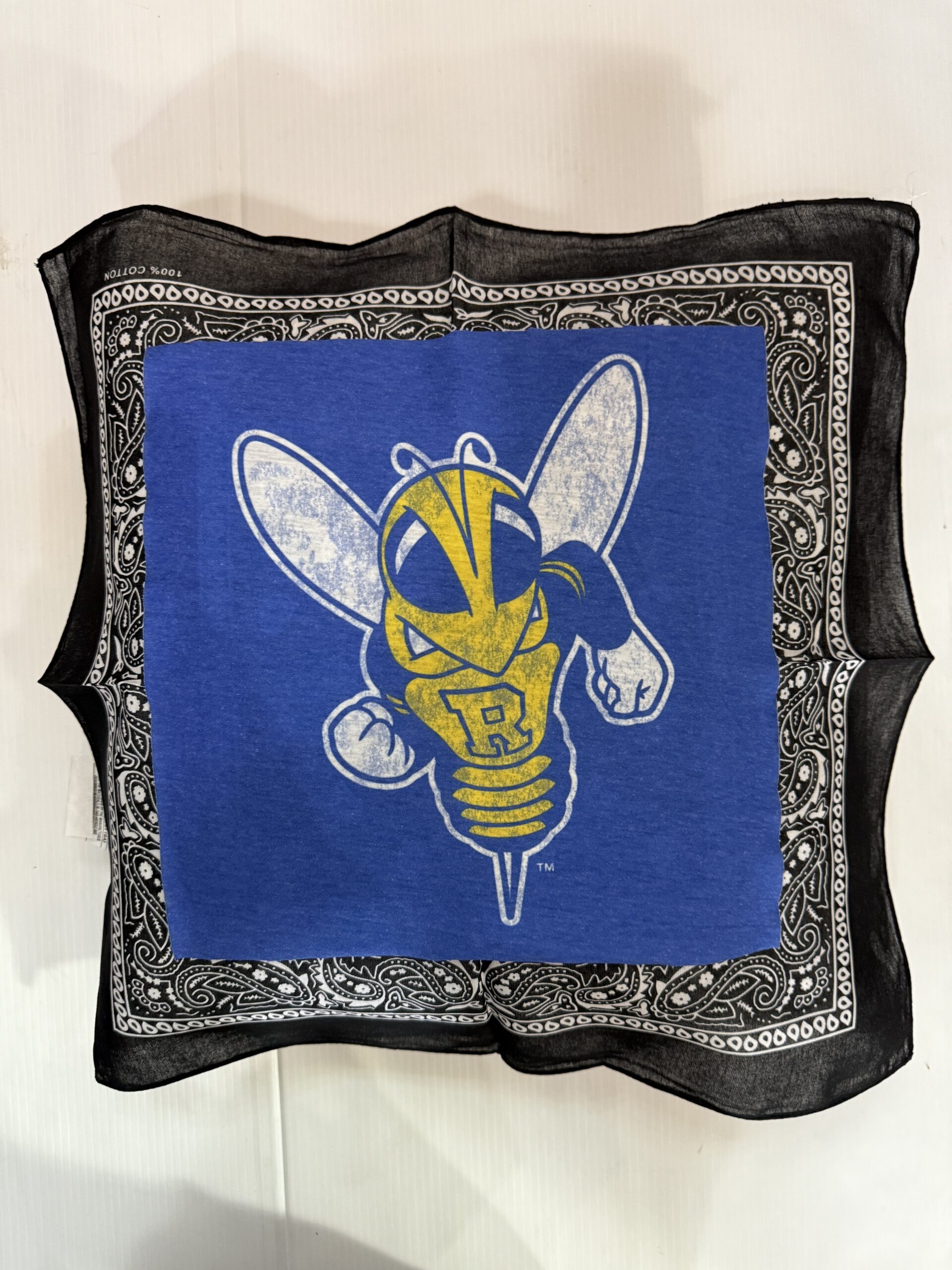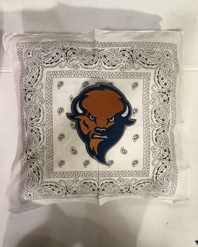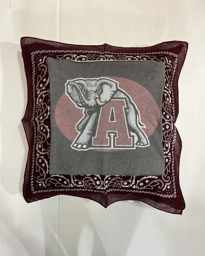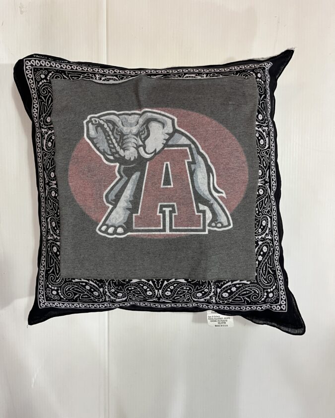 Soft 20X20 inch bandana pillow with vintage tee square, 100% polyester fiber fill, and 65% polyester/35%cotton covering.