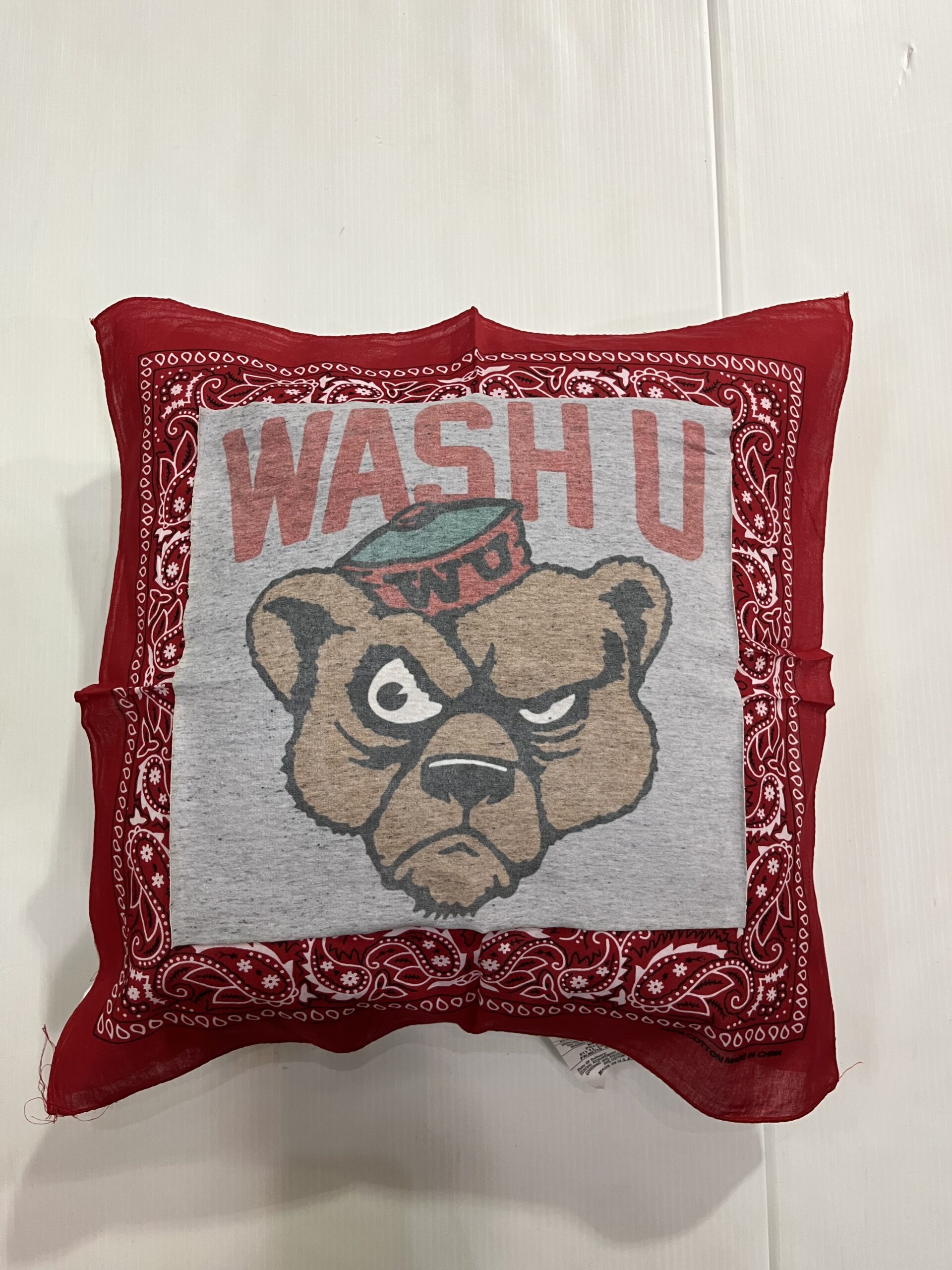 Soft 20X20 inch bandana pillow with vintage tee square, 100% polyester fiber fill, and 65% polyester/35%cotton covering.