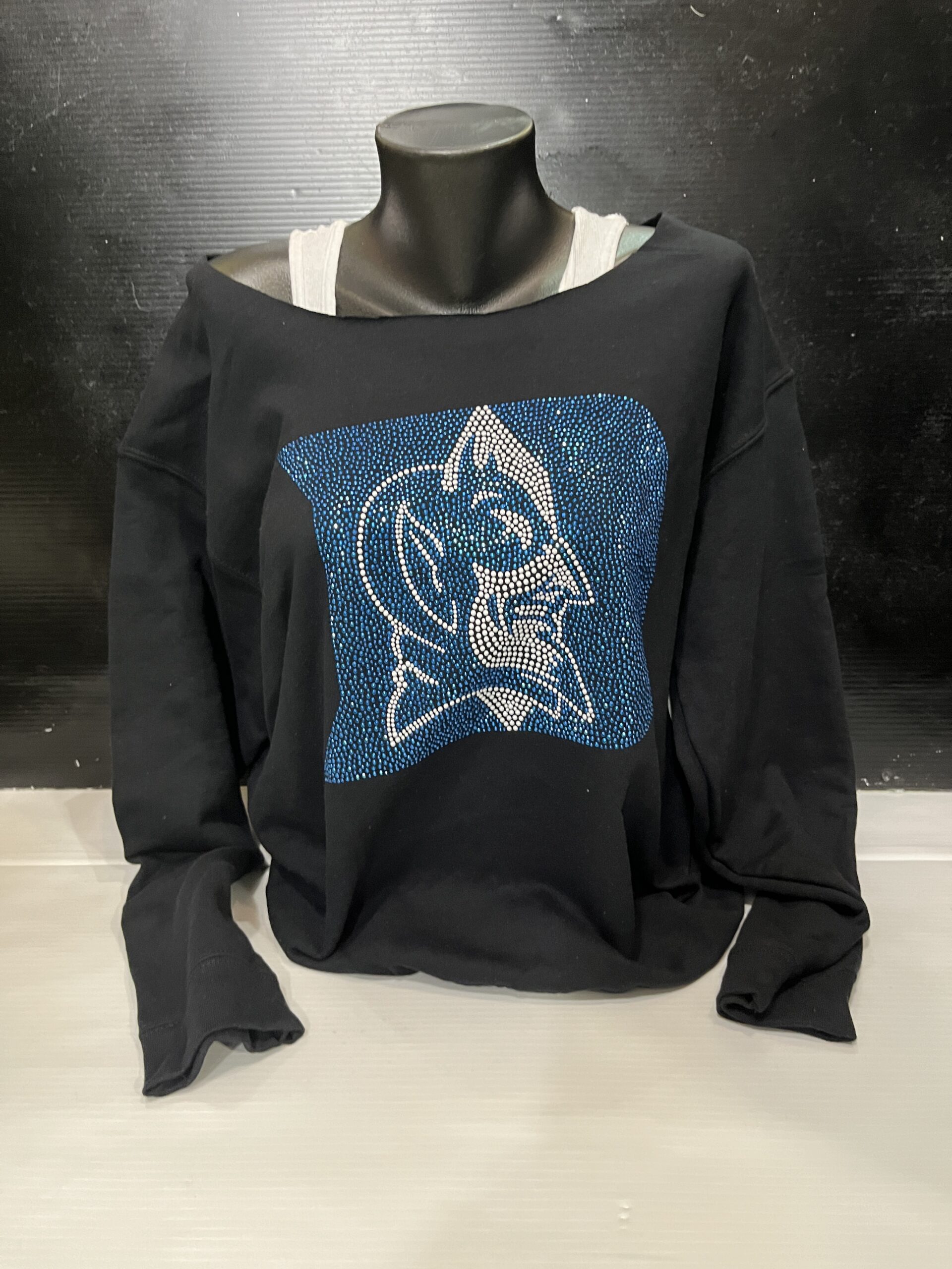 Soft fleece off the shoulder sweatshirt with bling logo