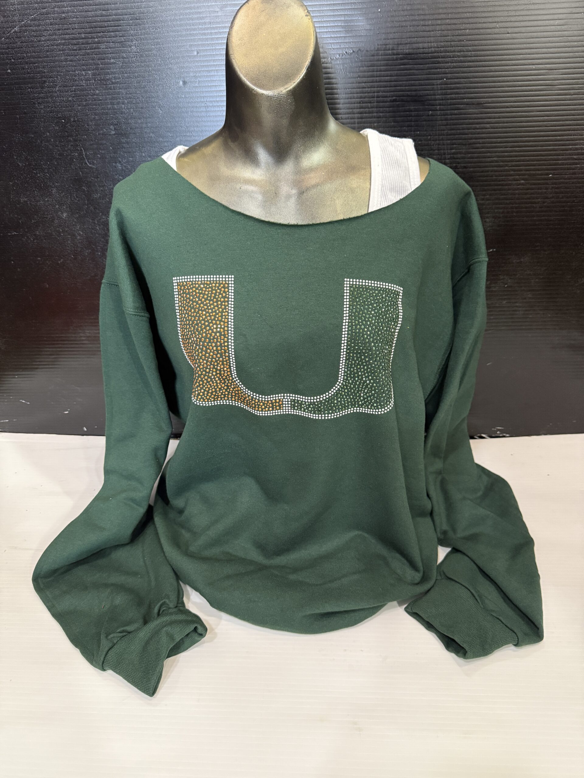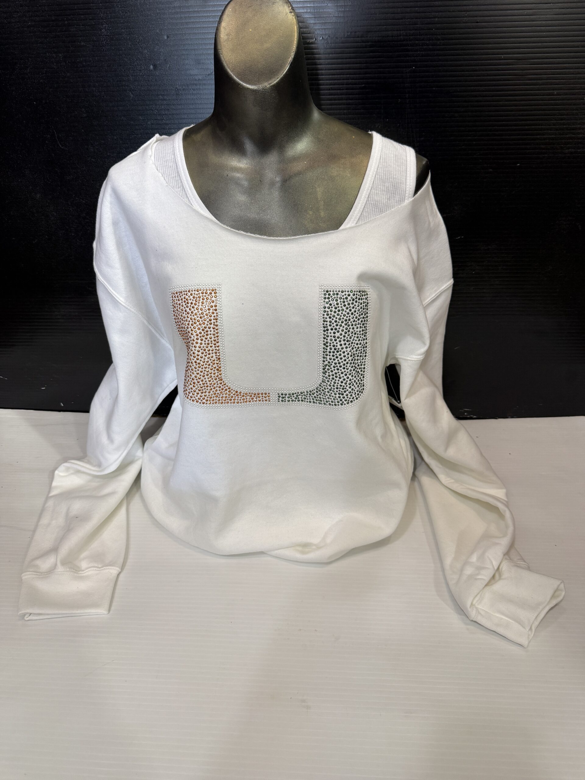 Soft fleece off the shoulder sweatshirt with bling logo