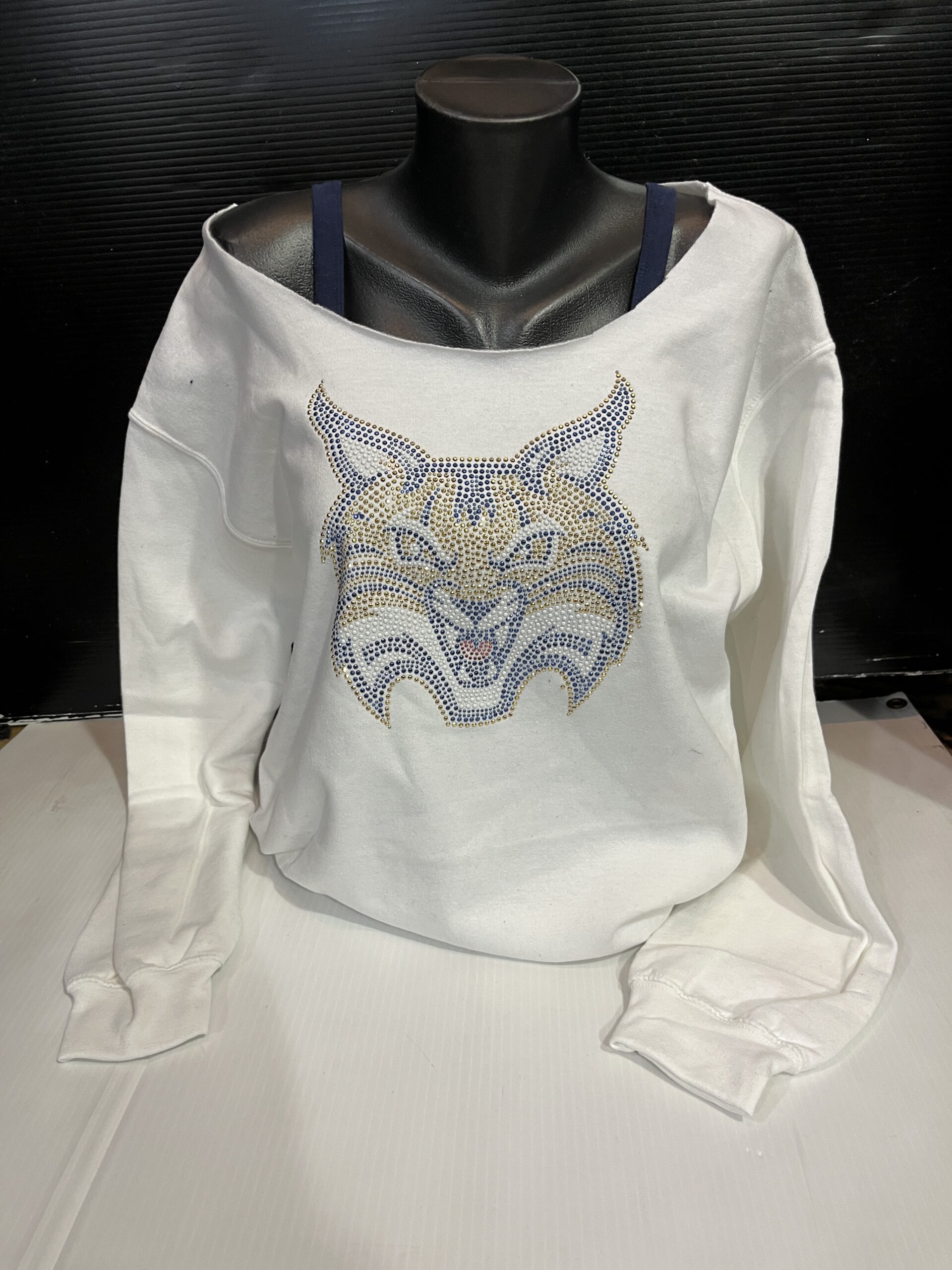 Be the first to review “Bling Off the Shoulder Sweatshirt- Quinnipiac”