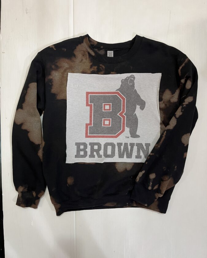 The collage sweatpant has sewn on vintage tees, plaid or bandana + name of school. 50% cotton/ 50% polyester. Drawstring at waist (except XS). Elastic at ankles. (Slight variations may occur.)