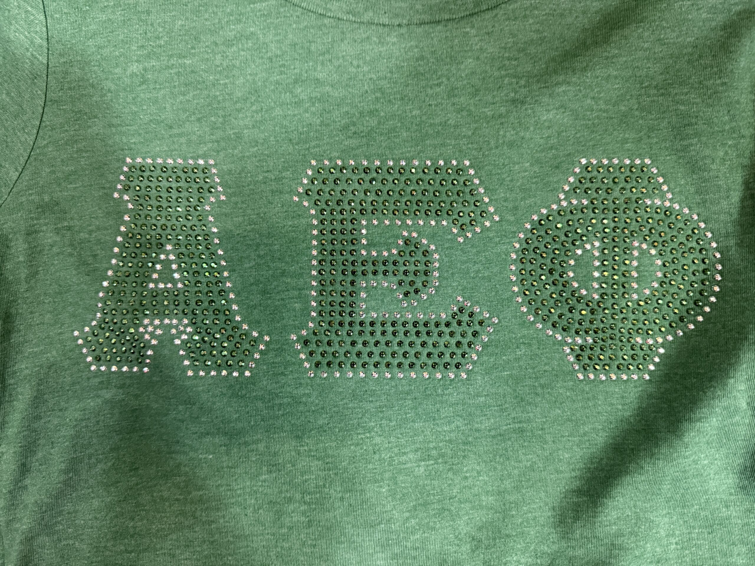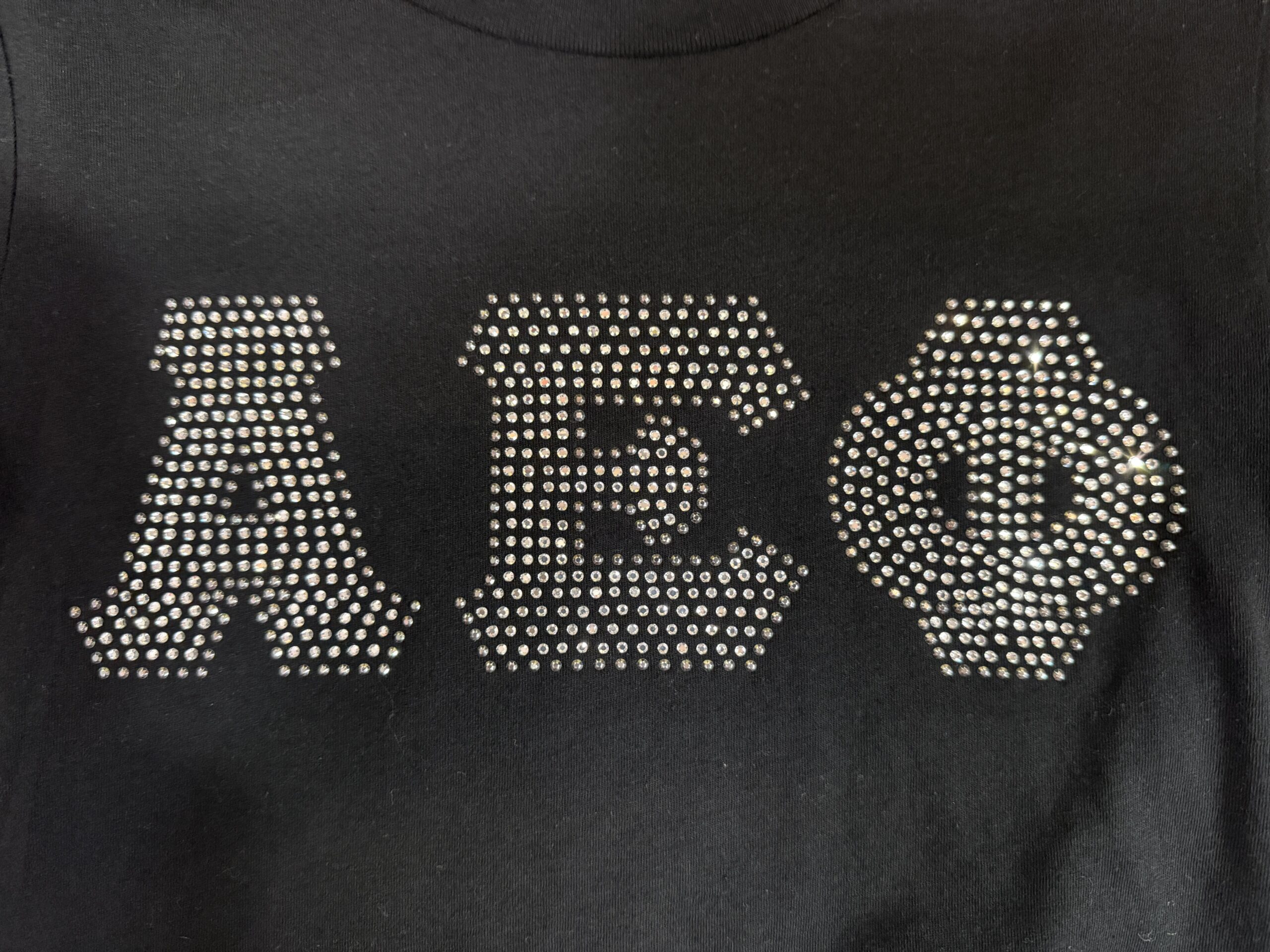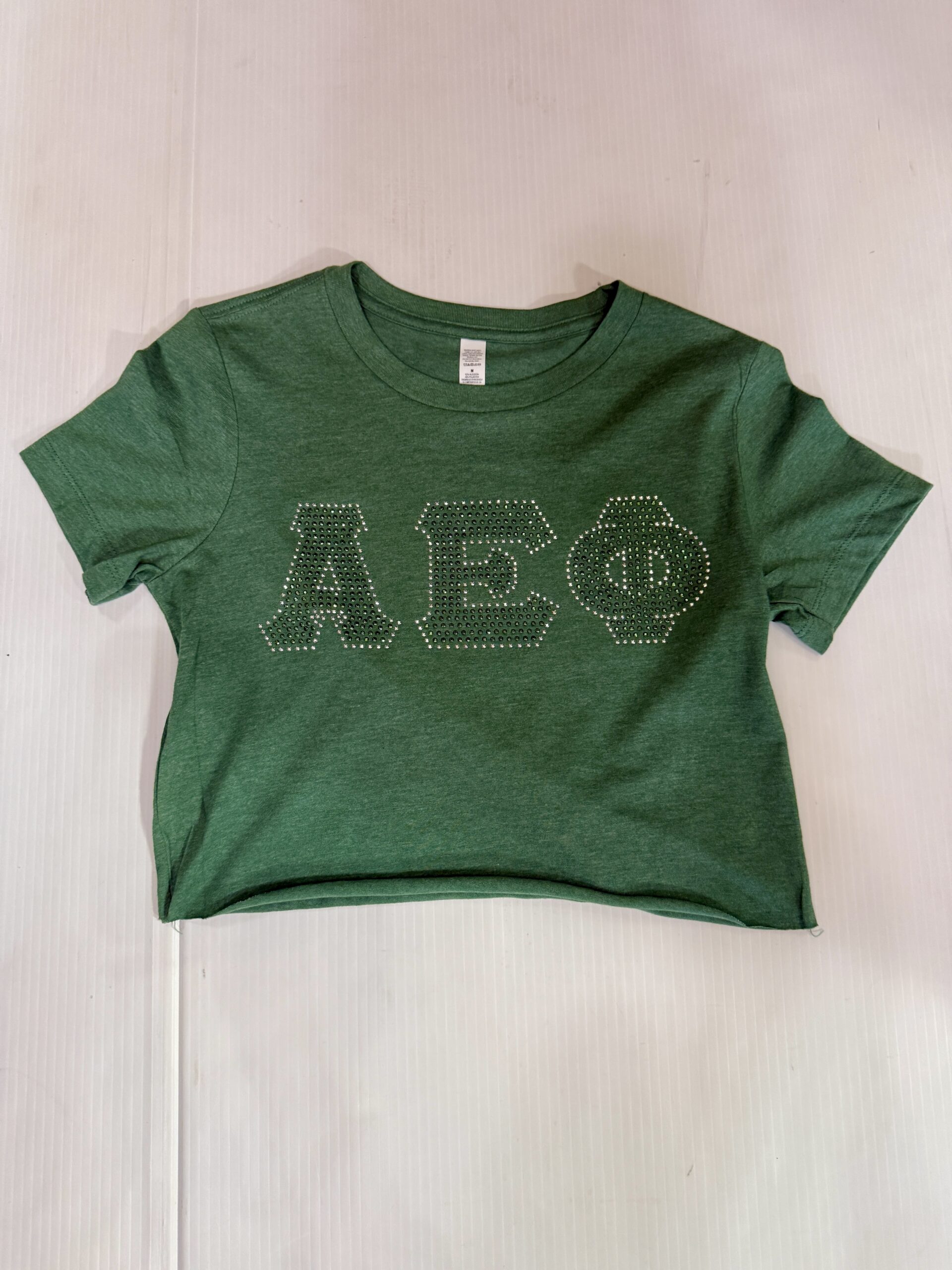 100% cotton baby tee with bling sorority logo cropped to 14 inches (raw cut)