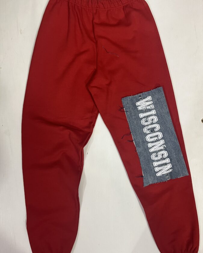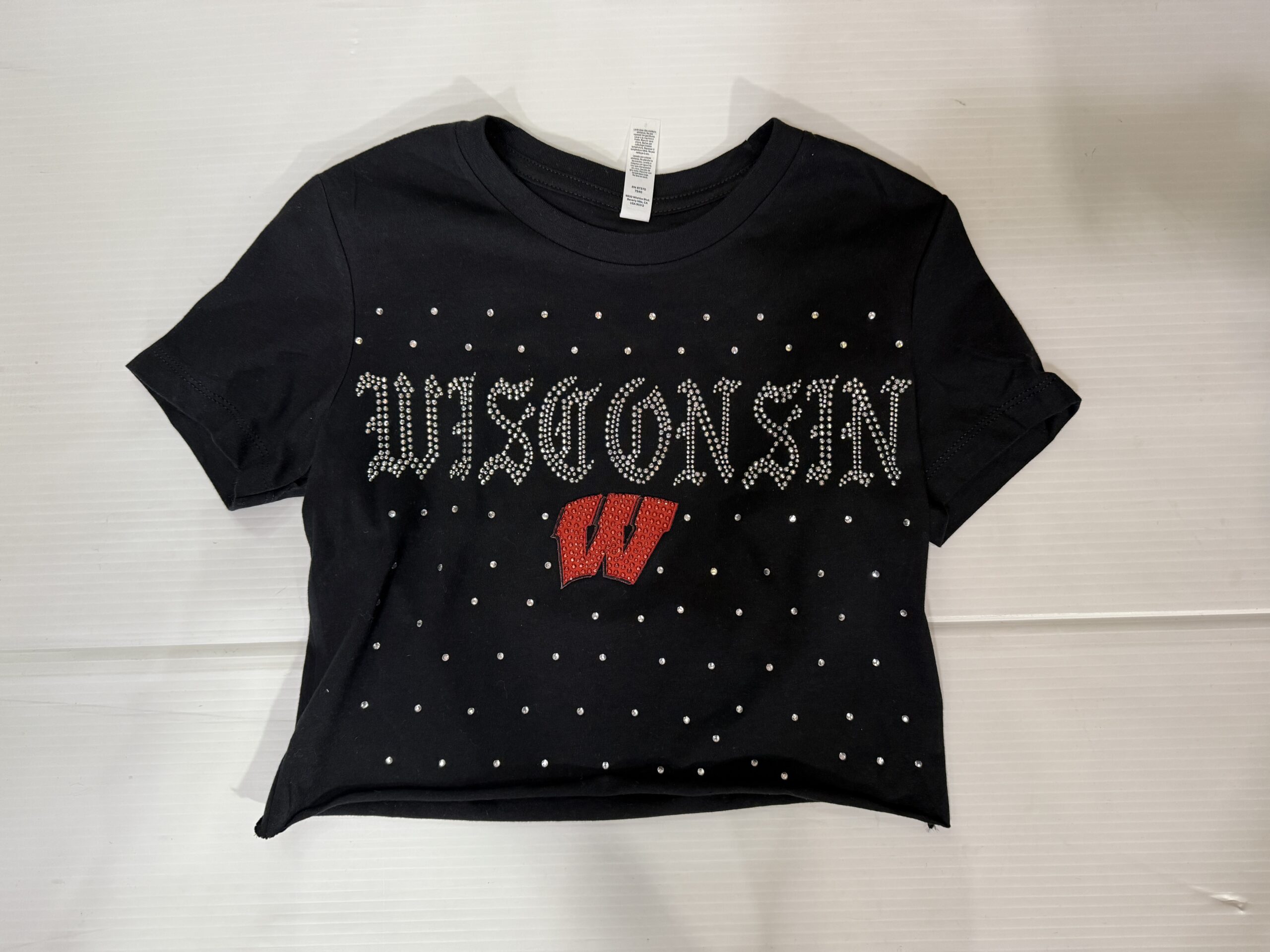 100% cotton baby tee with college logo cropped to 14 inches (raw cut). Bling writing & scattered rhinestones on front of tee.