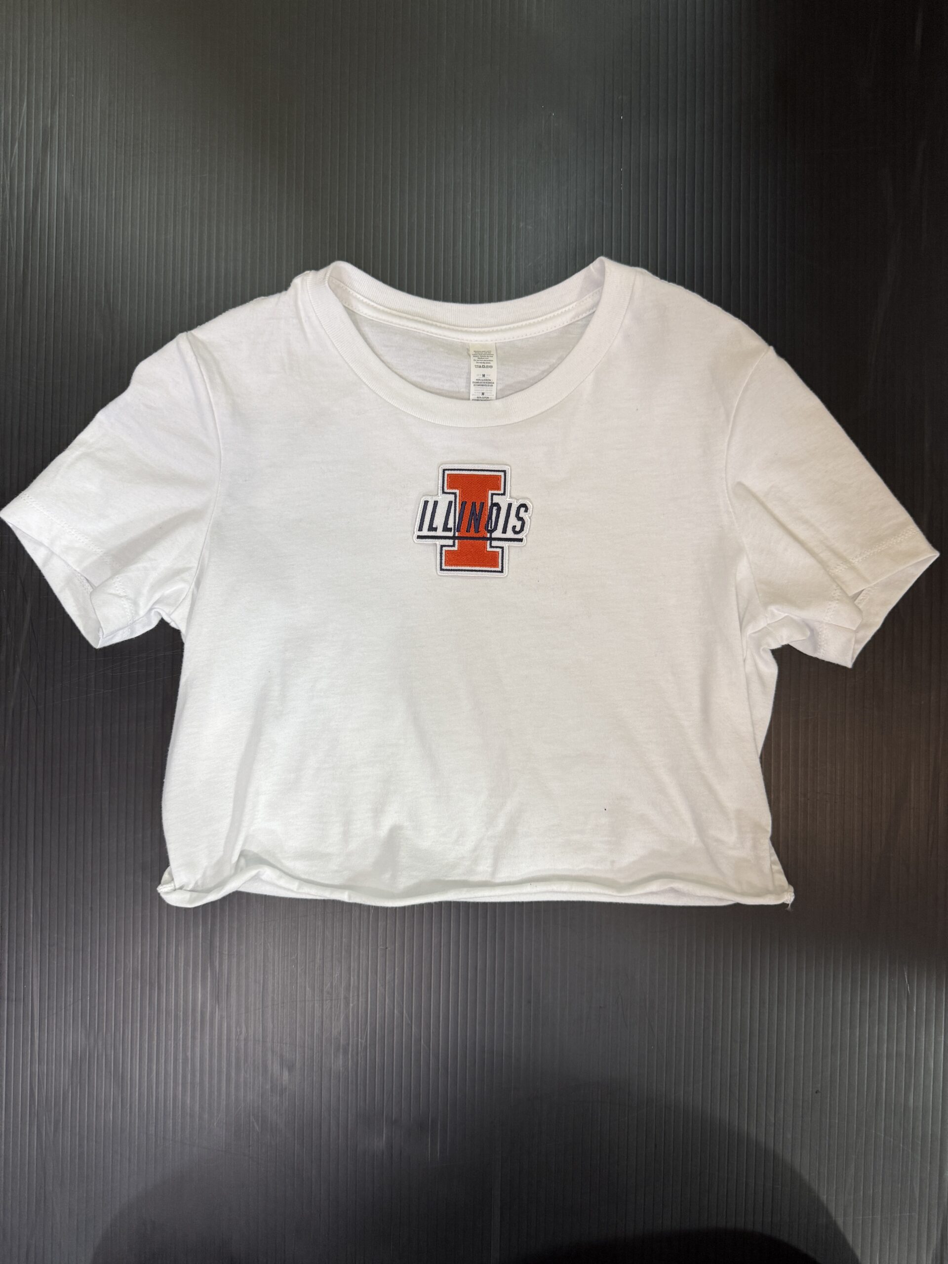 100% cotton baby tee with college logo cropped to 14 inches (raw cut)