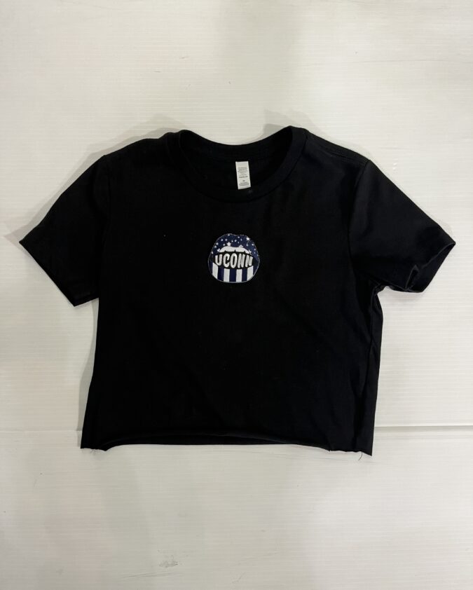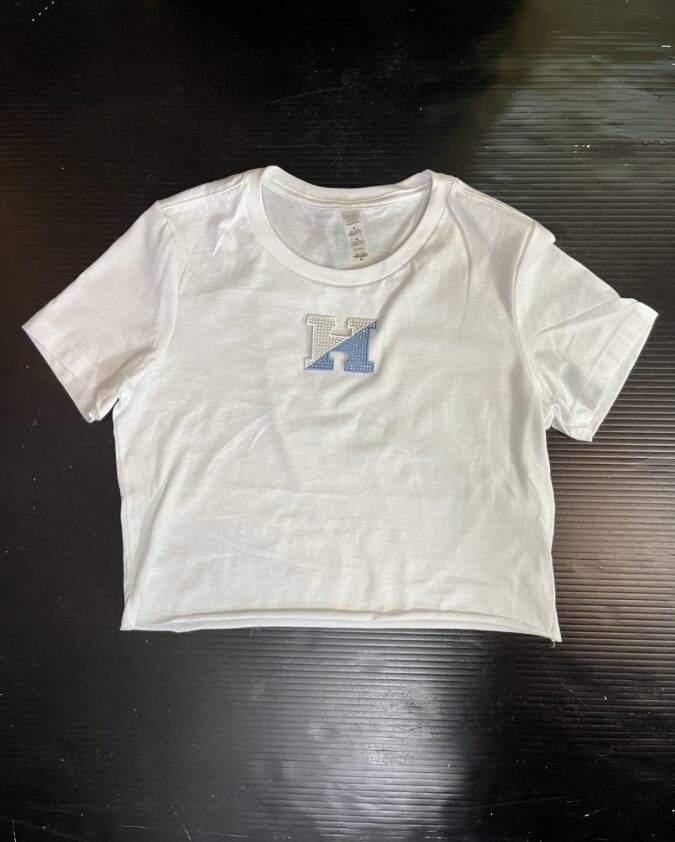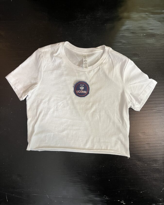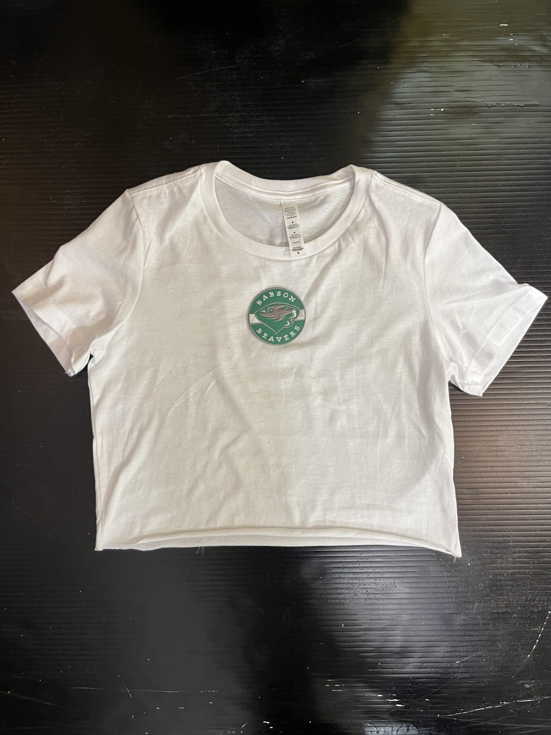 100% cotton baby tee with college logo cropped to 14 inches (raw cut)