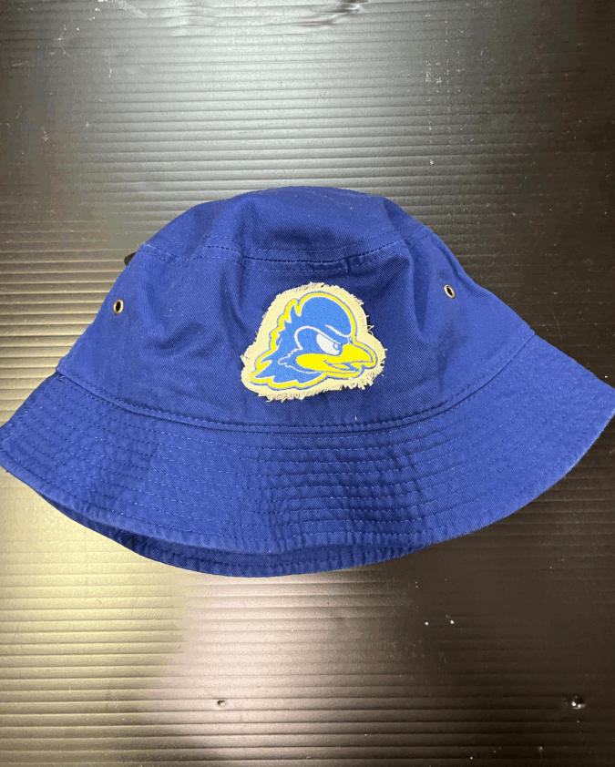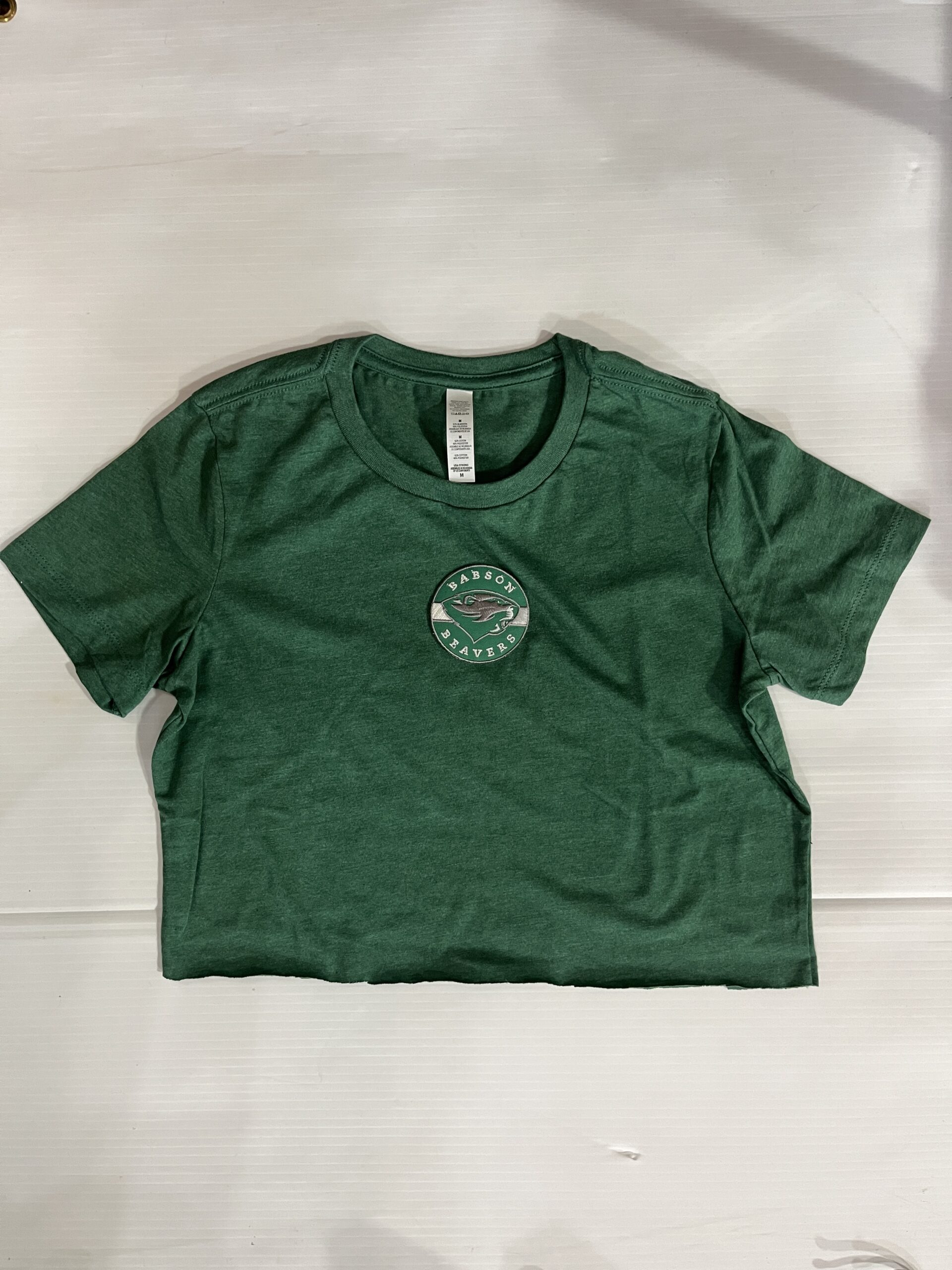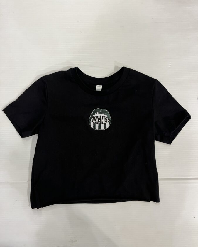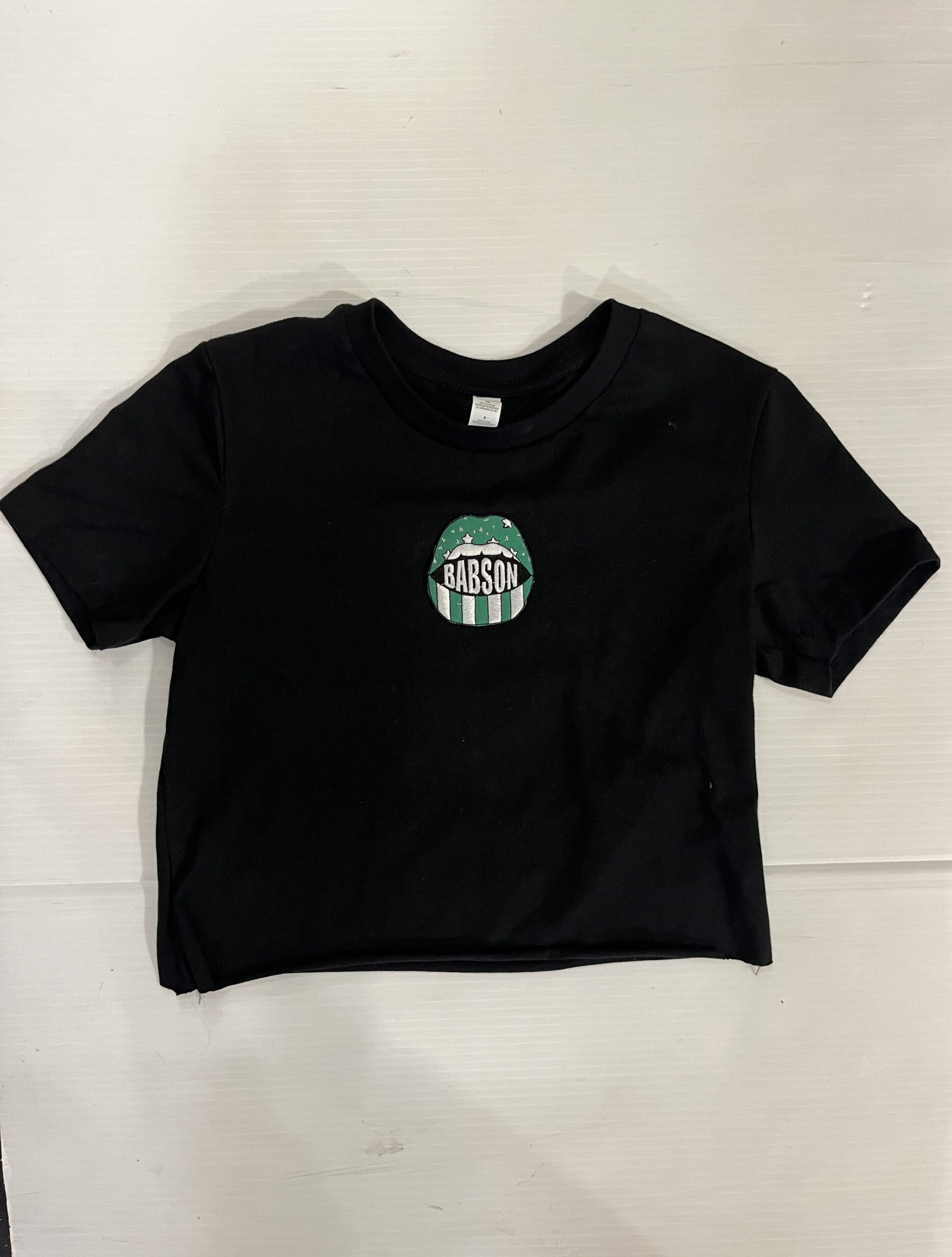 100% cotton baby tee with college logo cropped to 14 inches (raw cut)