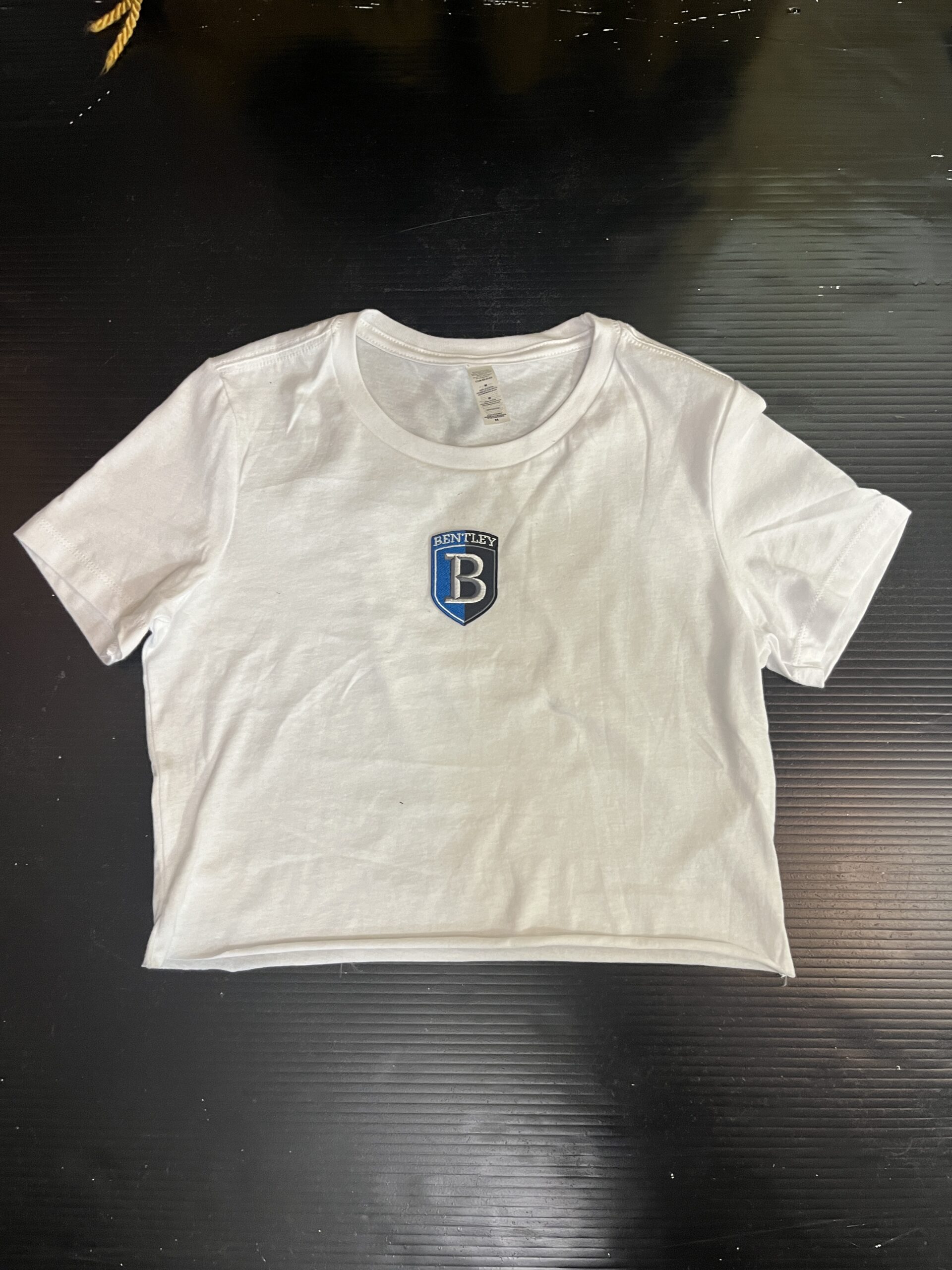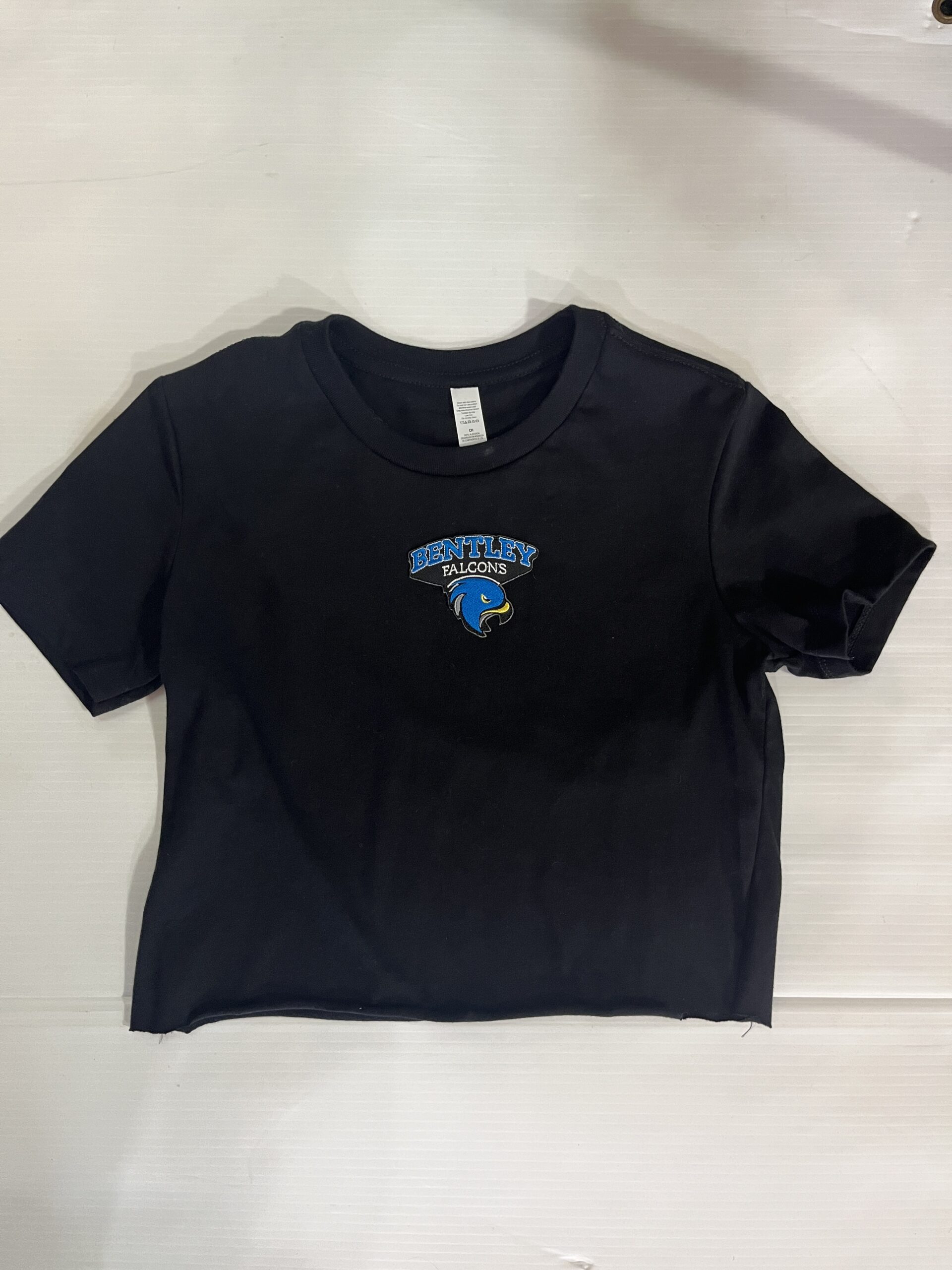 100% cotton baby tee with college logo cropped to 14 inches (raw cut)