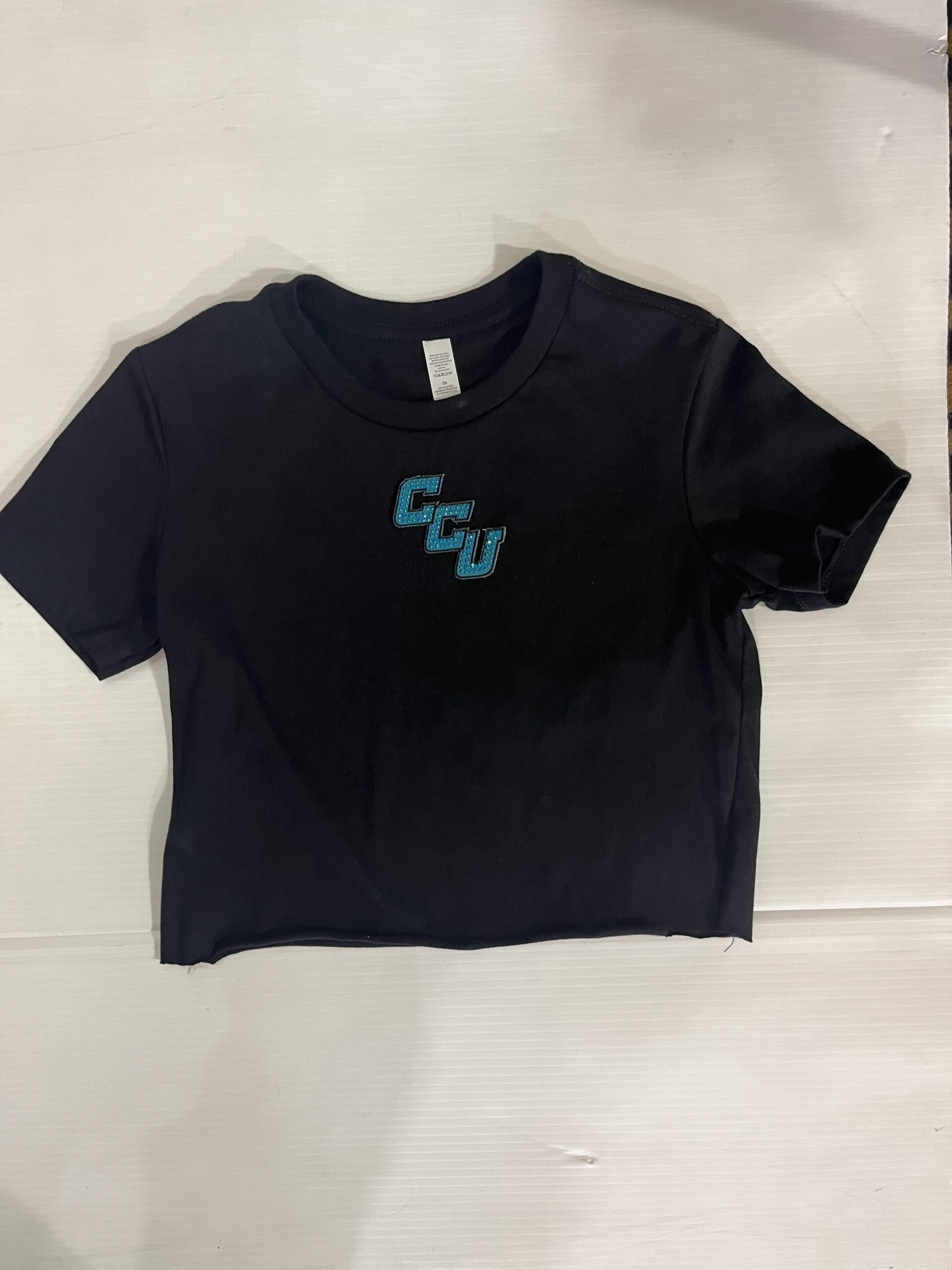 100% cotton baby tee with college logo cropped to 14 inches (raw cut)
