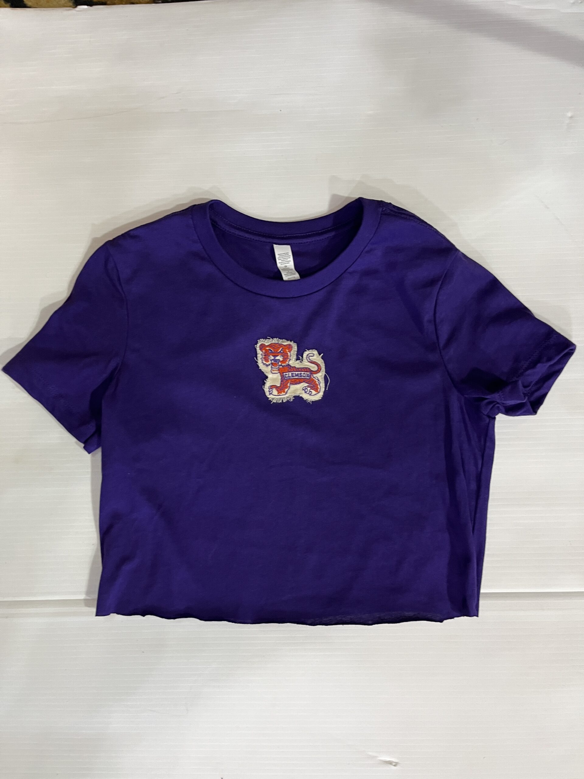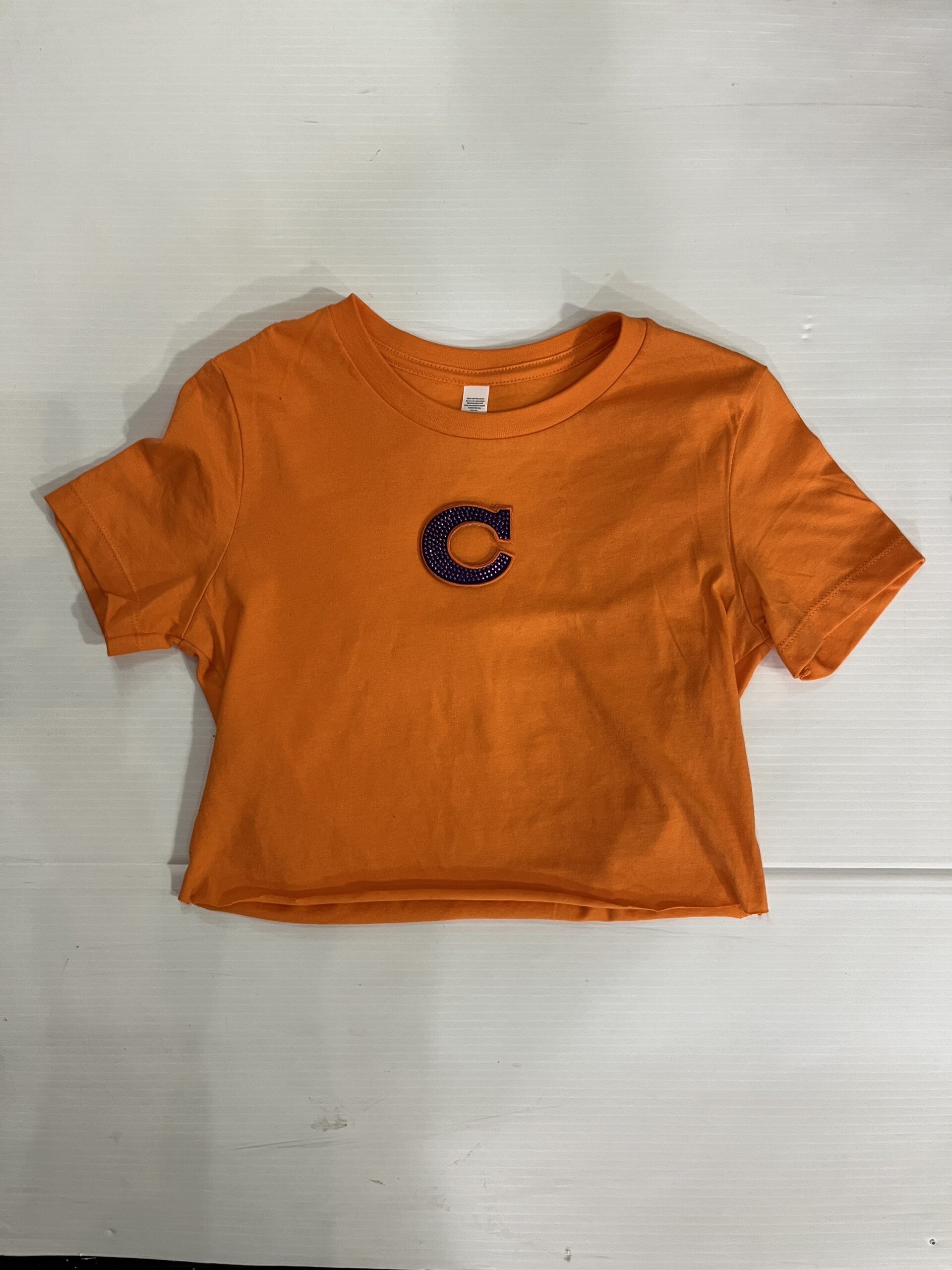 100% cotton baby tee with college logo cropped to 14 inches (raw cut)