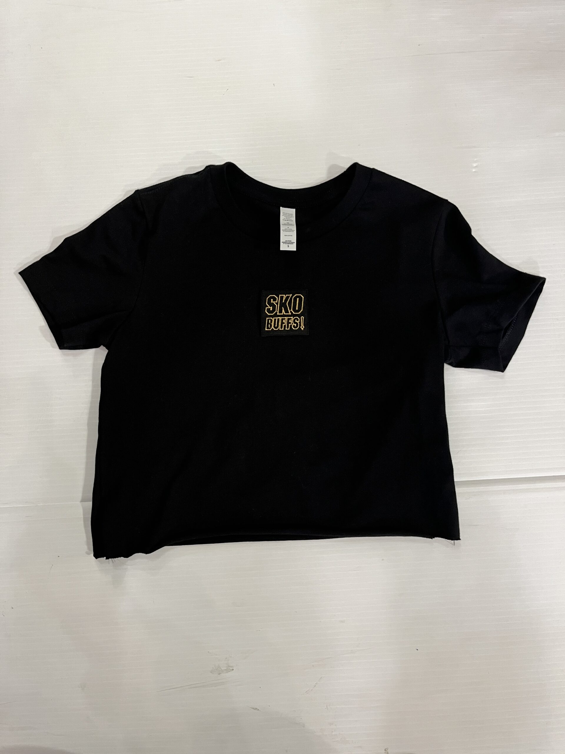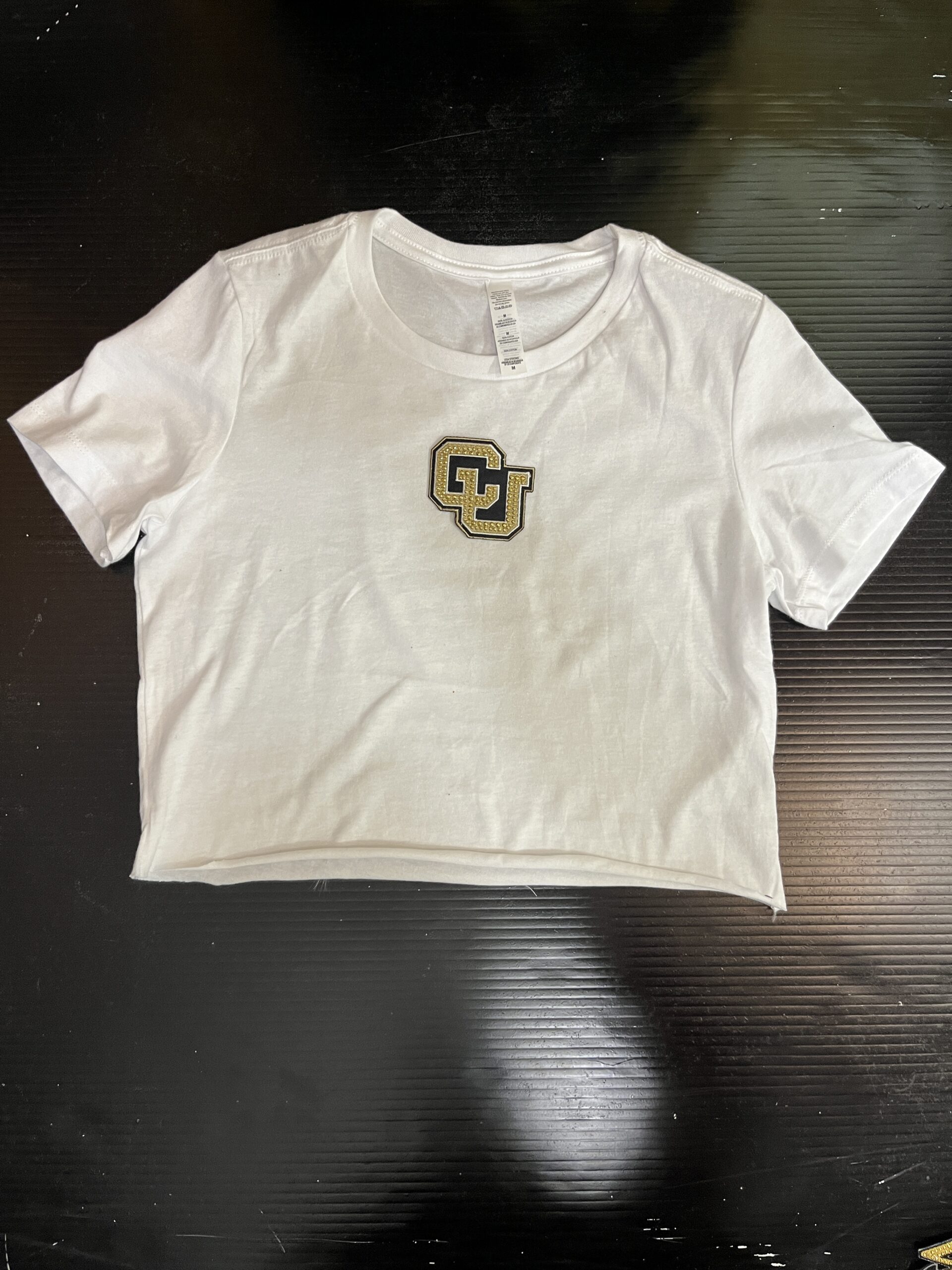 100% cotton baby tee with college logo cropped to 14 inches (raw cut)