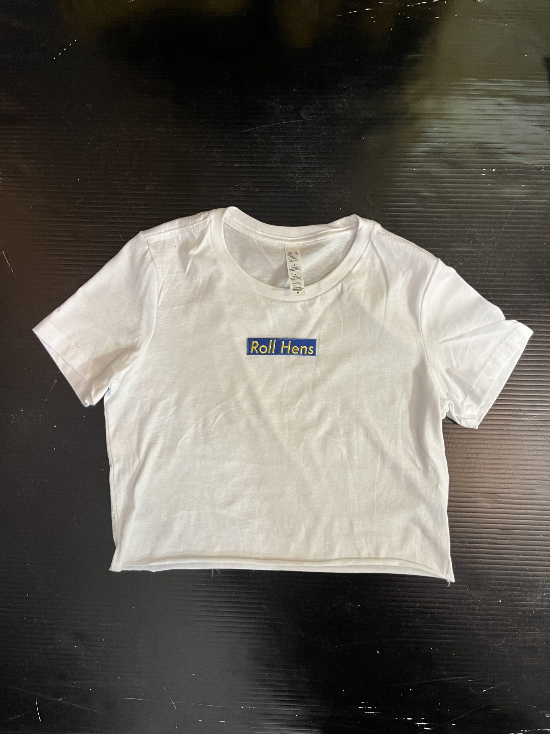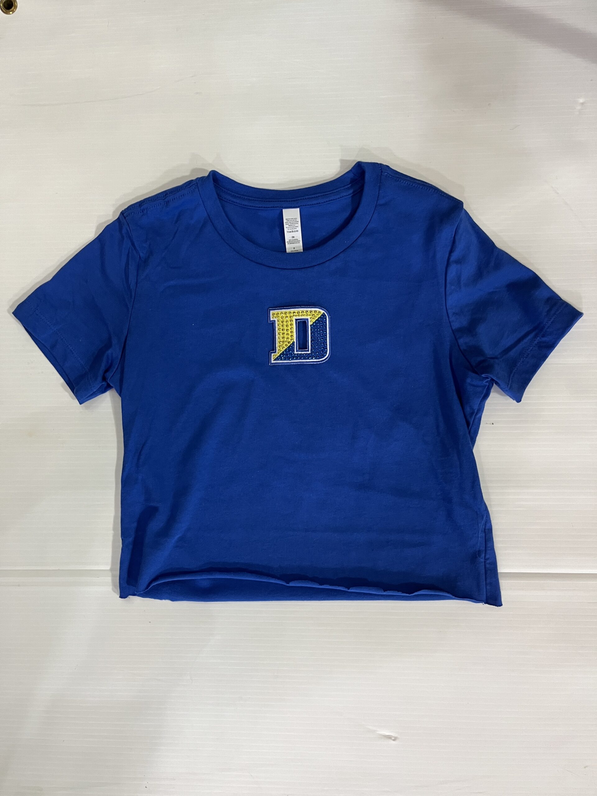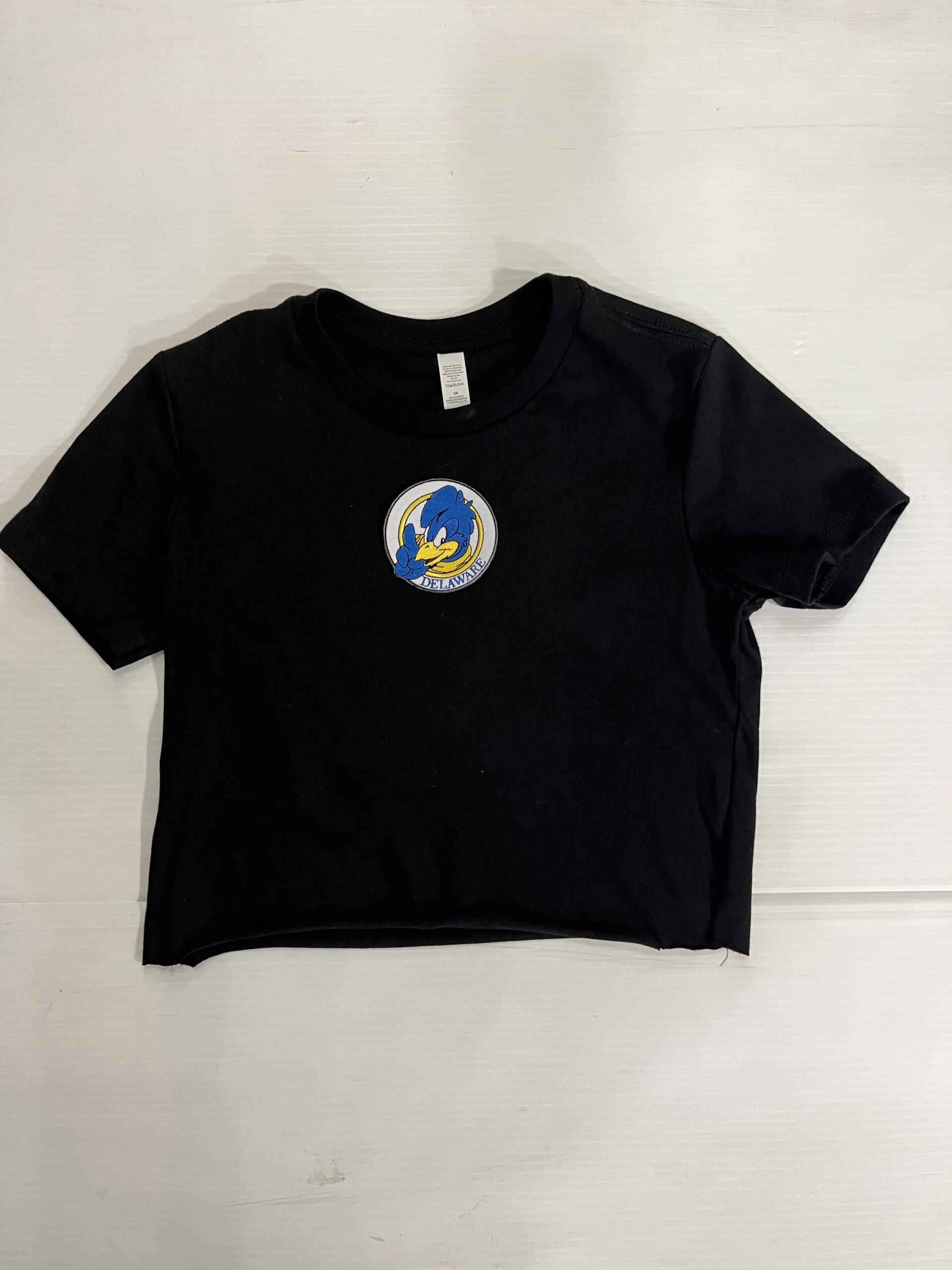 100% cotton baby tee with college logo cropped to 14 inches (raw cut)