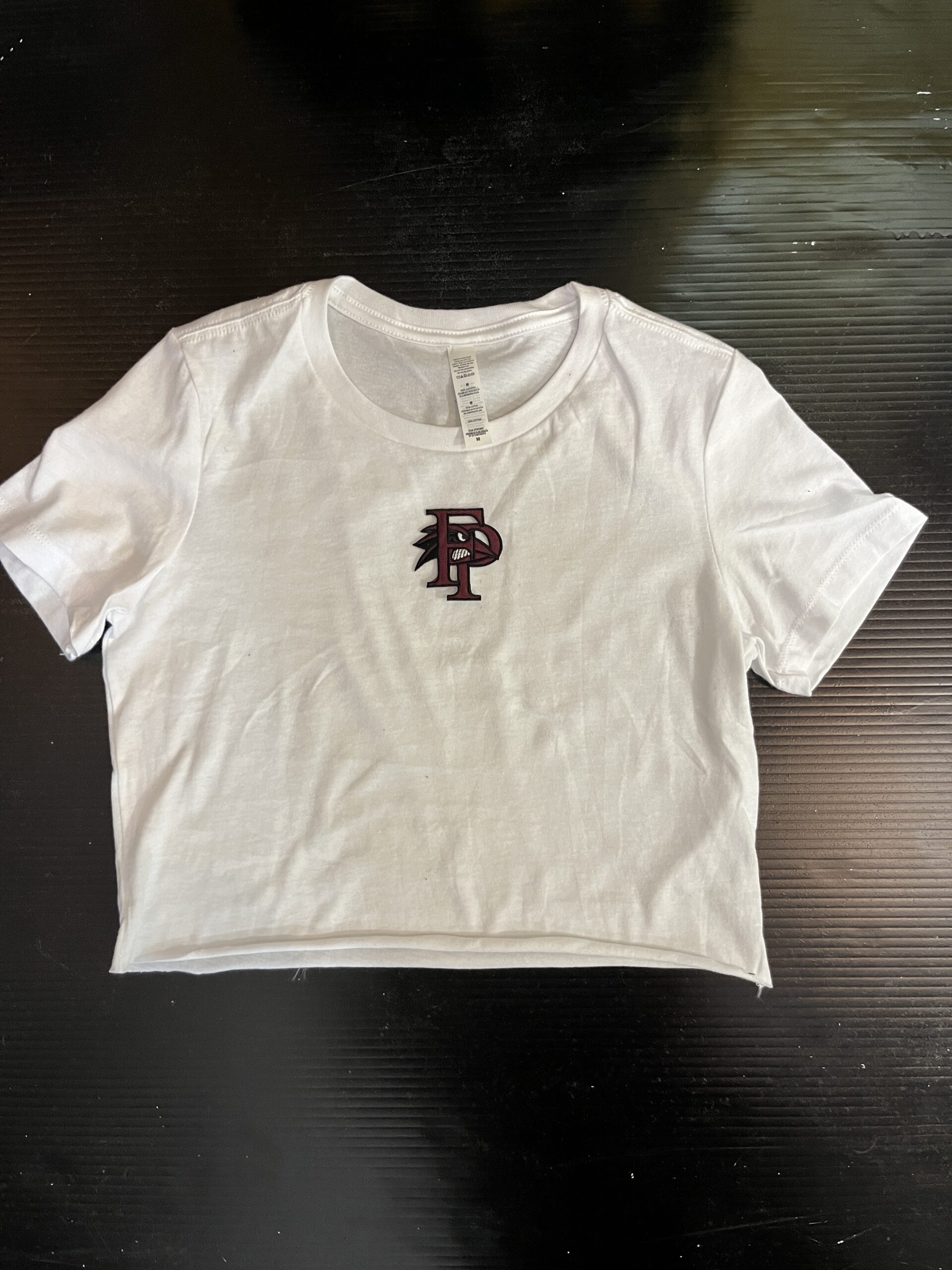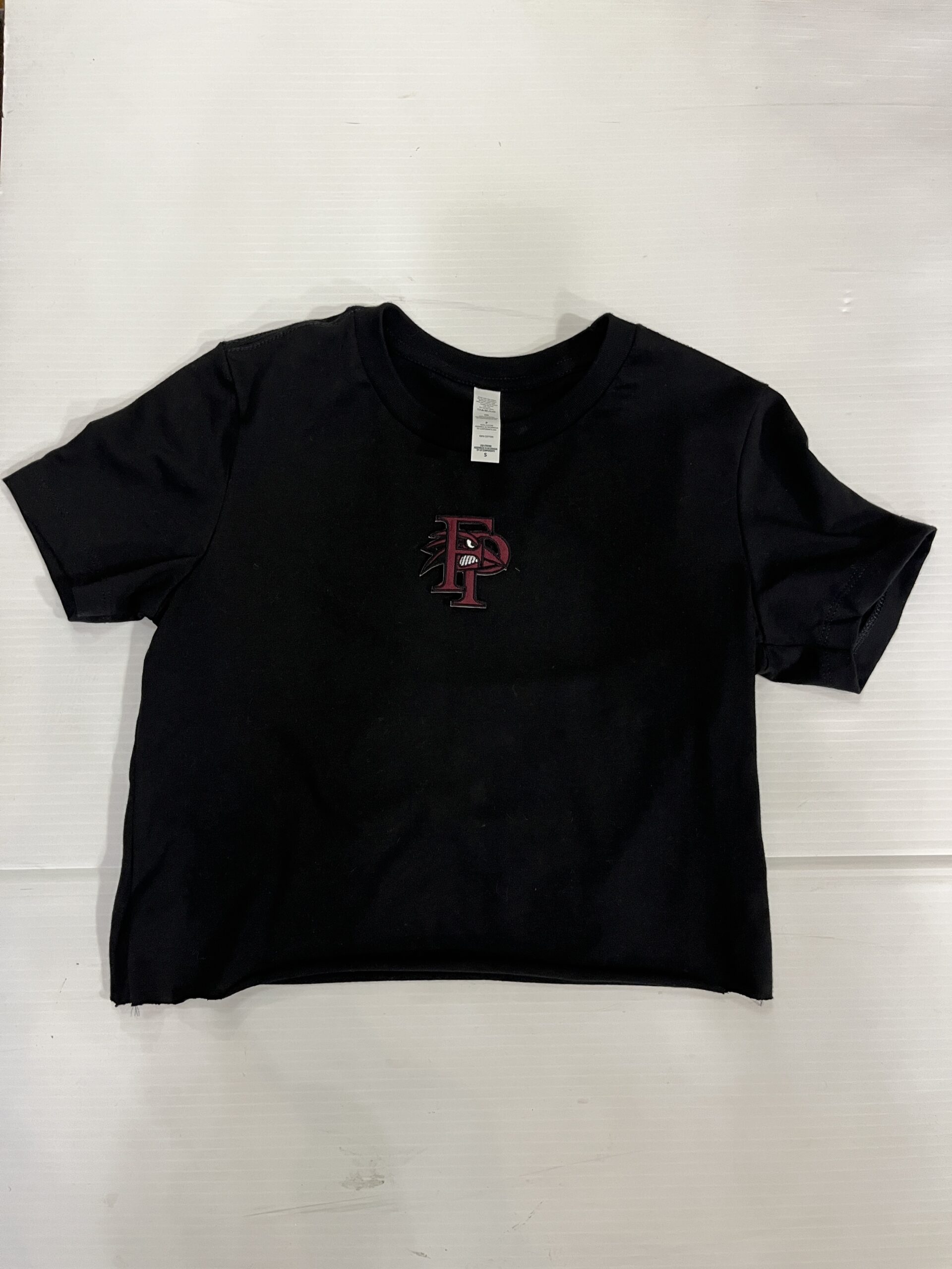 100% cotton baby tee with college logo cropped to 14 inches (raw cut)