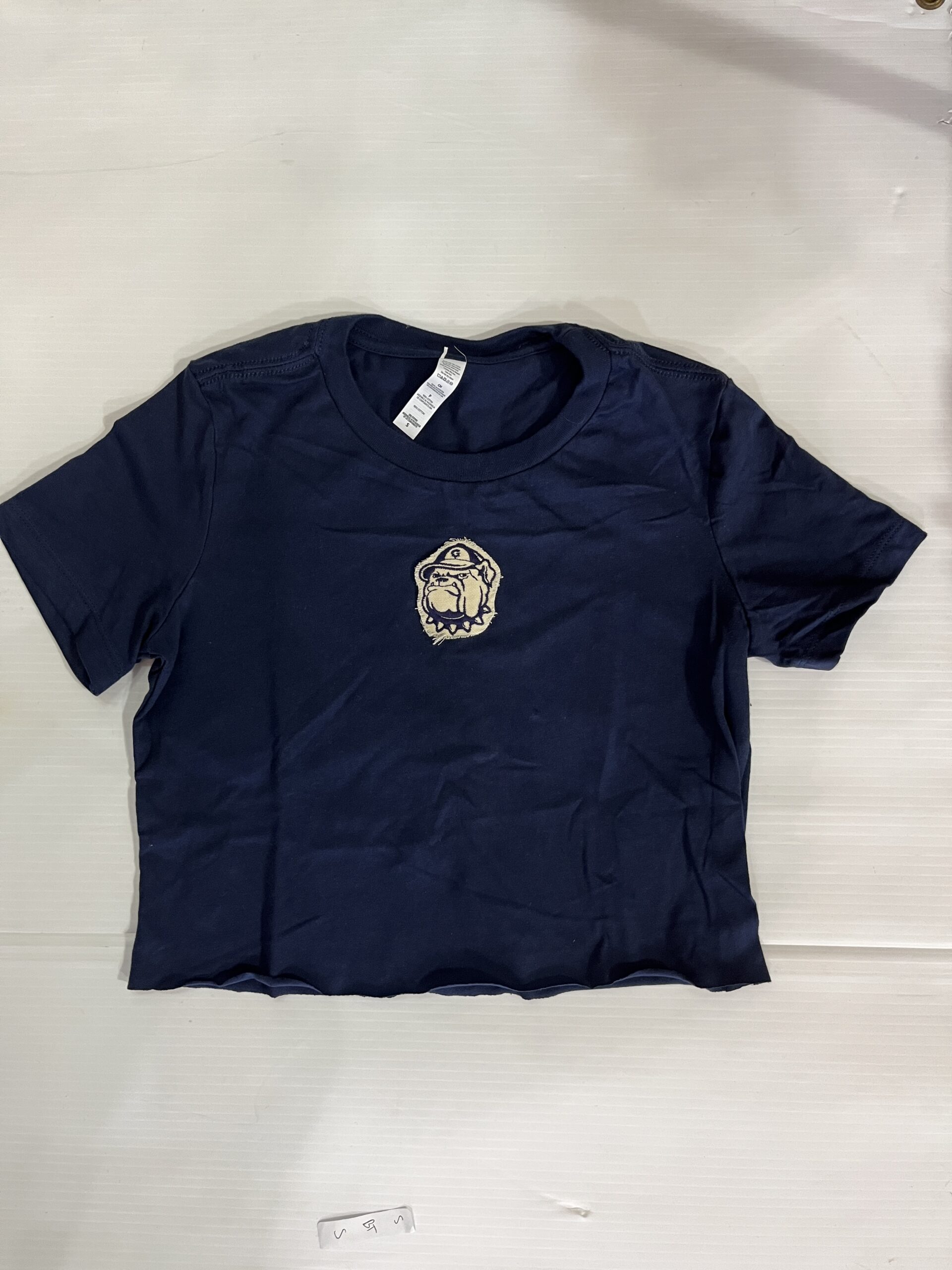 100% cotton baby tee with college logo cropped to 14 inches (raw cut)