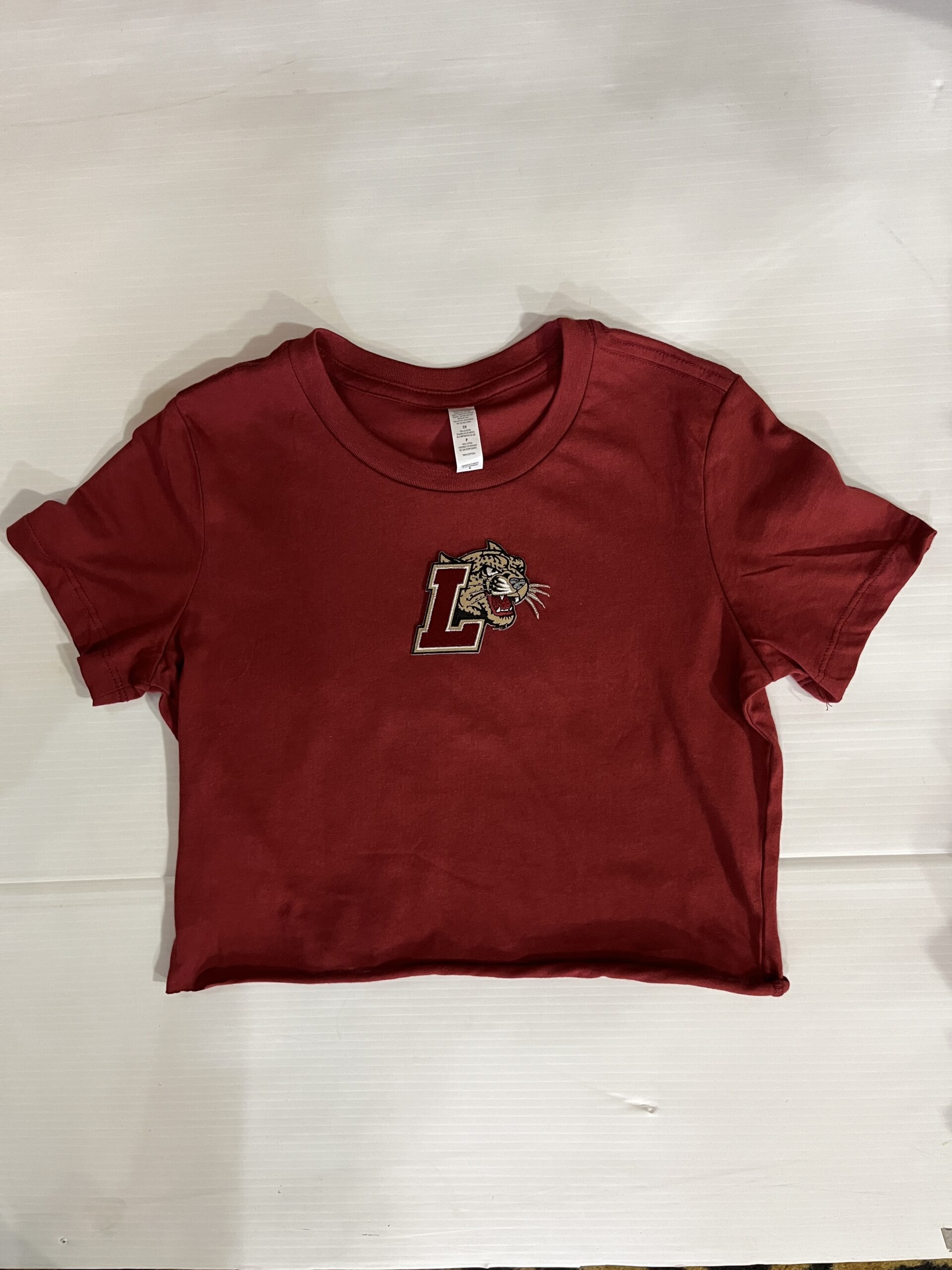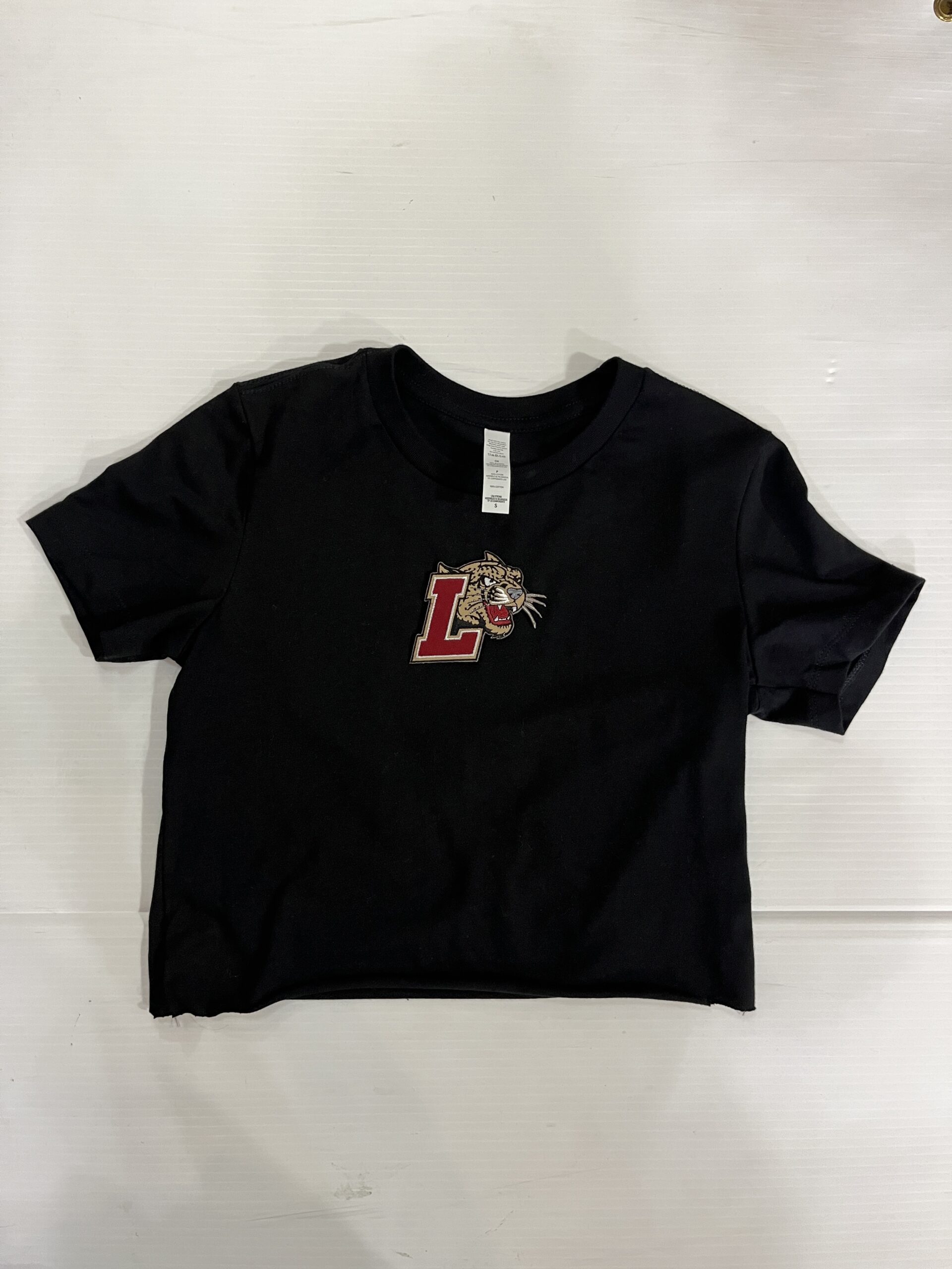 100% cotton baby tee with college logo cropped to 14 inches (raw cut)