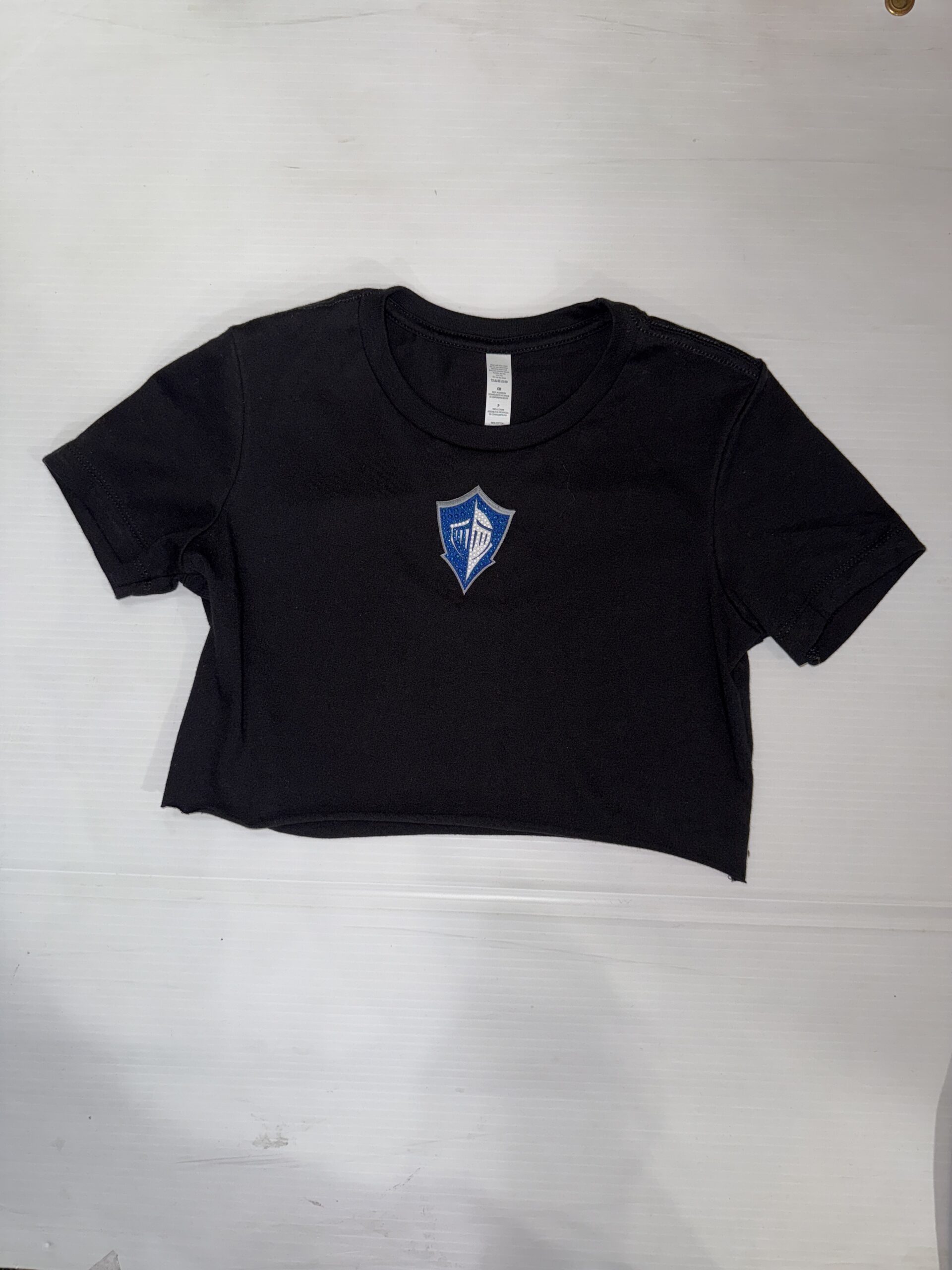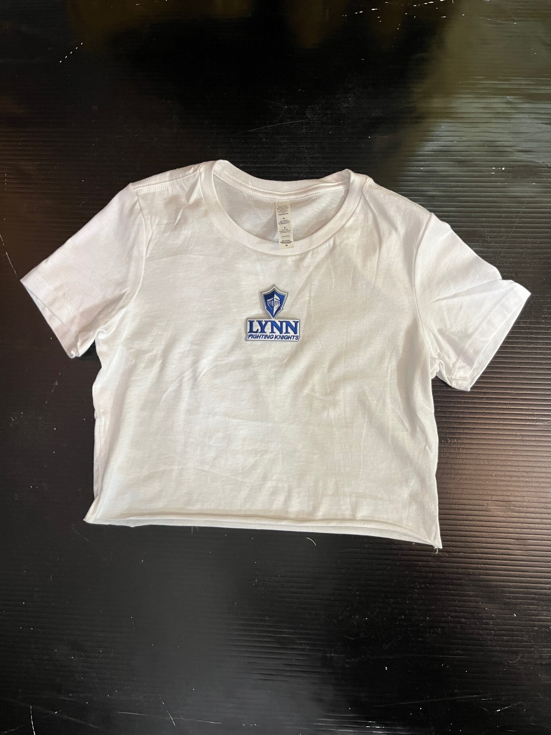 100% cotton baby tee with college logo cropped to 14 inches (raw cut)