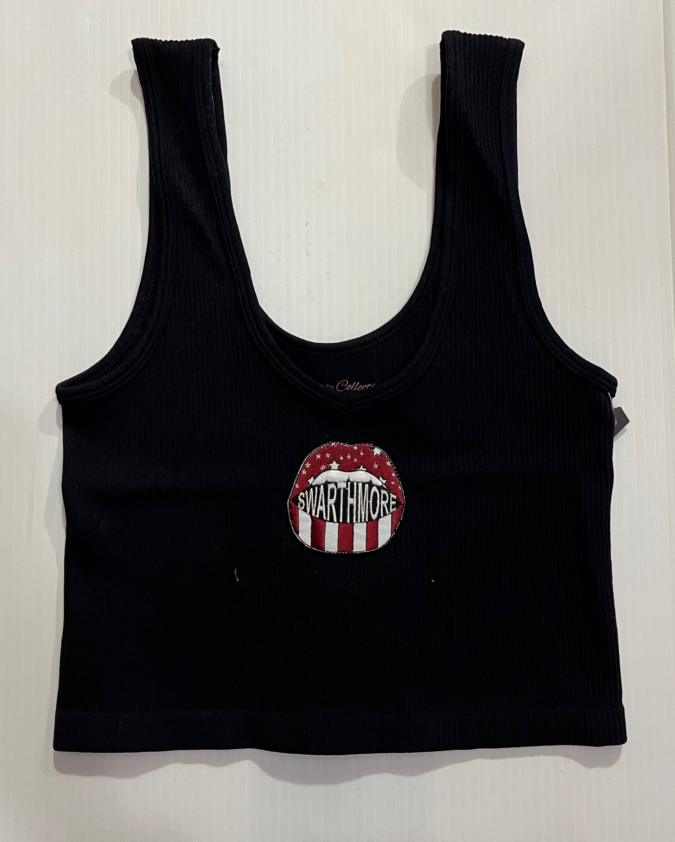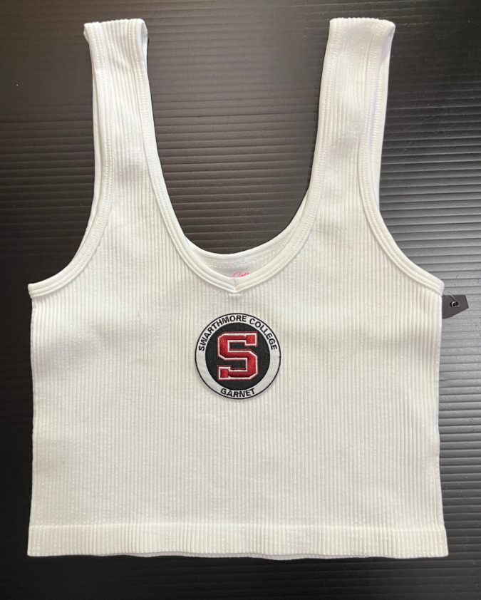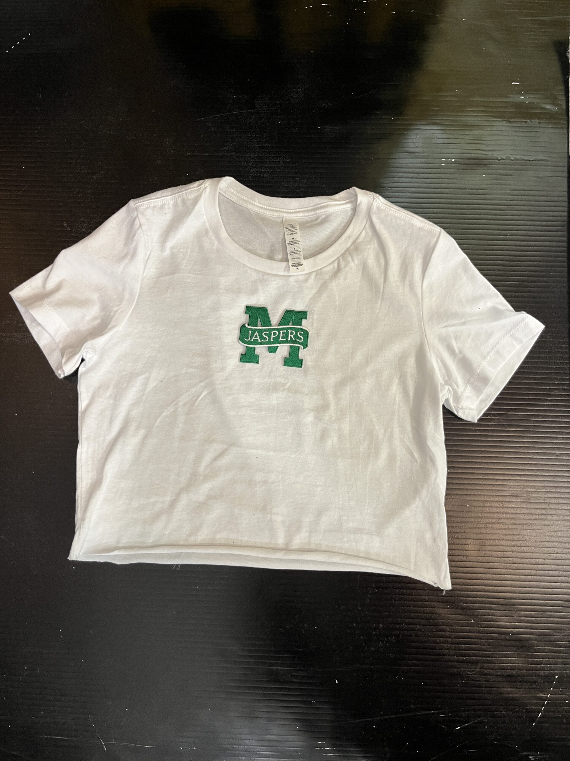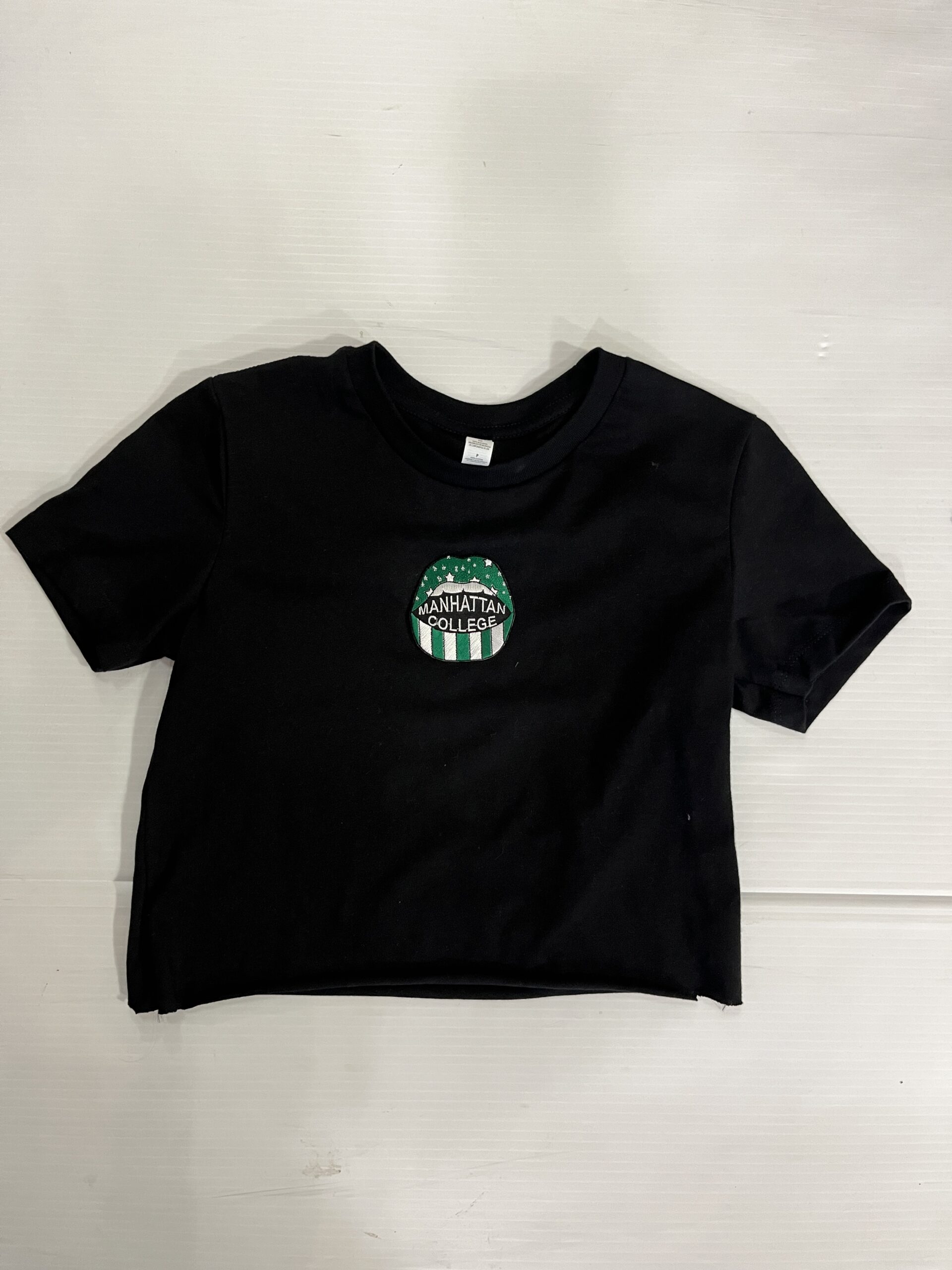 100% cotton baby tee with college logo cropped to 14 inches (raw cut)