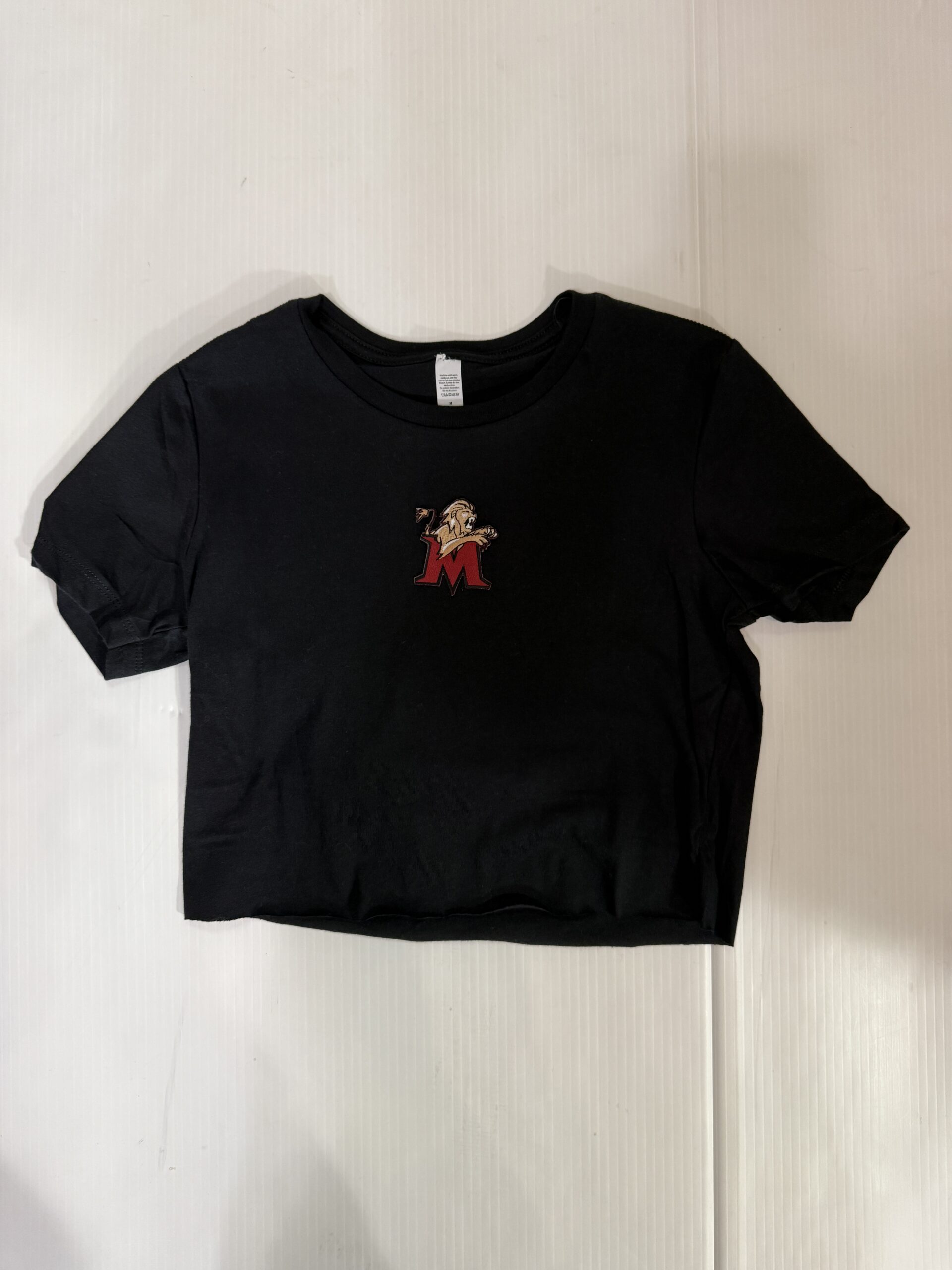100% cotton baby tee with college logo cropped to 14 inches (raw cut)