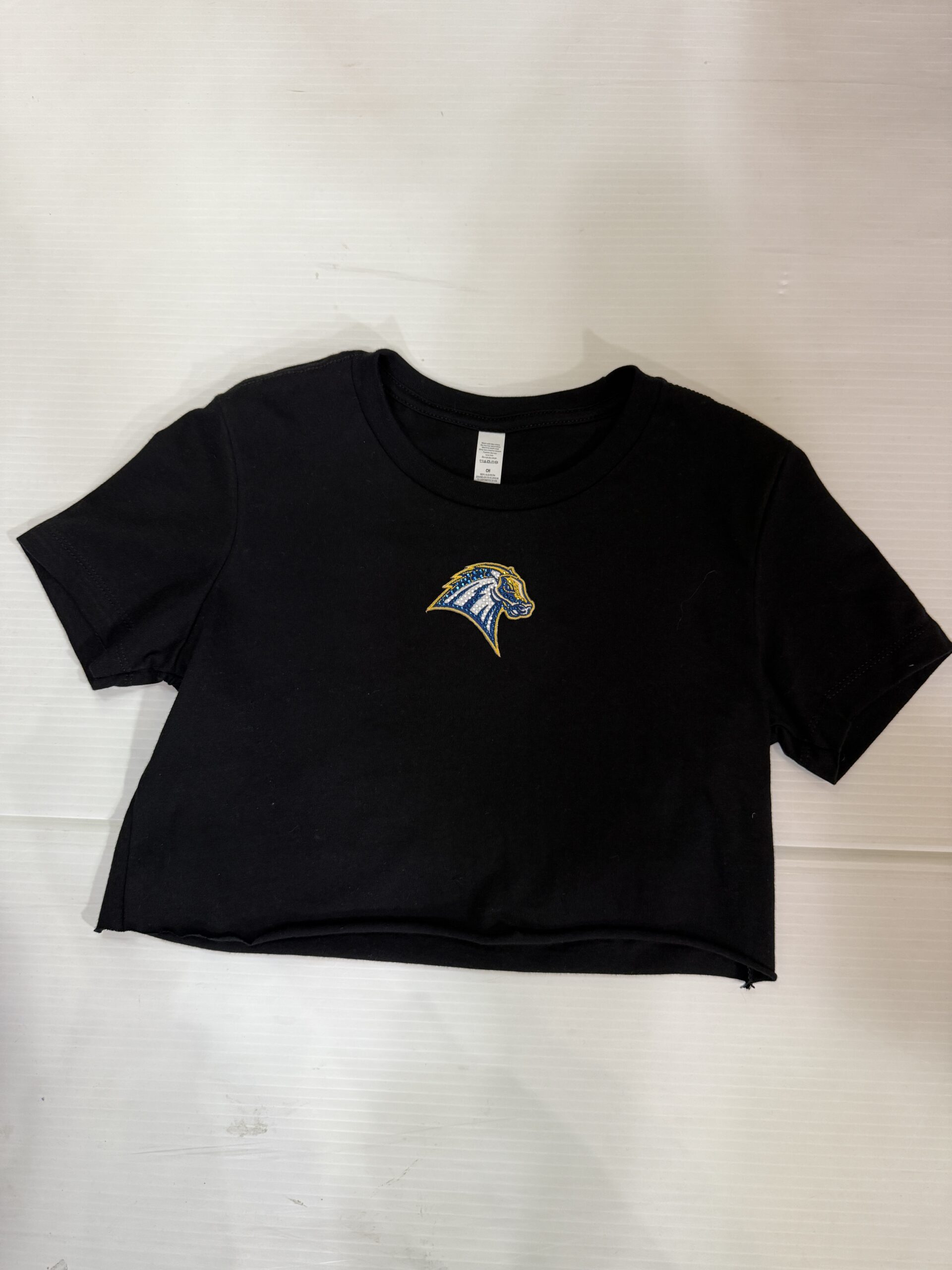 100% cotton baby tee with college logo cropped to 14 inches (raw cut)