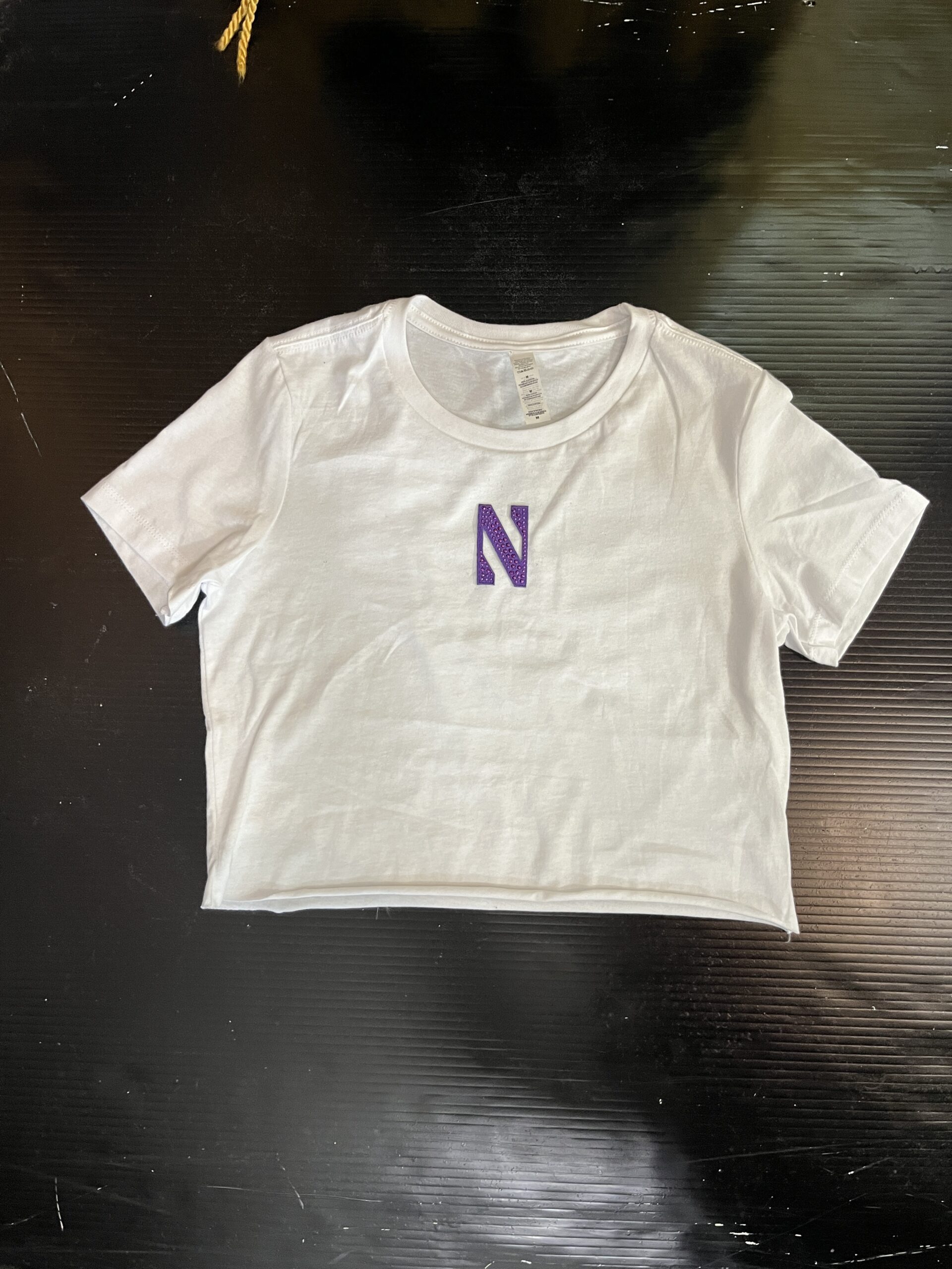 100% cotton baby tee with college logo cropped to 14 inches (raw cut)