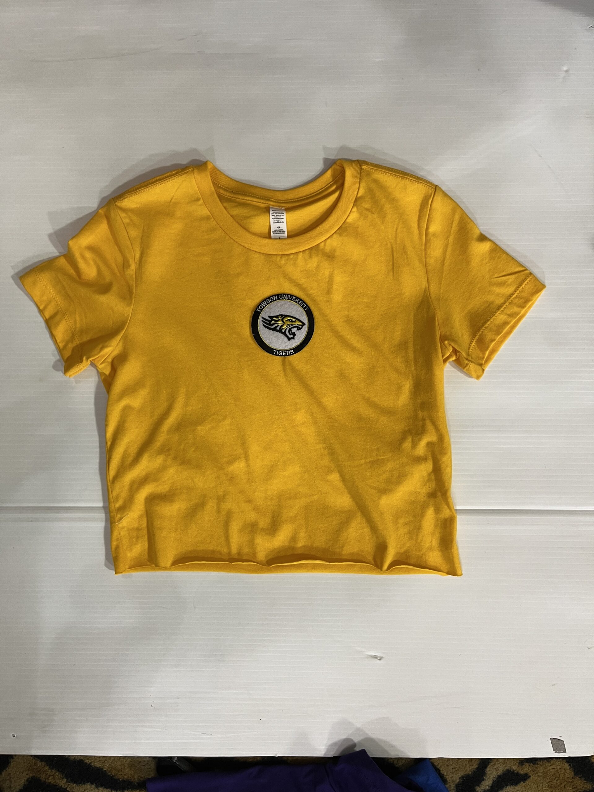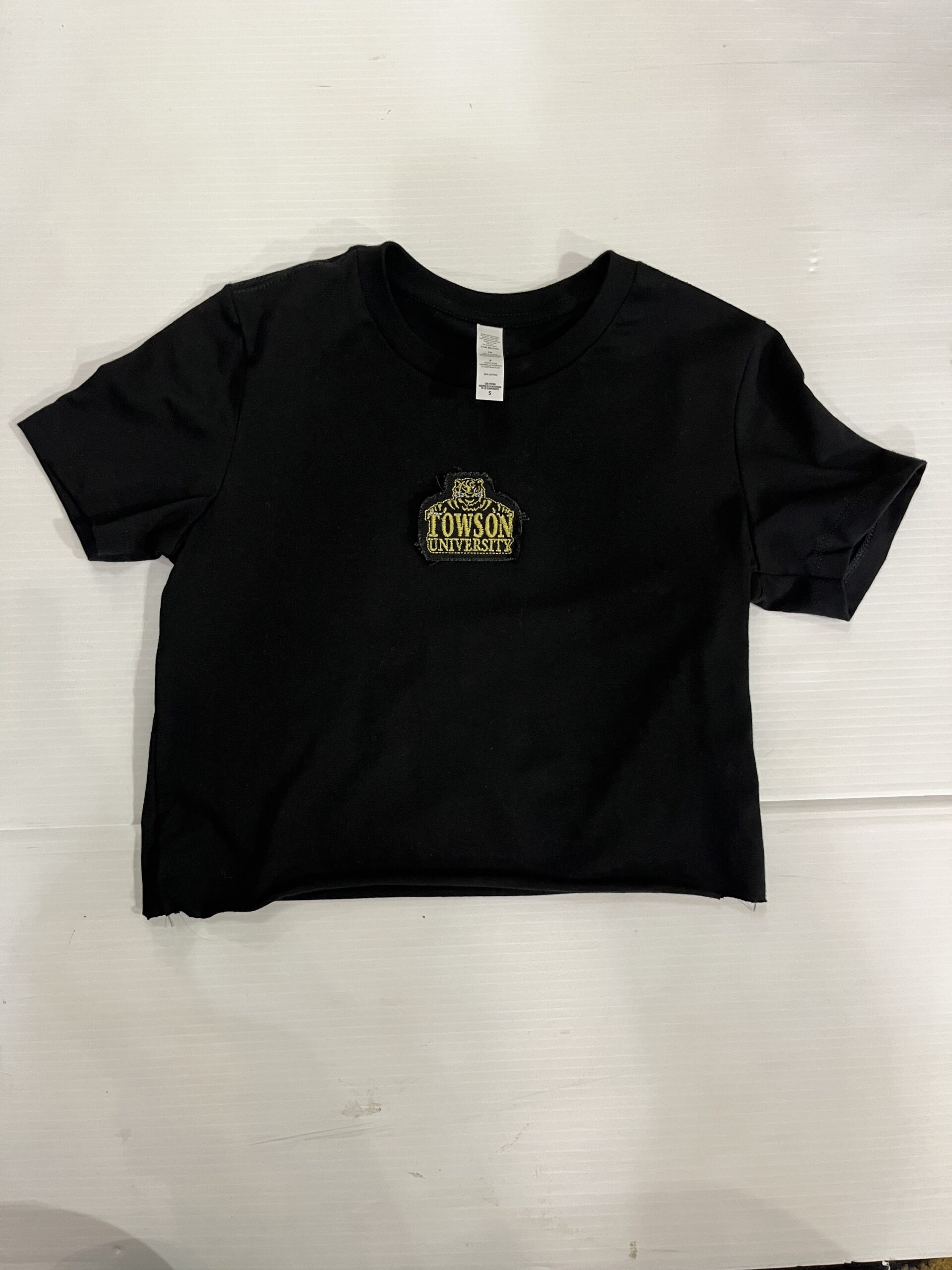 100% cotton baby tee with college logo cropped to 14 inches (raw cut)