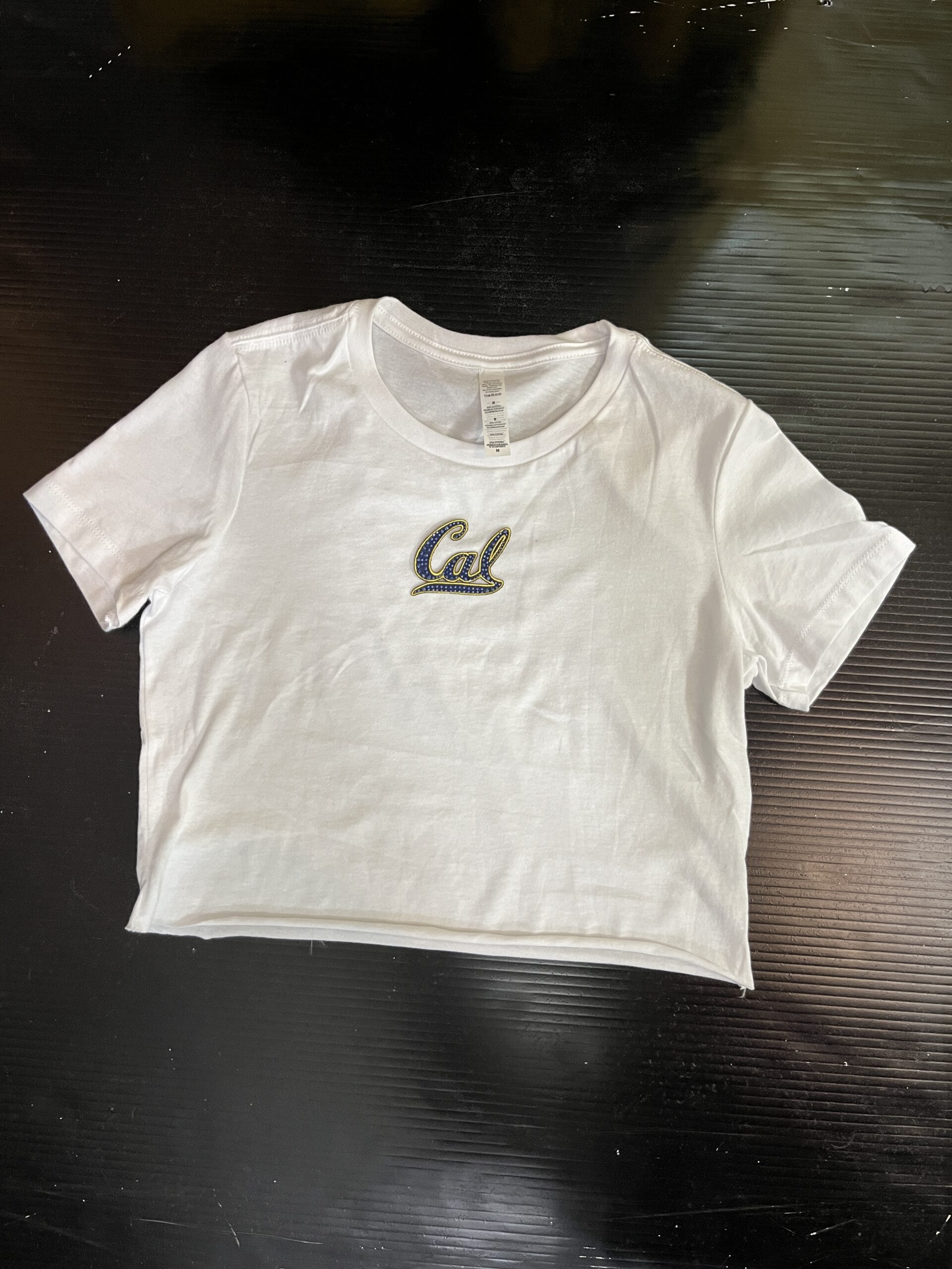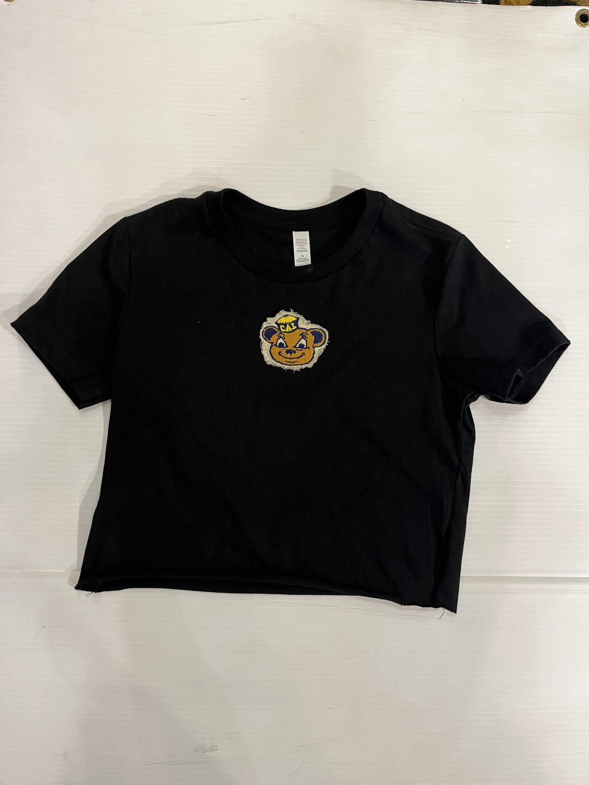 100% cotton baby tee with college logo cropped to 14 inches (raw cut)