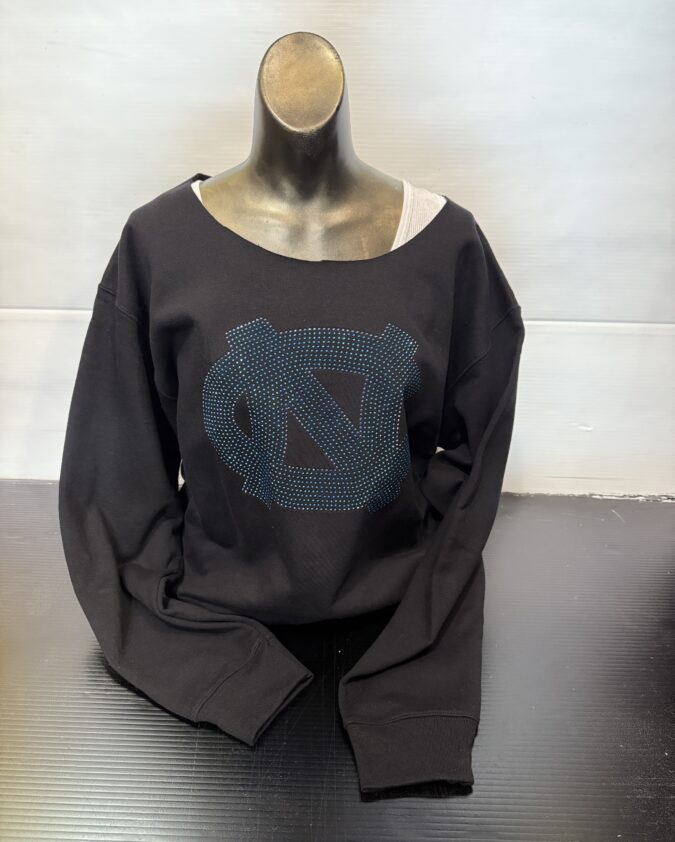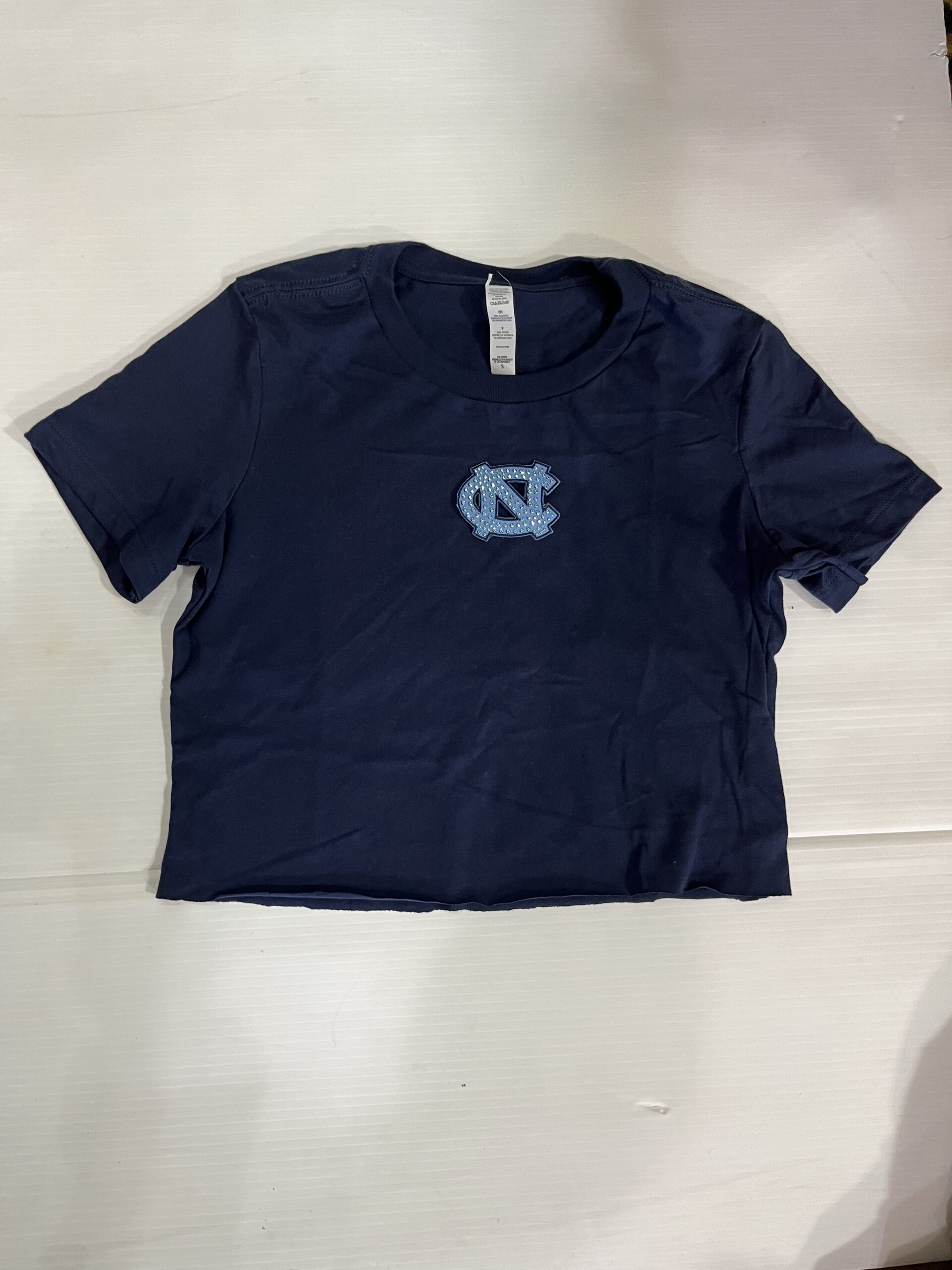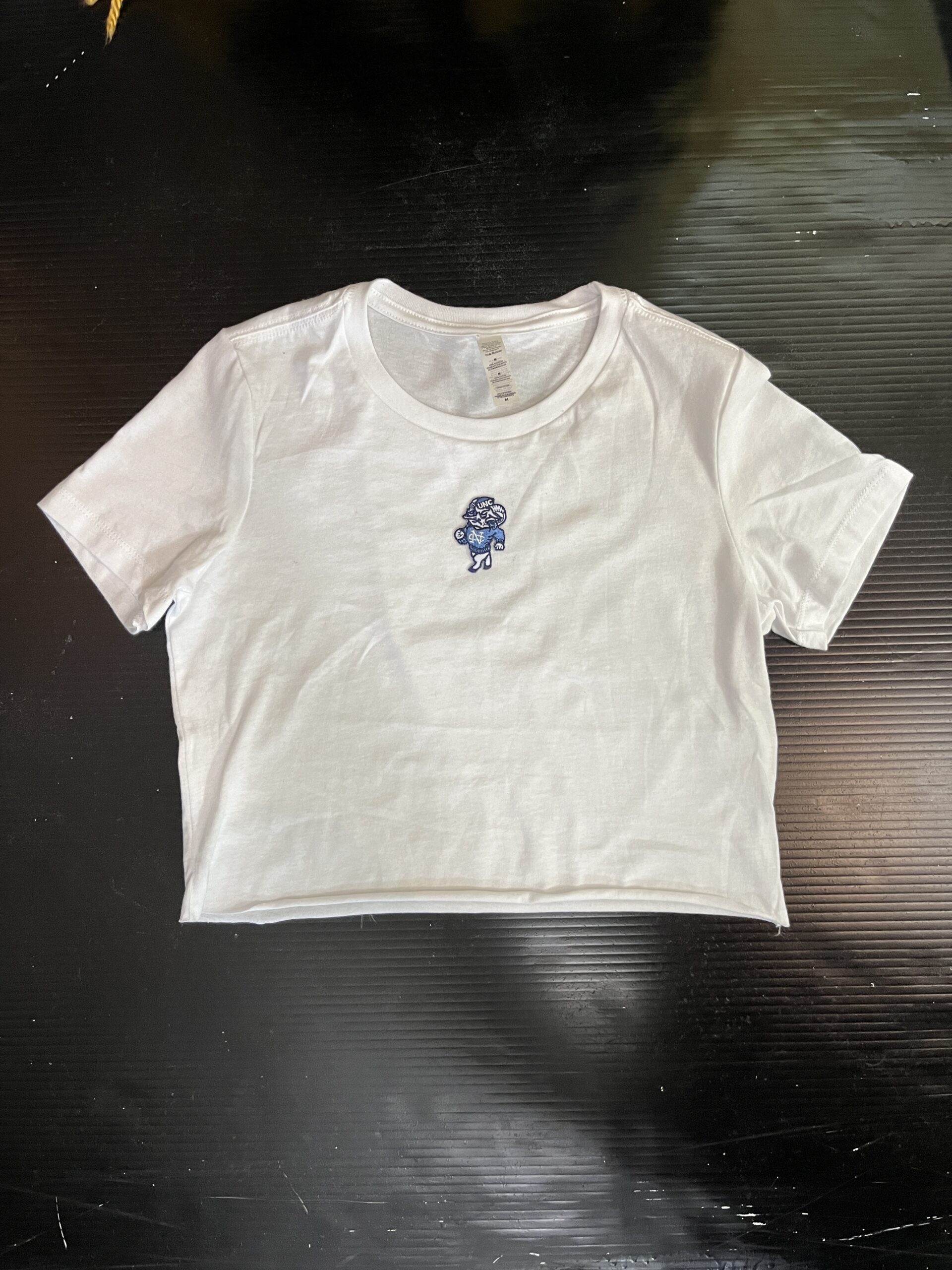 100% cotton baby tee with college logo cropped to 14 inches (raw cut)
