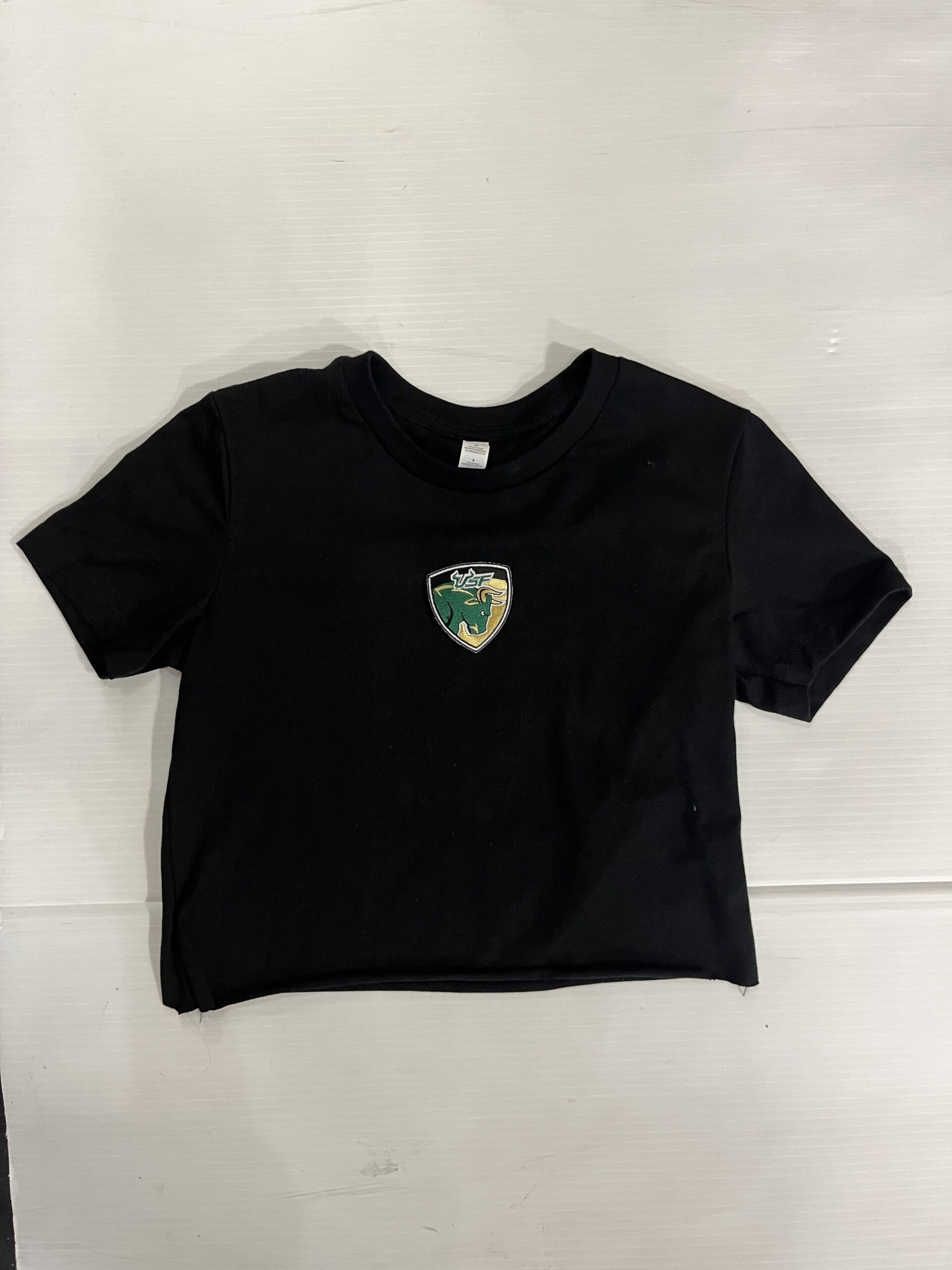 100% cotton baby tee with college logo cropped to 14 inches (raw cut)