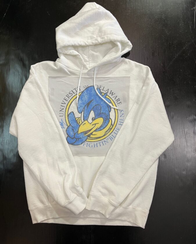 100% cotton baby tee with college logo cropped to 14 inches (raw cut)