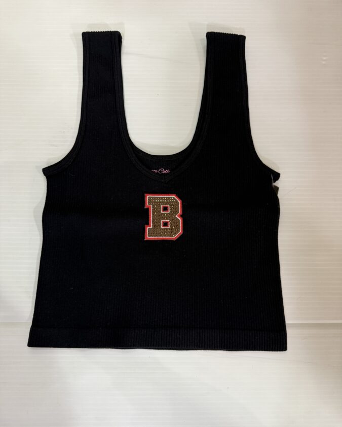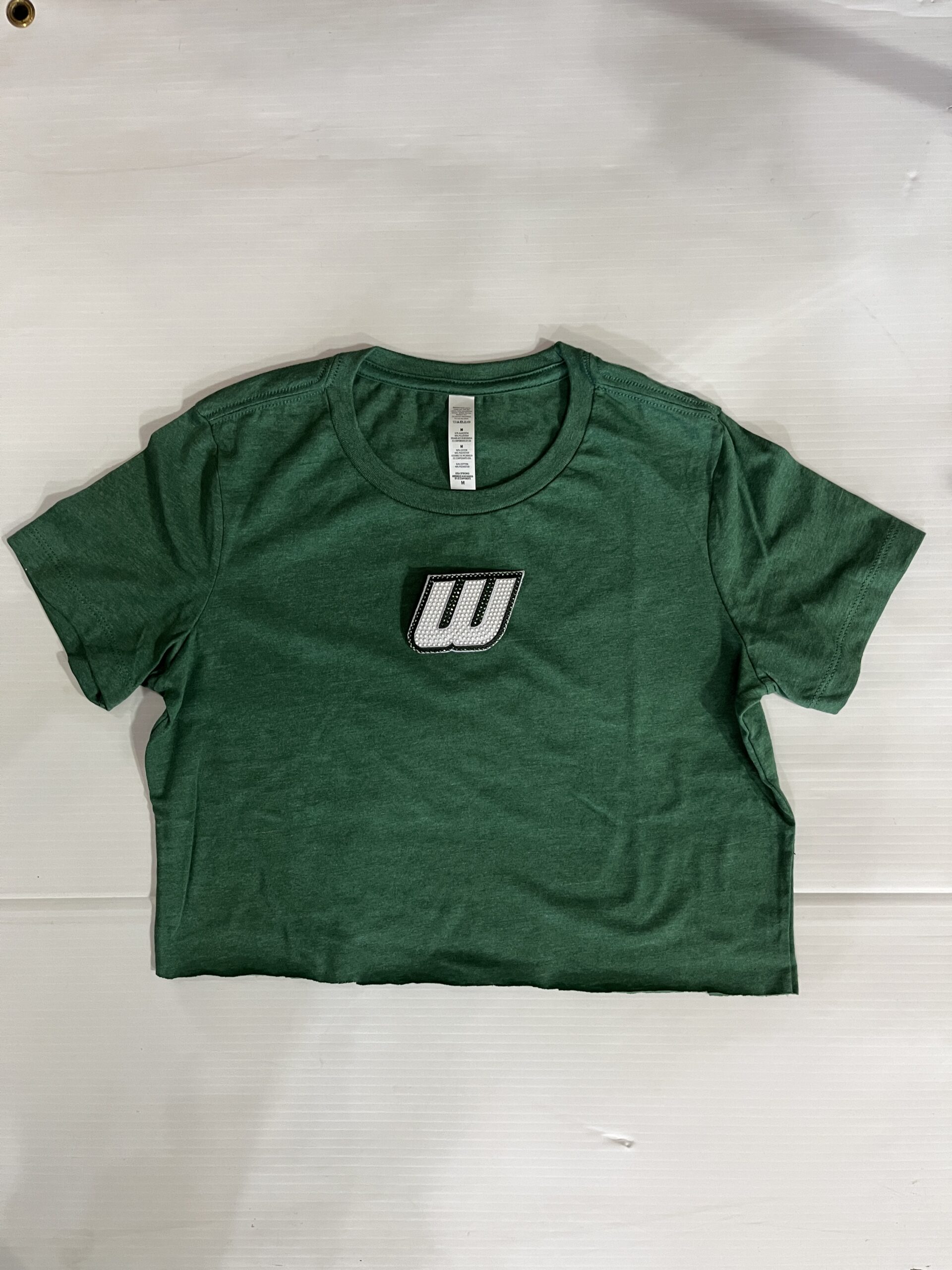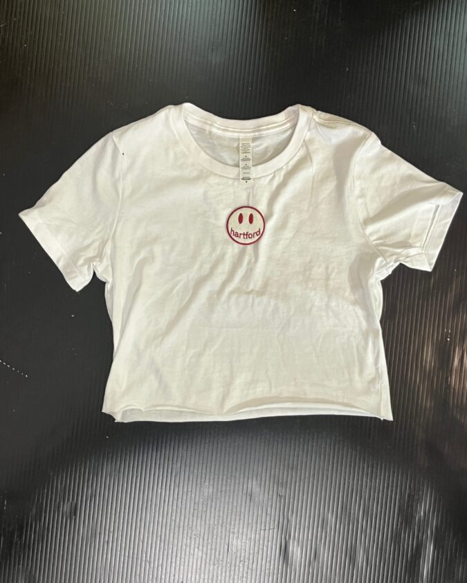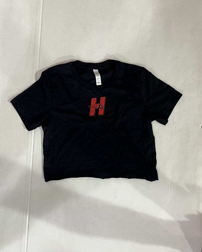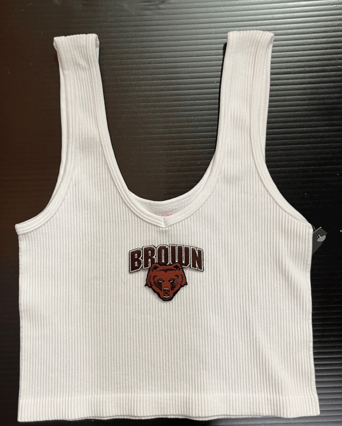 100% cotton baby tee with college logo cropped to 14 inches (raw cut)
