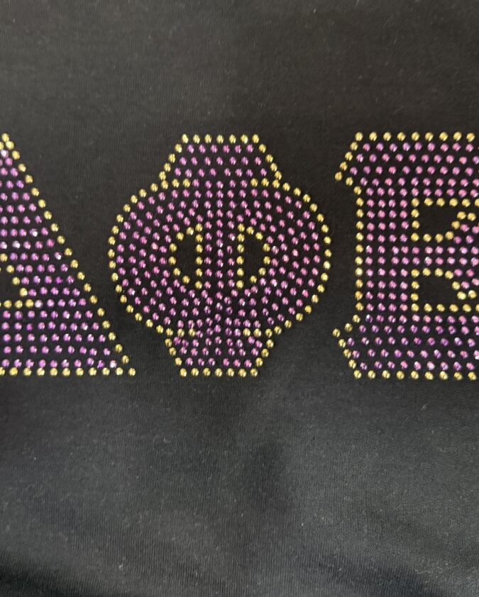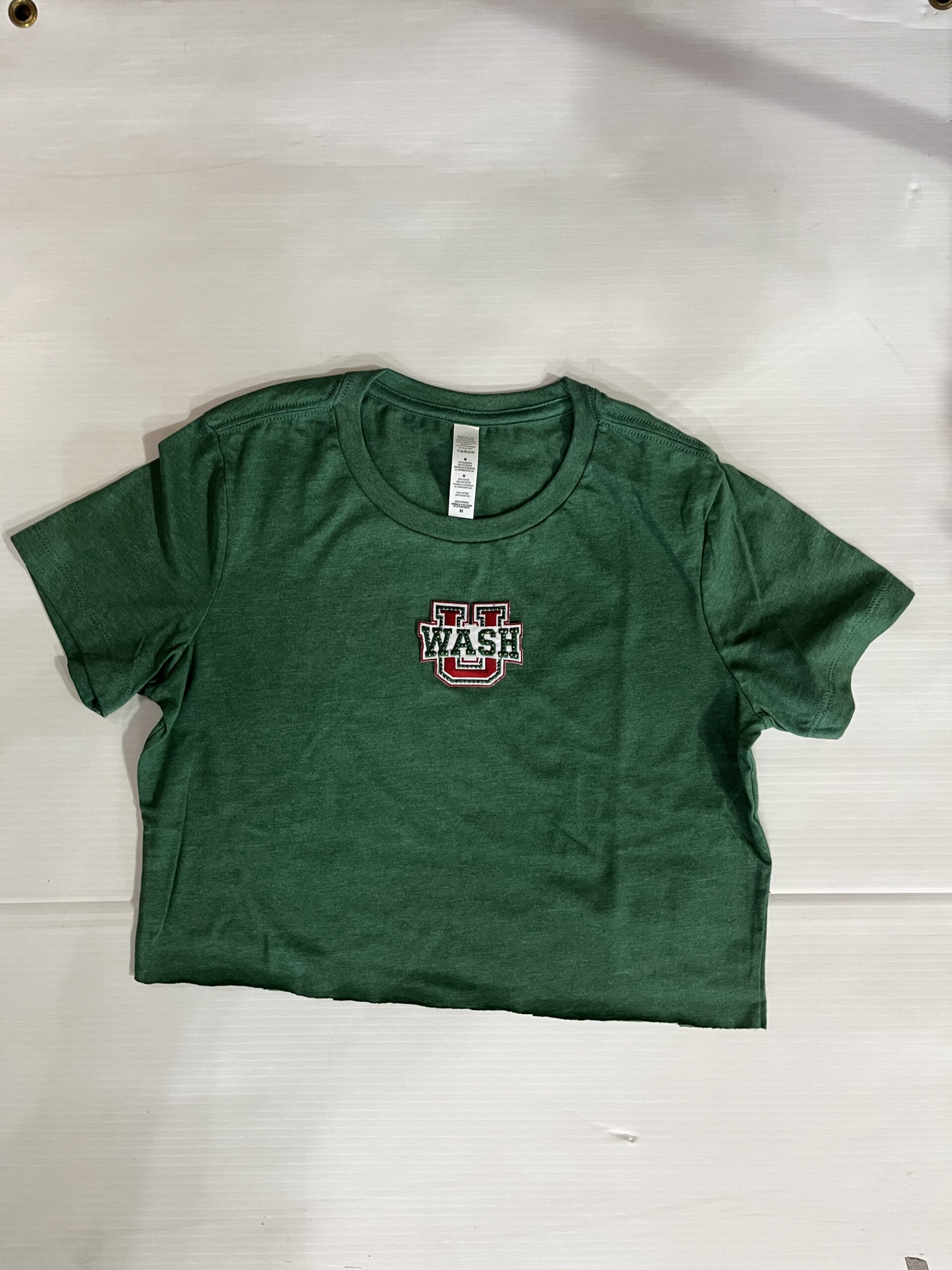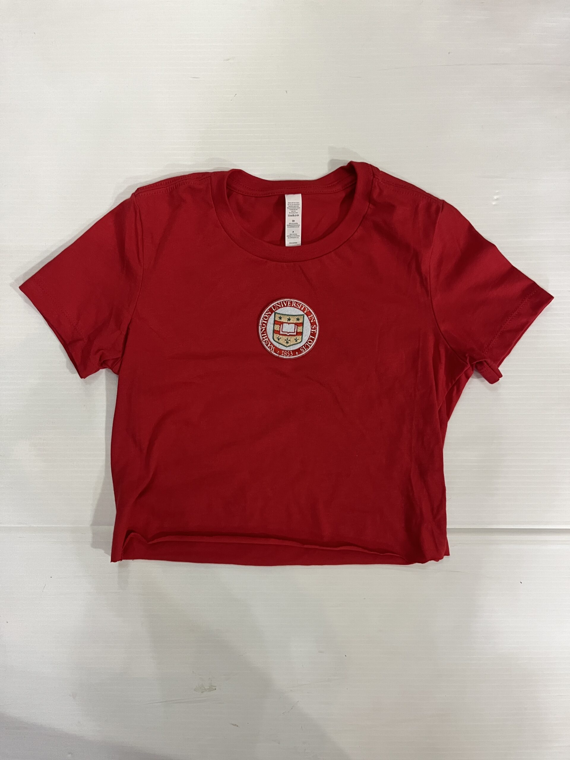 100% cotton baby tee with college logo cropped to 14 inches (raw cut)