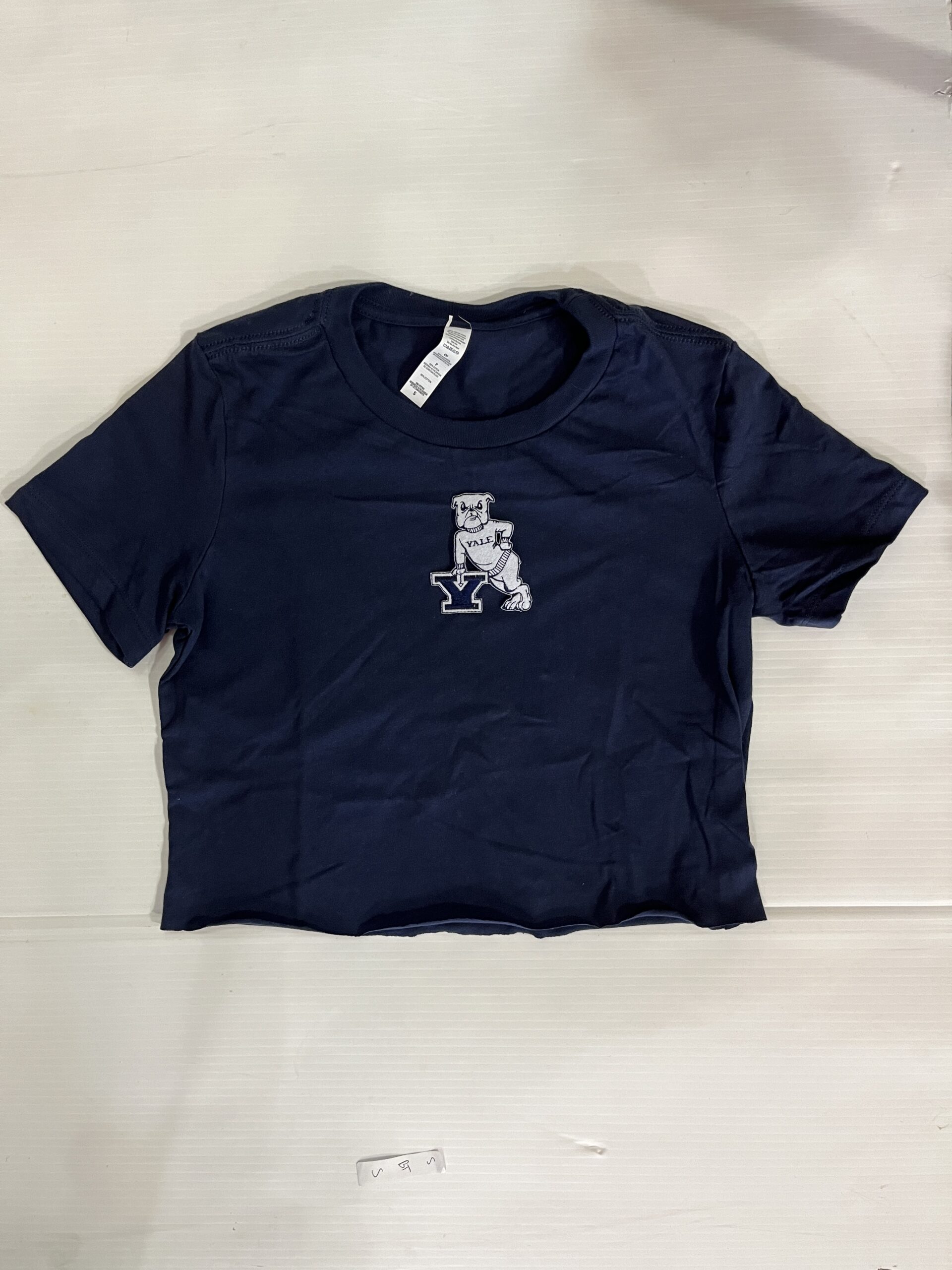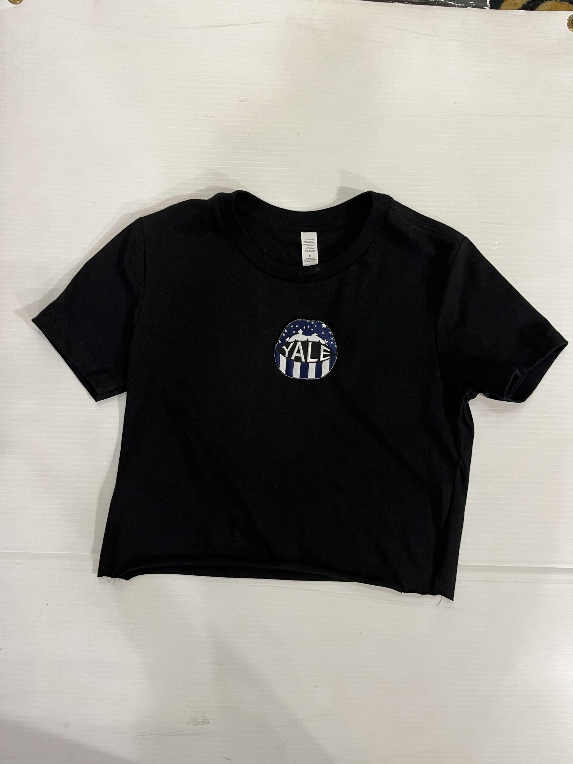 100% cotton baby tee with college logo cropped to 14 inches (raw cut)