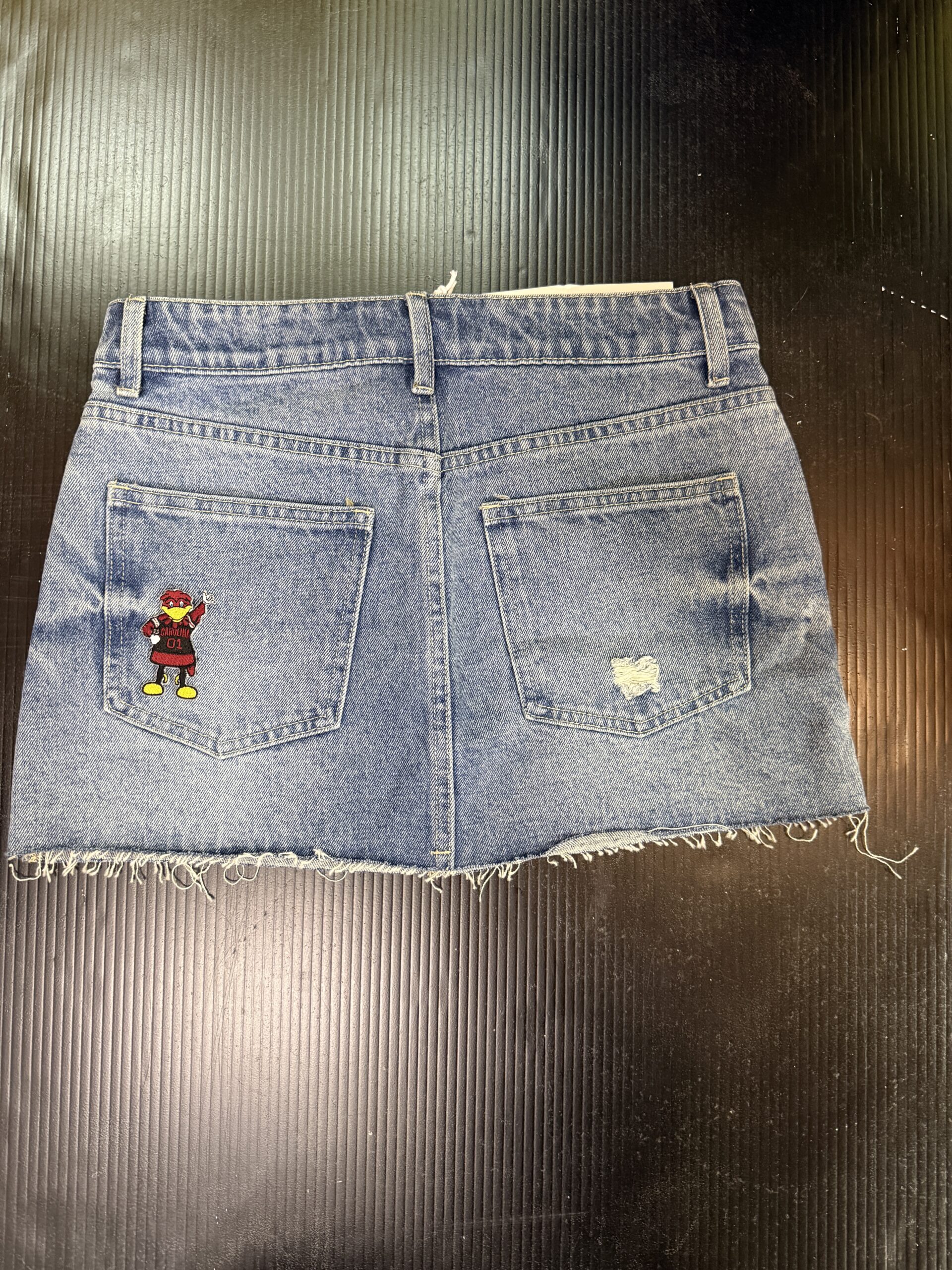12 inch denim raw cut mini skirt with logo detail on front and back-100% cotton.