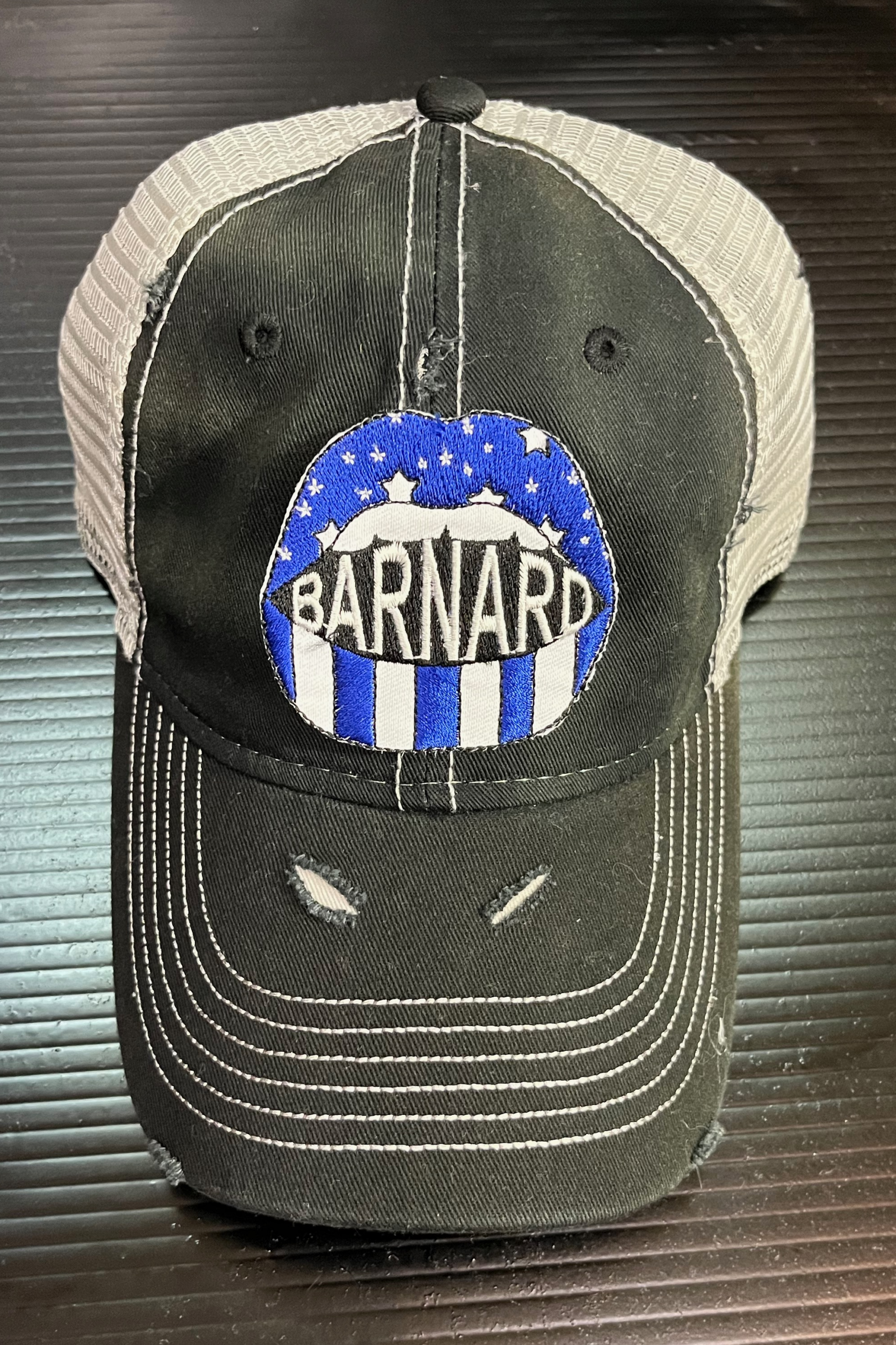 Deconstructed vintage unisex trucker hat with rips and Barnard logos