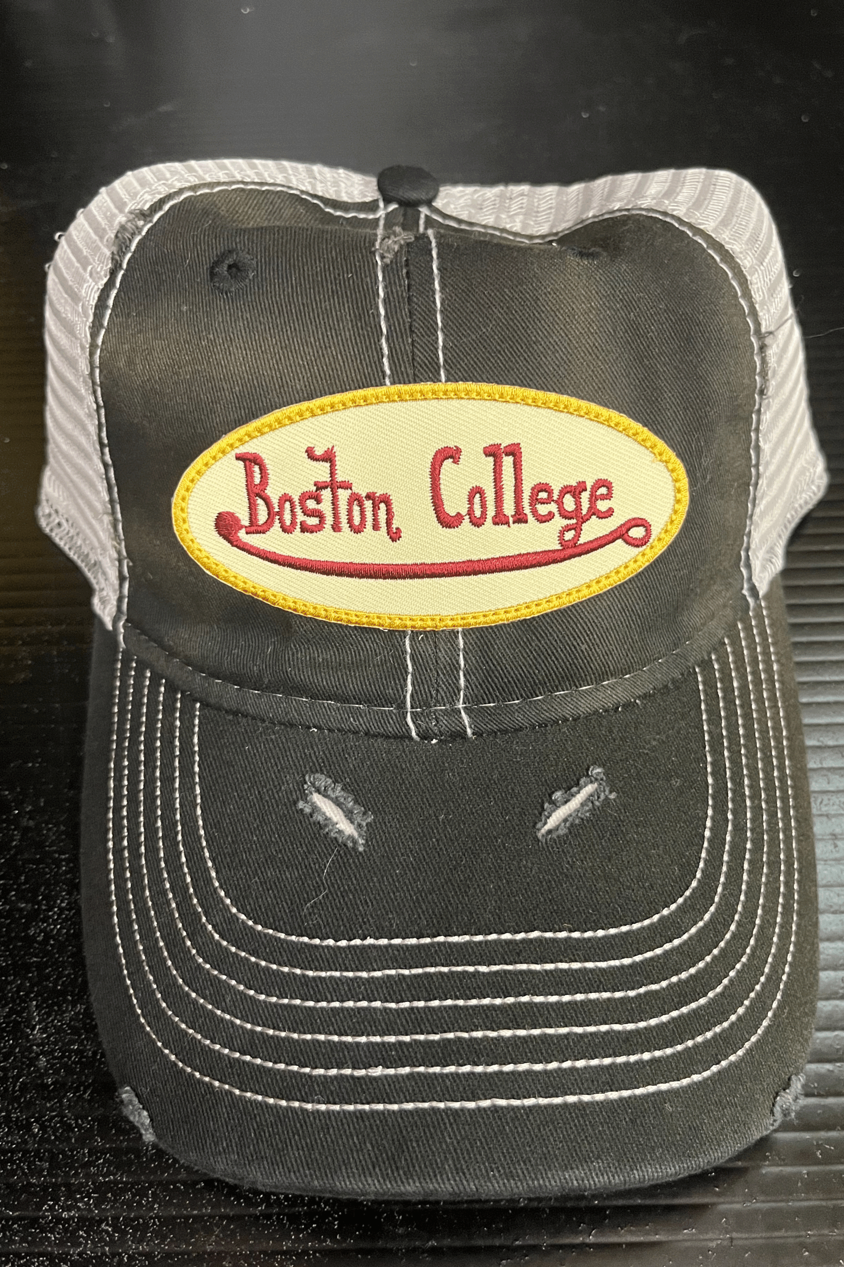 Deconstructed vintage unisex trucker hat with rips and college logo